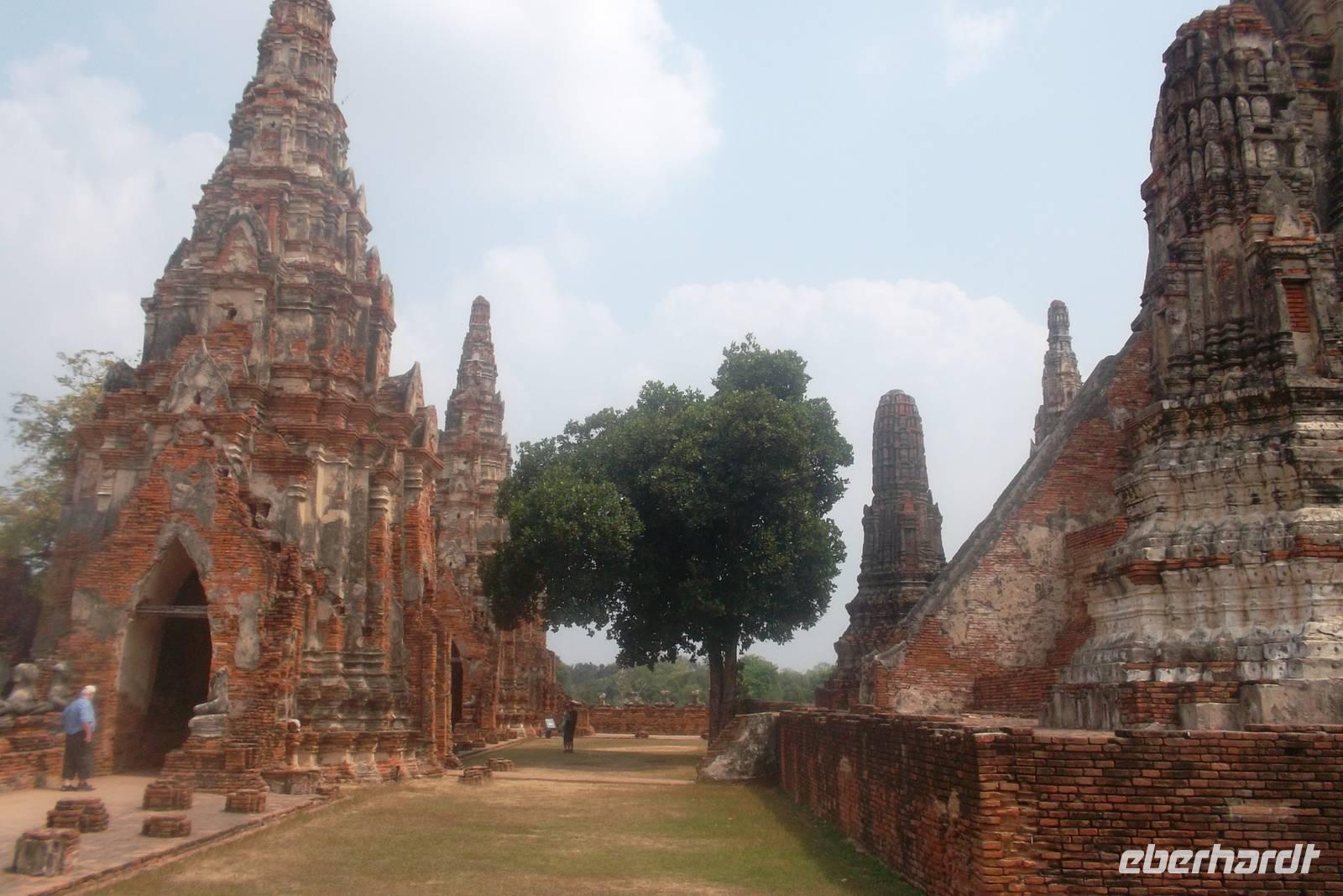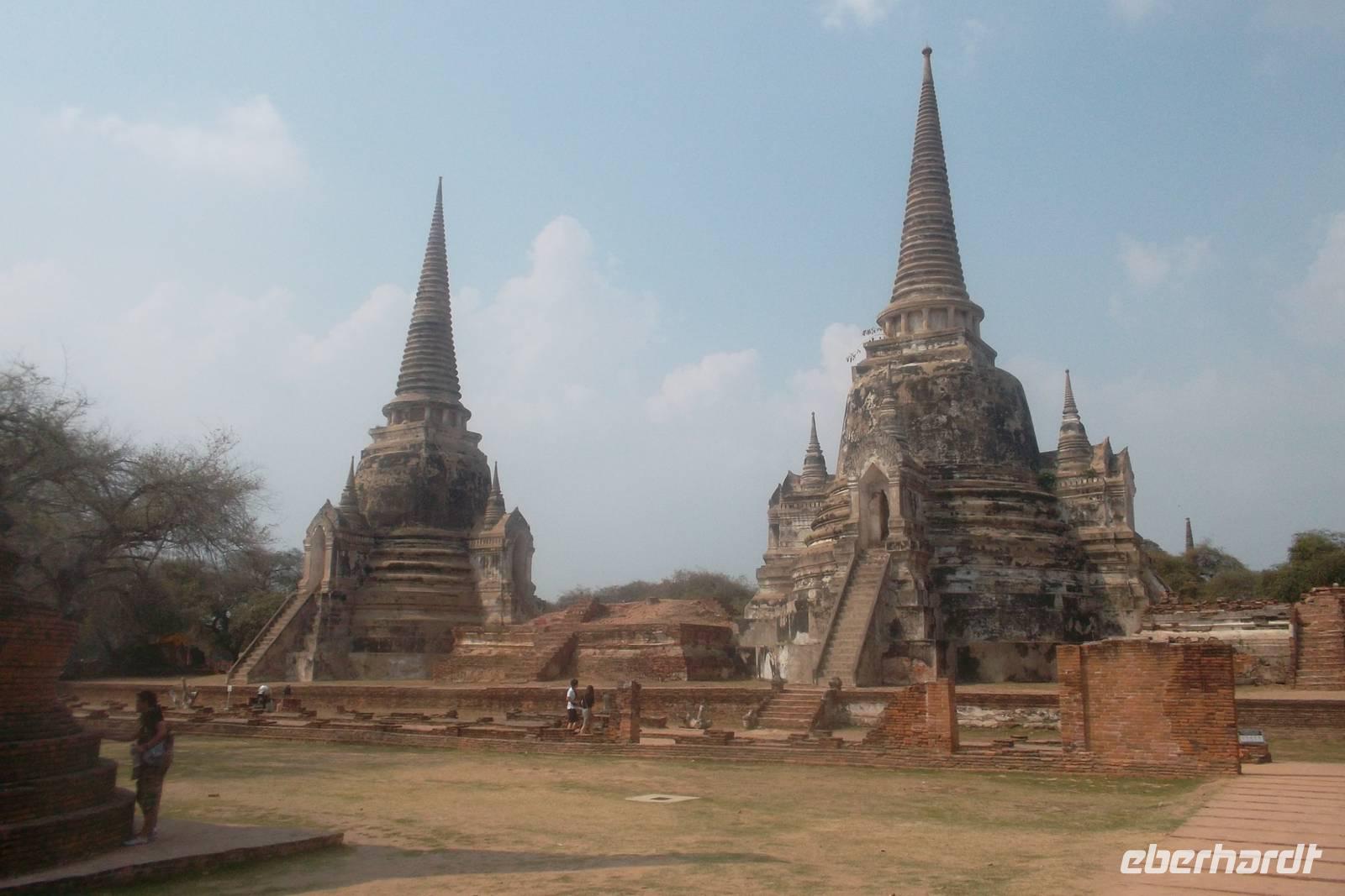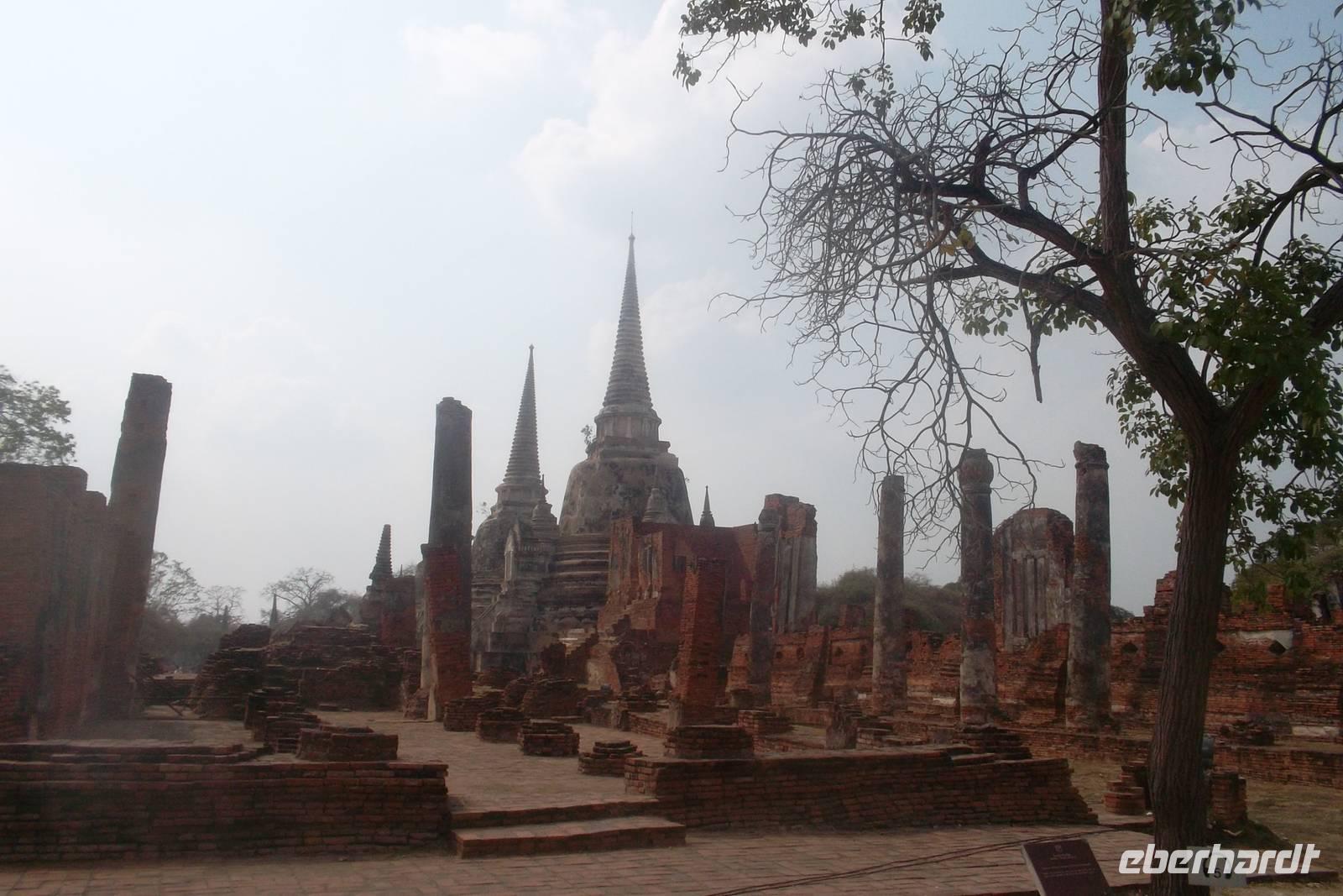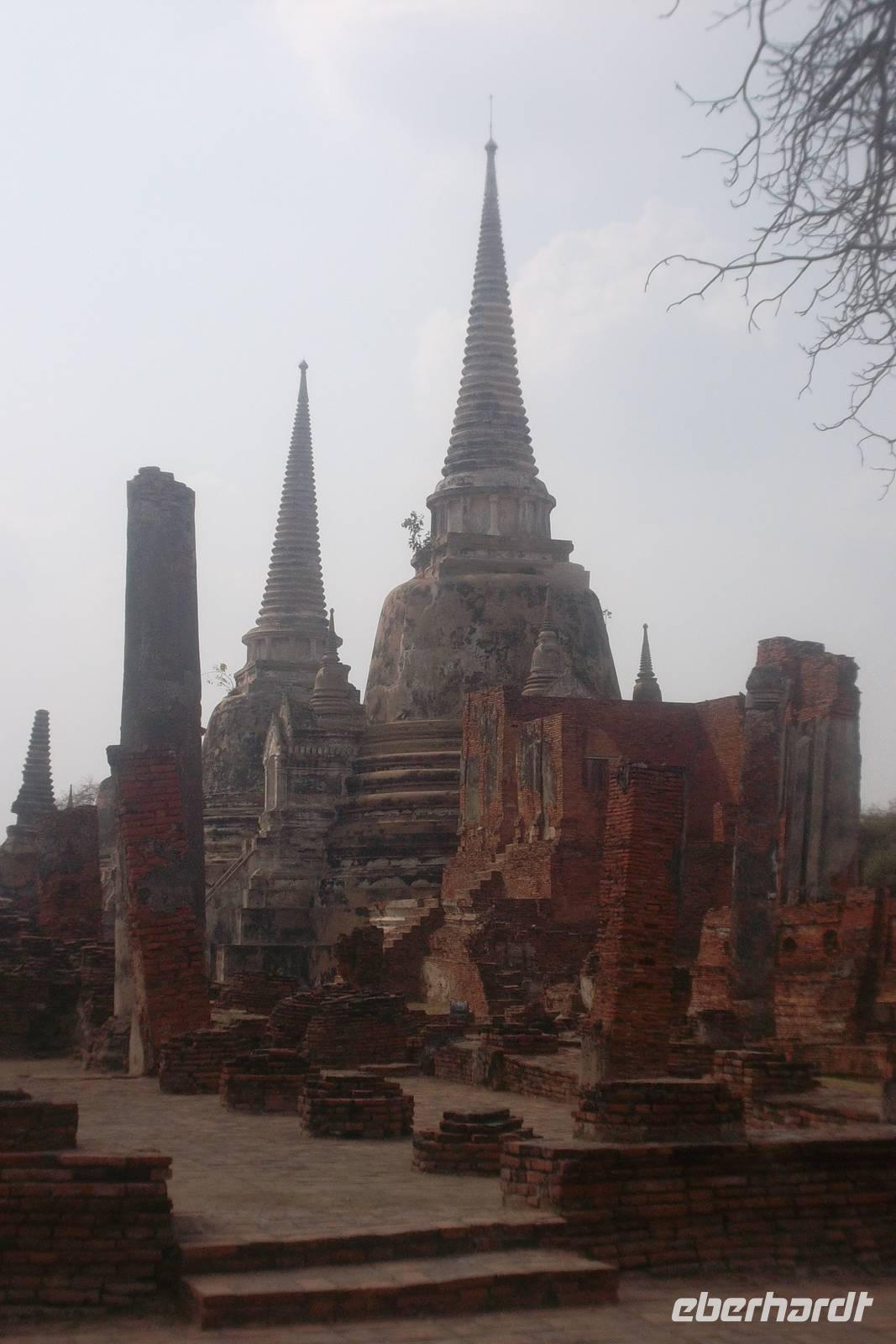 Der Wat Chai Watthanaram nahedem Westufer des Chao Phraya-Flusses ähnelt im Prinzip den Khhmer-Anlagen von Angkor Wat. Die zweitgrößte Anlage im archäologischen Park ist noch besonders gut erhalten und wird namentlich als besonderes UNESCO-Weltkulturerbe erwähnt. Bei der gewaltigen, um 1630 errichteten Anlage gruppieren sich acht Chedis um eine zentrale Plattform mit einem 32 m hohen Phrang im Khmer-Stil. Umgänge, Nischen und Schreine waren mit zahlreichen Buddhafiguren gefüllt. Zwar hatte man viele der bei Vernichtung Ayutthayas unzerstört gebliebenen Buddhafiguren später in Einzelteilen an Antiqitätensammler verkauft, aber die im Ruinenkomplex verbliebenen Reste sind noch höchst eindrucksvoll. Nach einer kleinen Rundfahrt im archäologischen Park und dem Mittagessen suchten wir den größten Ruinenplatz auf, das Zentrum des alten Ayutthaya. Wat Phra Si Sanphet mit seinen immer noch erhaltenen drei riesigen weißen glockenförmigen Stupas im Stil aus Sri Lanka ist heute so etwas wie ein Wahrzeichen der alten Hauptstadt. Seit deren Gründung stand hier der Königspalast, die Stelle blieb auch erhalten, als hier das buddhistische Hauptheiligtum errichtet und der Königspalast in die Nachbarschaft verlegt wurde. Neben den zentralen Chedis wurde ein Vihara erbaut, eine Zentralhalle als Aufstellungsort Buddhas, oft umgeben von Mönchszellen.