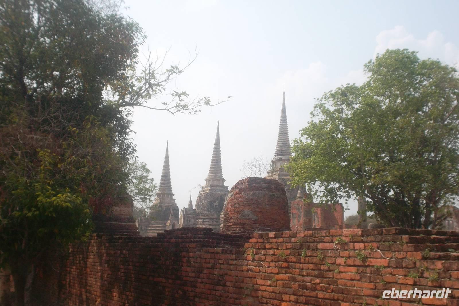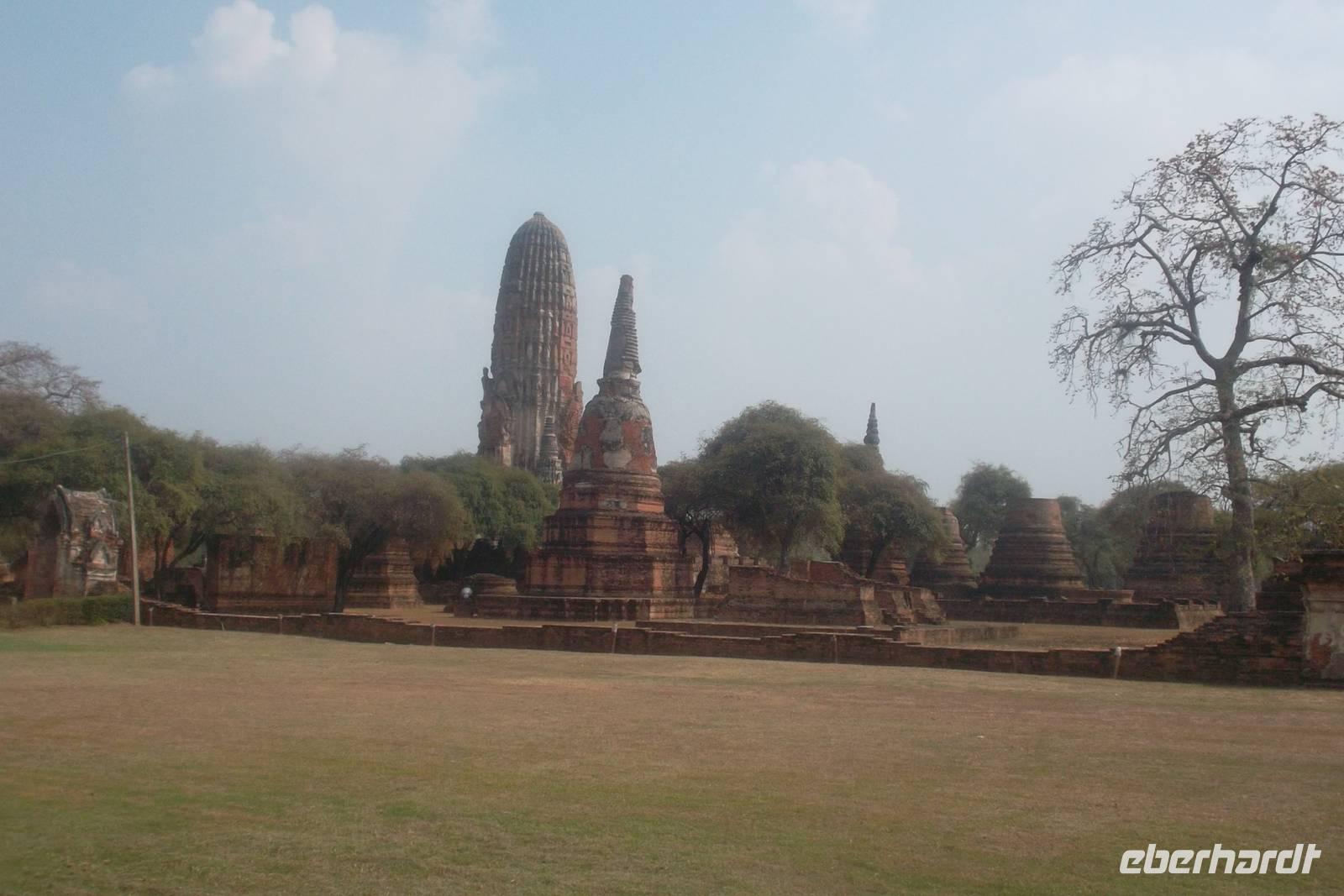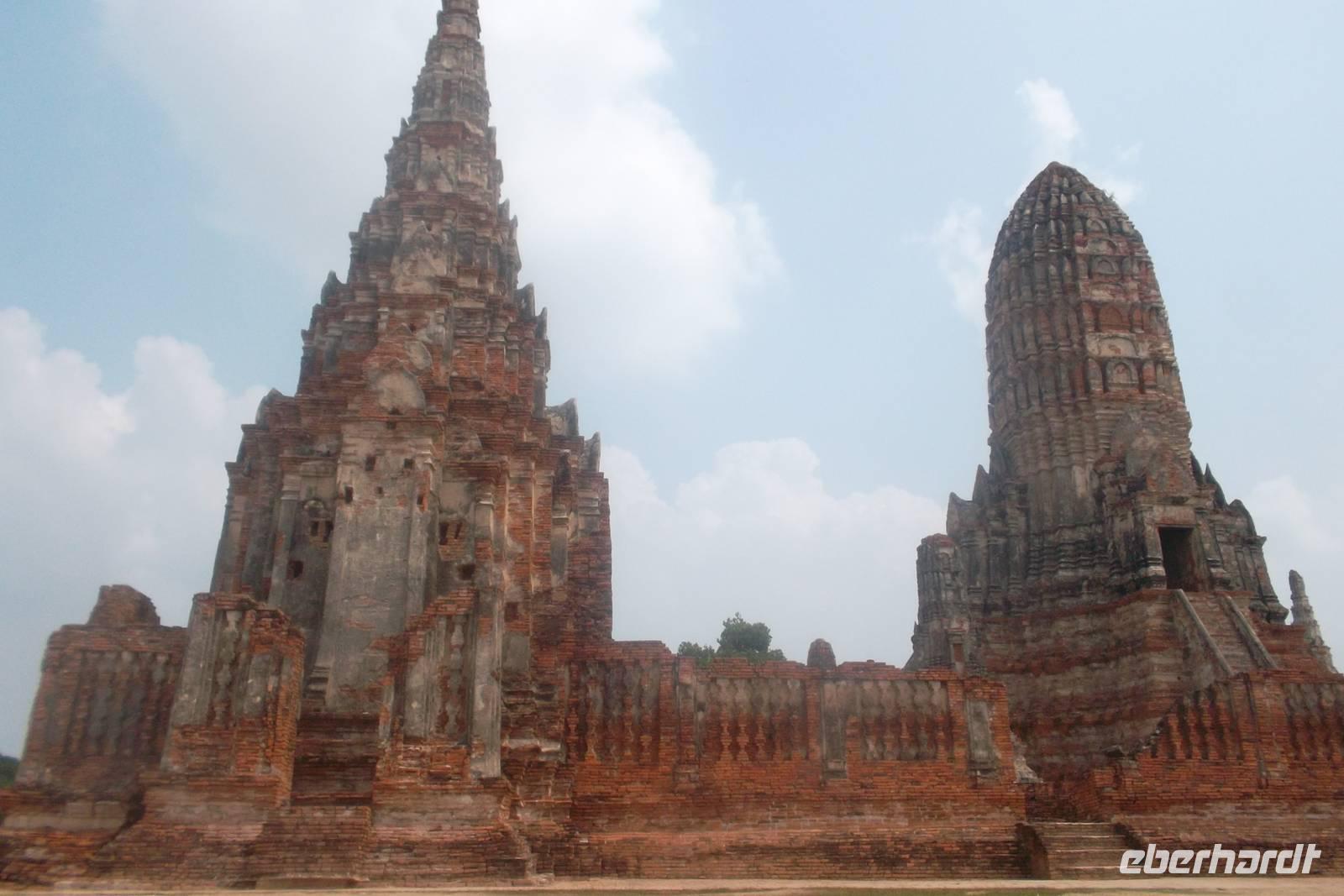 Der Wat Chai Watthanaram nahedem Westufer des Chao Phraya-Flusses ähnelt im Prinzip den Khhmer-Anlagen von Angkor Wat. Die zweitgrößte Anlage im archäologischen Park ist noch besonders gut erhalten und wird namentlich als besonderes UNESCO-Weltkulturerbe erwähnt. Bei der gewaltigen, um 1630 errichteten Anlage gruppieren sich acht Chedis um eine zentrale Plattform mit einem 32 m hohen Phrang im Khmer-Stil. Umgänge, Nischen und Schreine waren mit zahlreichen Buddhafiguren gefüllt. Zwar hatte man viele der bei Vernichtung Ayutthayas unzerstört gebliebenen Buddhafiguren später in Einzelteilen an Antiqitätensammler verkauft, aber die im Ruinenkomplex verbliebenen Reste sind noch höchst eindrucksvoll. Nach einer kleinen Rundfahrt im archäologischen Park und dem Mittagessen suchten wir den größten Ruinenplatz auf, das Zentrum des alten Ayutthaya. Wat Phra Si Sanphet mit seinen immer noch erhaltenen drei riesigen weißen glockenförmigen Stupas im Stil aus Sri Lanka ist heute so etwas wie ein Wahrzeichen der alten Hauptstadt. Seit deren Gründung stand hier der Königspalast, die Stelle blieb auch erhalten, als hier das buddhistische Hauptheiligtum errichtet und der Königspalast in die Nachbarschaft verlegt wurde. Neben den zentralen Chedis wurde ein Vihara erbaut, eine Zentralhalle als Aufstellungsort Buddhas, oft umgeben von Mönchszellen.