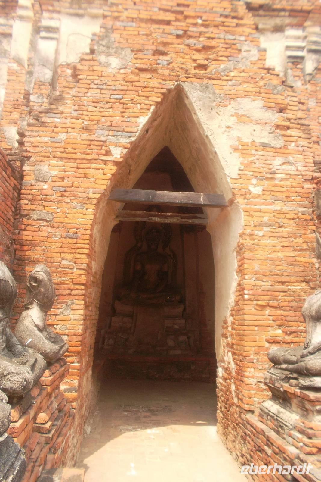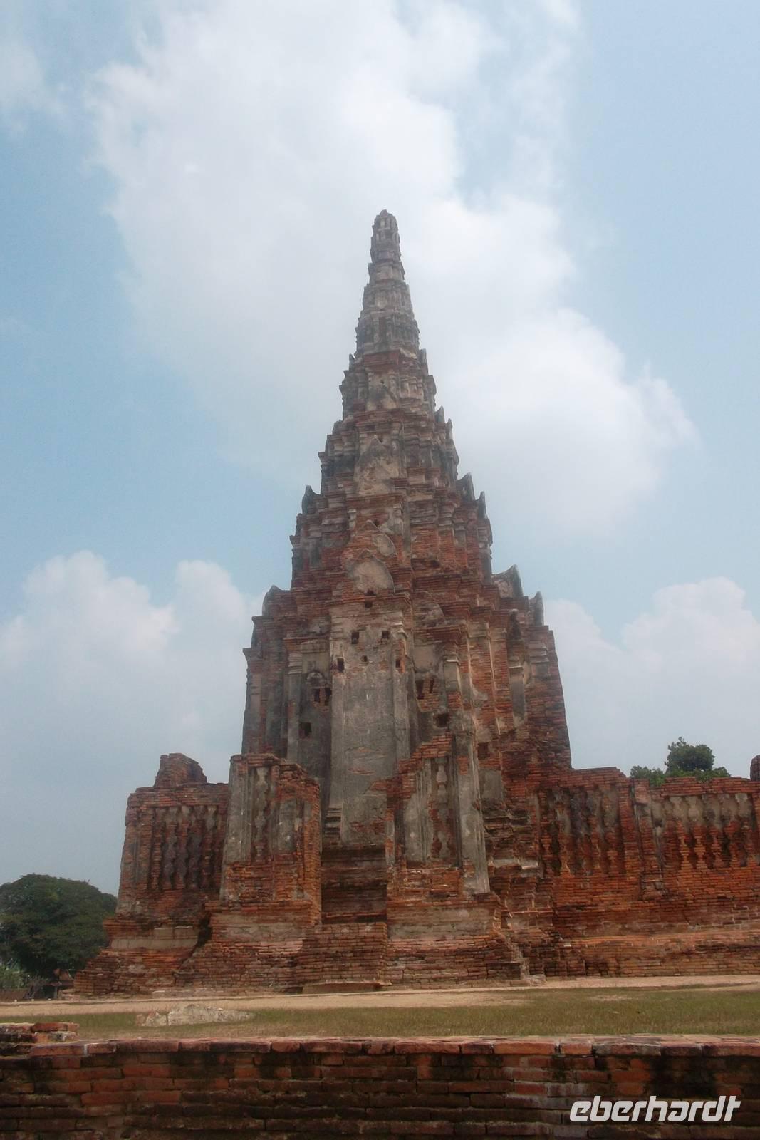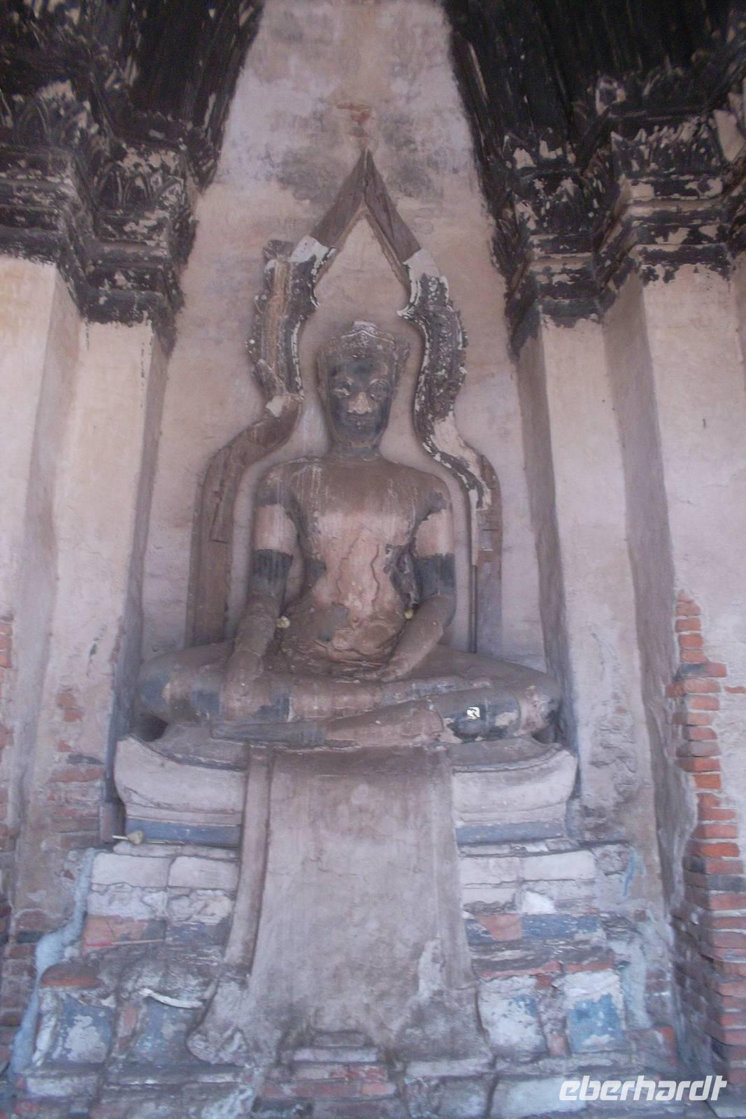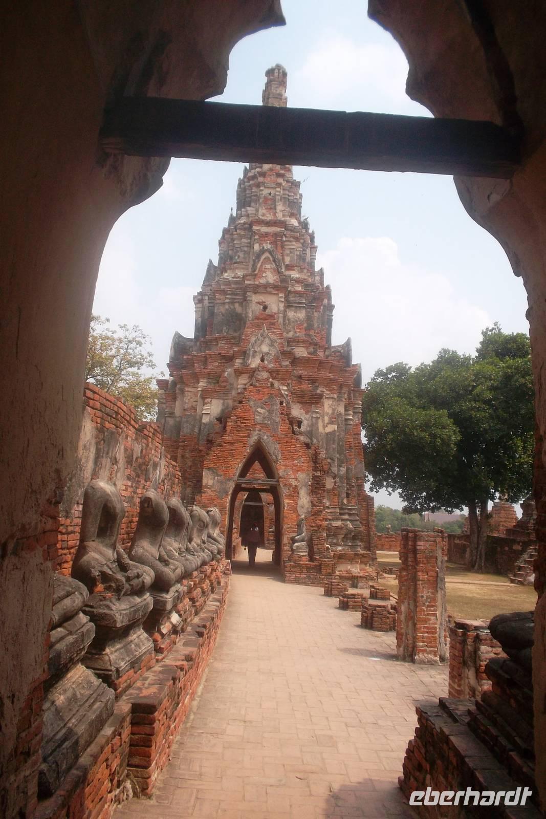 Der Wat Chai Watthanaram nahedem Westufer des Chao Phraya-Flusses ähnelt im Prinzip den Khhmer-Anlagen von Angkor Wat. Die zweitgrößte Anlage im archäologischen Park ist noch besonders gut erhalten und wird namentlich als besonderes UNESCO-Weltkulturerbe erwähnt. Bei der gewaltigen, um 1630 errichteten Anlage gruppieren sich acht Chedis um eine zentrale Plattform mit einem 32 m hohen Phrang im Khmer-Stil. Umgänge, Nischen und Schreine waren mit zahlreichen Buddhafiguren gefüllt. Zwar hatte man viele der bei Vernichtung Ayutthayas unzerstört gebliebenen Buddhafiguren später in Einzelteilen an Antiqitätensammler verkauft, aber die im Ruinenkomplex verbliebenen Reste sind noch höchst eindrucksvoll. Nach einer kleinen Rundfahrt im archäologischen Park und dem Mittagessen suchten wir den größten Ruinenplatz auf, das Zentrum des alten Ayutthaya. Wat Phra Si Sanphet mit seinen immer noch erhaltenen drei riesigen weißen glockenförmigen Stupas im Stil aus Sri Lanka ist heute so etwas wie ein Wahrzeichen der alten Hauptstadt. Seit deren Gründung stand hier der Königspalast, die Stelle blieb auch erhalten, als hier das buddhistische Hauptheiligtum errichtet und der Königspalast in die Nachbarschaft verlegt wurde. Neben den zentralen Chedis wurde ein Vihara erbaut, eine Zentralhalle als Aufstellungsort Buddhas, oft umgeben von Mönchszellen.