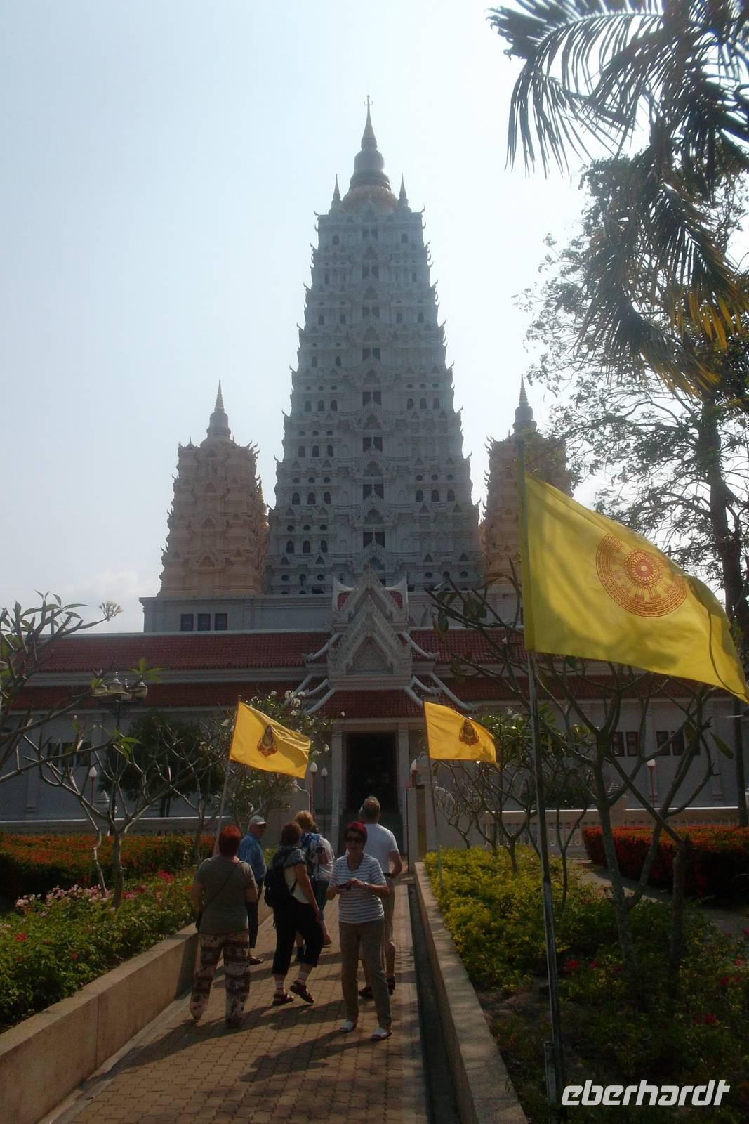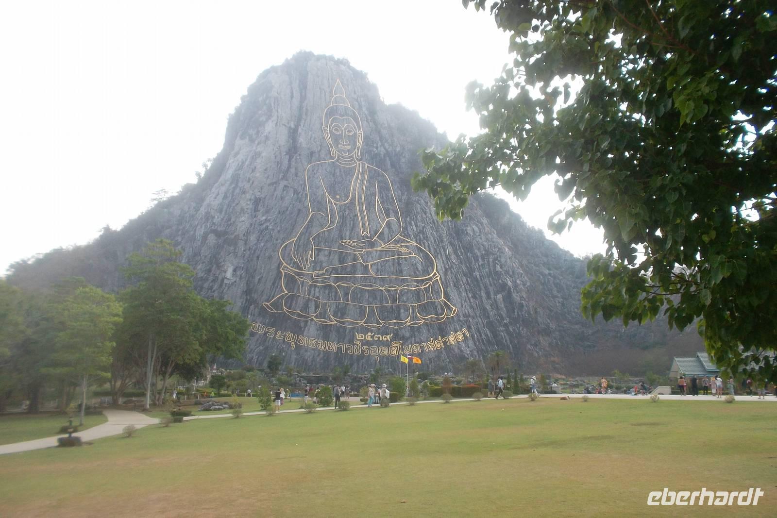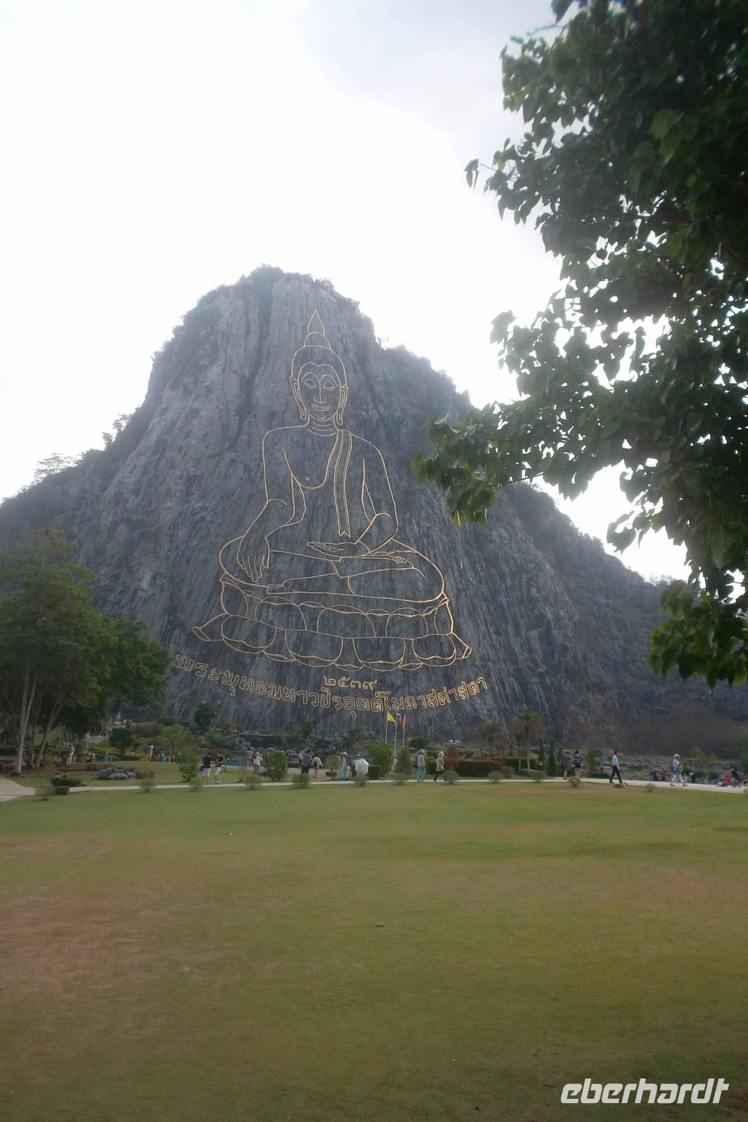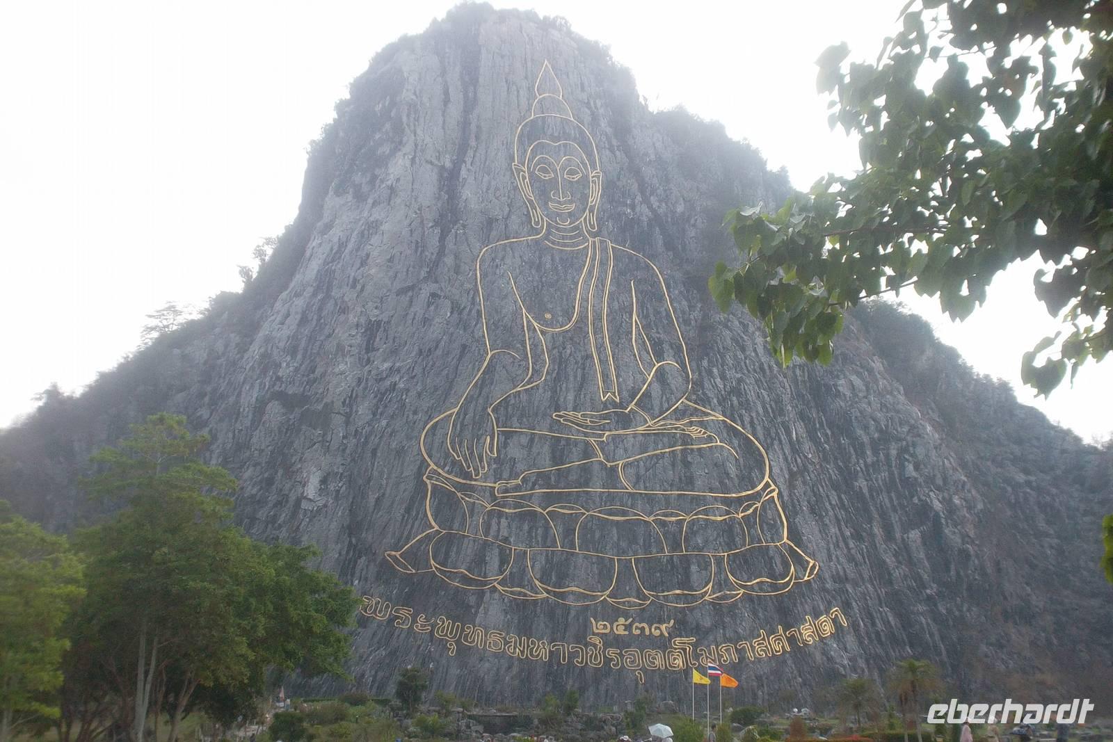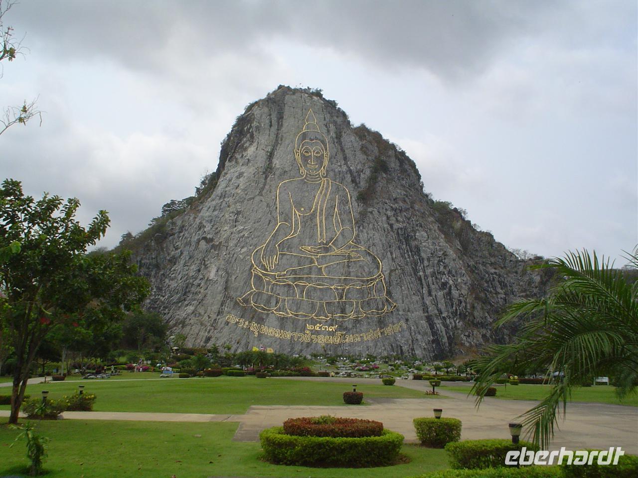 Ein besonderes Erlebnis wartete danach auf uns: am Meeresufer unweit von Pattaya steht der erlesene „Tempel der Wahrheit", der für alle Gäste äußerst interessant und überaus fotogen war. Der „Prasat Satchatham" ist der größte Holz- und Schnitztempel der Welt und befindet sich seit 1981 in Bau. Zwar ist seine Fertigstellung 2025 geplant, aber da der 105 m hohe Gebäudekomplex, dessen Aussen- und Innenregionen mit phantastischen Schnitzereien verziert sind. die mythologische Figuren der Thai-, Khmer-, laotischen und chinesischen Kultur zeigen, immer wieder erweitert wird, kann es durchaus länger dauern. Nach Besuch dieses Wunderwerkes der Schnitzkunst nahmen wir unser Mittagessen in einem Restaurant an den schwimmenden Märkten ein fuhren schließlich noch zu einem Fotostopp an den Berg Kao Chin Chan. Er ist weithin bekannt für sein monumentales Buddhabildnis. Nur von einem einzigen Ort aus sind die kompletten Umrisse des erst vor wenigen Jahren in die geglättete Bergflanke eingeritzten goldenen Buddha mit der imposanten Höhe von 130 und der Breite von 70 m zu erkennen - es soll sich um das weltweit größte Monument des Buddhismus handeln!