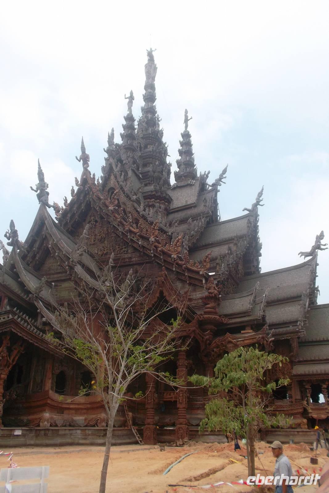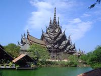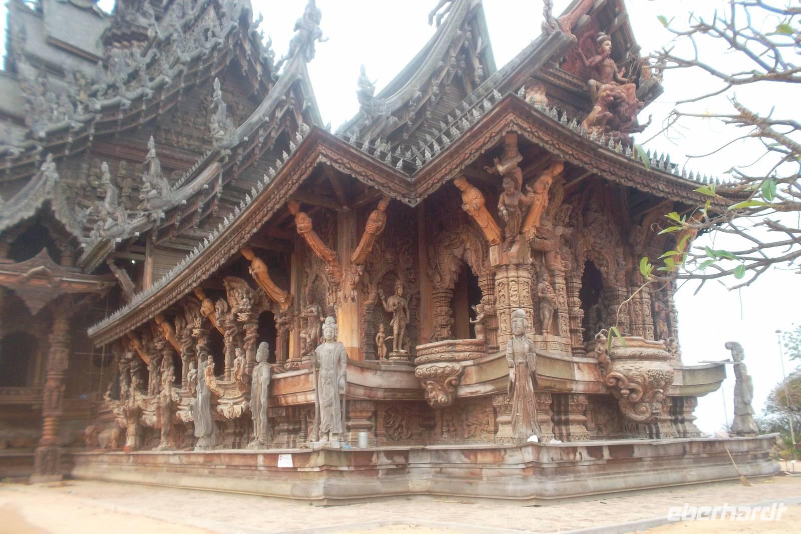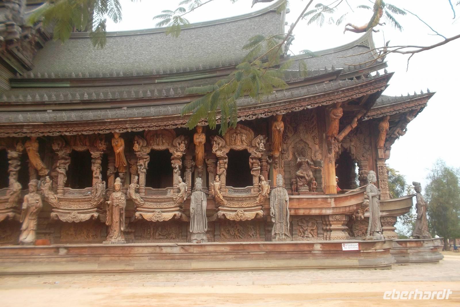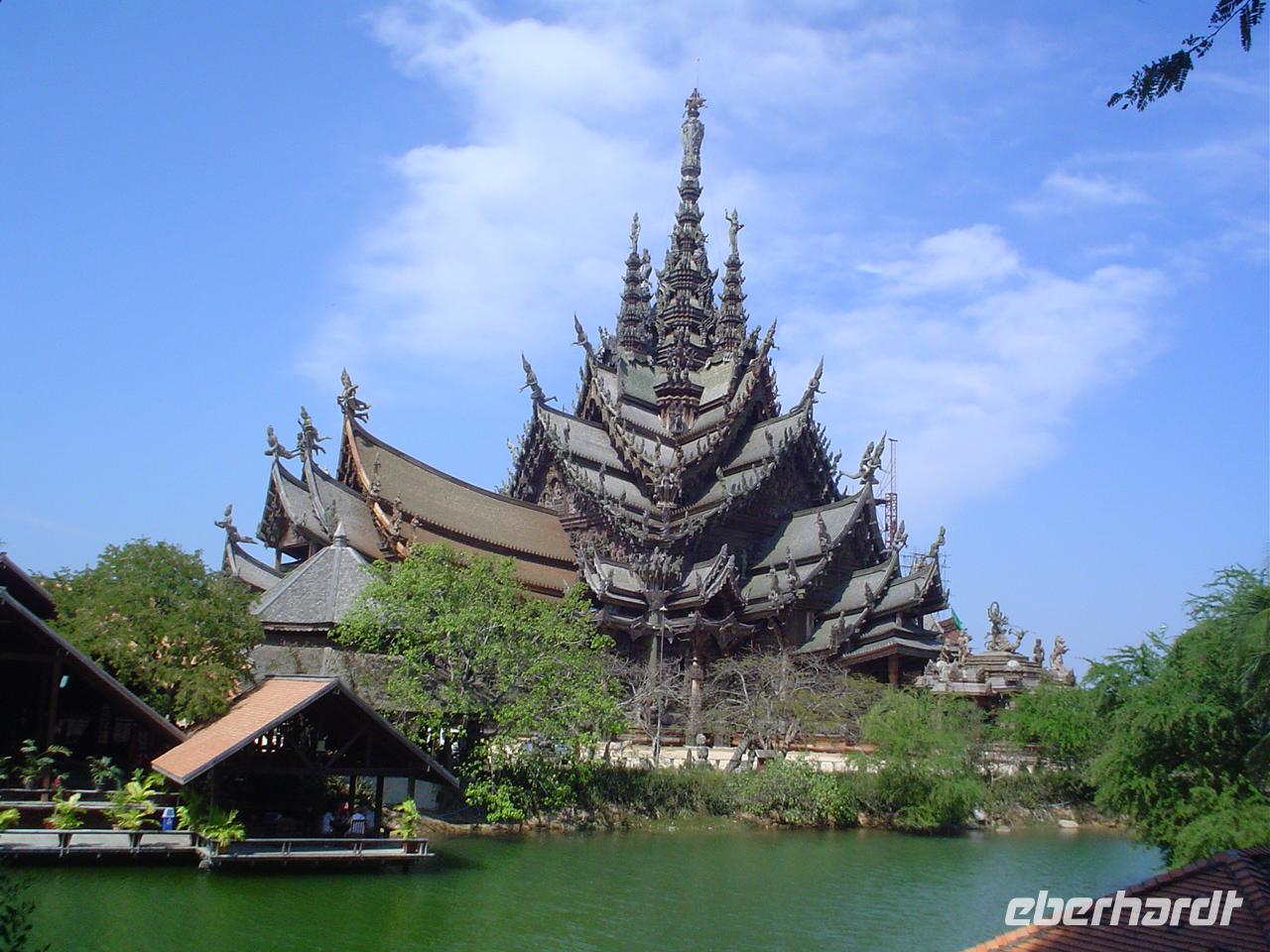 Ein besonderes Erlebnis wartete danach auf uns: am Meeresufer unweit von Pattaya steht der erlesene „Tempel der Wahrheit", der für alle Gäste äußerst interessant und überaus fotogen war. Der „Prasat Satchatham" ist der größte Holz- und Schnitztempel der Welt und befindet sich seit 1981 in Bau. Zwar ist seine Fertigstellung 2025 geplant, aber da der 105 m hohe Gebäudekomplex, dessen Aussen- und Innenregionen mit phantastischen Schnitzereien verziert sind. die mythologische Figuren der Thai-, Khmer-, laotischen und chinesischen Kultur zeigen, immer wieder erweitert wird, kann es durchaus länger dauern. Nach Besuch dieses Wunderwerkes der Schnitzkunst nahmen wir unser Mittagessen in einem Restaurant an den schwimmenden Märkten ein fuhren schließlich noch zu einem Fotostopp an den Berg Kao Chin Chan. Er ist weithin bekannt für sein monumentales Buddhabildnis. Nur von einem einzigen Ort aus sind die kompletten Umrisse des erst vor wenigen Jahren in die geglättete Bergflanke eingeritzten goldenen Buddha mit der imposanten Höhe von 130 und der Breite von 70 m zu erkennen - es soll sich um das weltweit größte Monument des Buddhismus handeln!