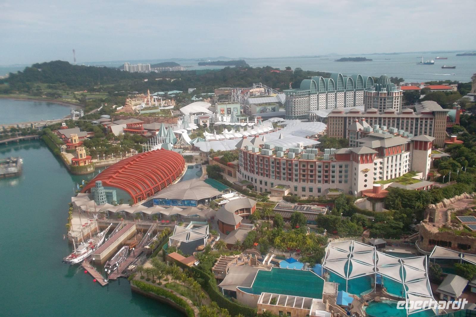 Durch Landgewinnung ist das Singapur vorgelagerte Inselchen auf über 5 km² Fläche angewachsen und beherbergt heute jede Menge an Attraktionen. Mehrere Tage könne man hier verbringen, wirbt das Tourismusbüro Singapurs. Die Insel ist durch einen Dammweg - den auch wir mit unserem Bus benutzten, durch eine Einschienenbahn und eine Seilbahn mit dem Stadtstaat verbunden. Der höchste Punkt der Insel, Mount Imbiah, beherbergte früher ein britisches Fort und lange Zeit wurde Sentosa, das damals noch anders hieß, als Militärstützpunkt genutzt. Drei Forts und eine Geschützstellung wurden hier nach und nach errichtet - bis auf ein kurzes Intermezzo im zweiten Weltkrieg als japanisches Kriegsgefangenenlager blieb es britisches Militärgebiet bis 1967, als es an Singapur übergeben wurde. Seit 1972 dann erhielt die Insel ihren jetzigen Namen - Sentosa bedeutet etwa „Frieden" auf Malaiisch - und wurde zu einem Erholungs- und Vergnügungsparadies mit Hotels, Badestränden und jeder Menge Attraktionen.