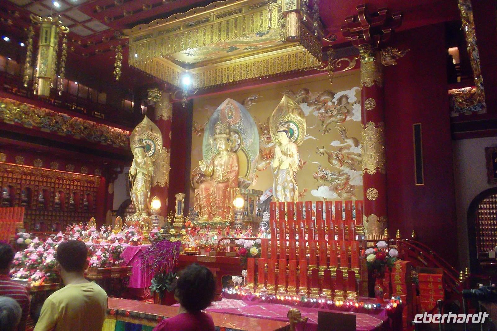 Manche sagen, er sei die interessanteste Sehenswürdigkeit Singapurs. Auf jeden Fall ist er einer der unbestrittenen Höhepunkte eines Singapur-Aufenthalts: der Besuch des Orchideengartens. Schon 1822, drei Jahre nach der „britischen Gründung" Singapurs, hatte der heute noch verehrte Gründer des Stadtstaates, Sir Thomas Stamford Raffles - selbst Naturforscher - in der Niederlassung einen Botanischen Garten gegründet. Spätere Neugründungen, Erweiterungen und Einbeziehung ehemaliger Plantagen haben dem heutigen Singapur einen der größten Gärten dieser Art in Asien beschert - und der „Ingwer-Garten" - der fast alle Arten dieser Pflanzenspezies enthält sowie die spektakuläre Orchideensammlung sind die jeweils größten in Asien. Mehr als 1000 Arten der wundervollen Blütenpflanzen sind hier zu finden, einige davon Originalzüchtungen aus Singapur. Später erreichten wir während unserer Stadtrundfahrt die quirligen Viertel von Little India und Chinatown. Während ersteres - wie der Name schon sagt, hauptsächlich von indisch-stämmigen Menschen bewohnt - wie immer überfüllt war, hatte man diesmal in Chinatown mehr Platz, denn es war ja offizieller Feiertag, da für die Menschen aus dem chinesischen Traditionskreis gerade das Jahr der Ziege begonnen hatte. Dennoch war noch einiges los und interessant war auch der Besuch des riesigen buddhistischen Tempels. Zum Mittagessen gingen wir in eine - wegen des Neujahrsfestes nicht übervolle - Markthalle, wo wir an diversen Imbiss-Ständen aus unterschiedlichen exotischen Gerichten wählen konnten.