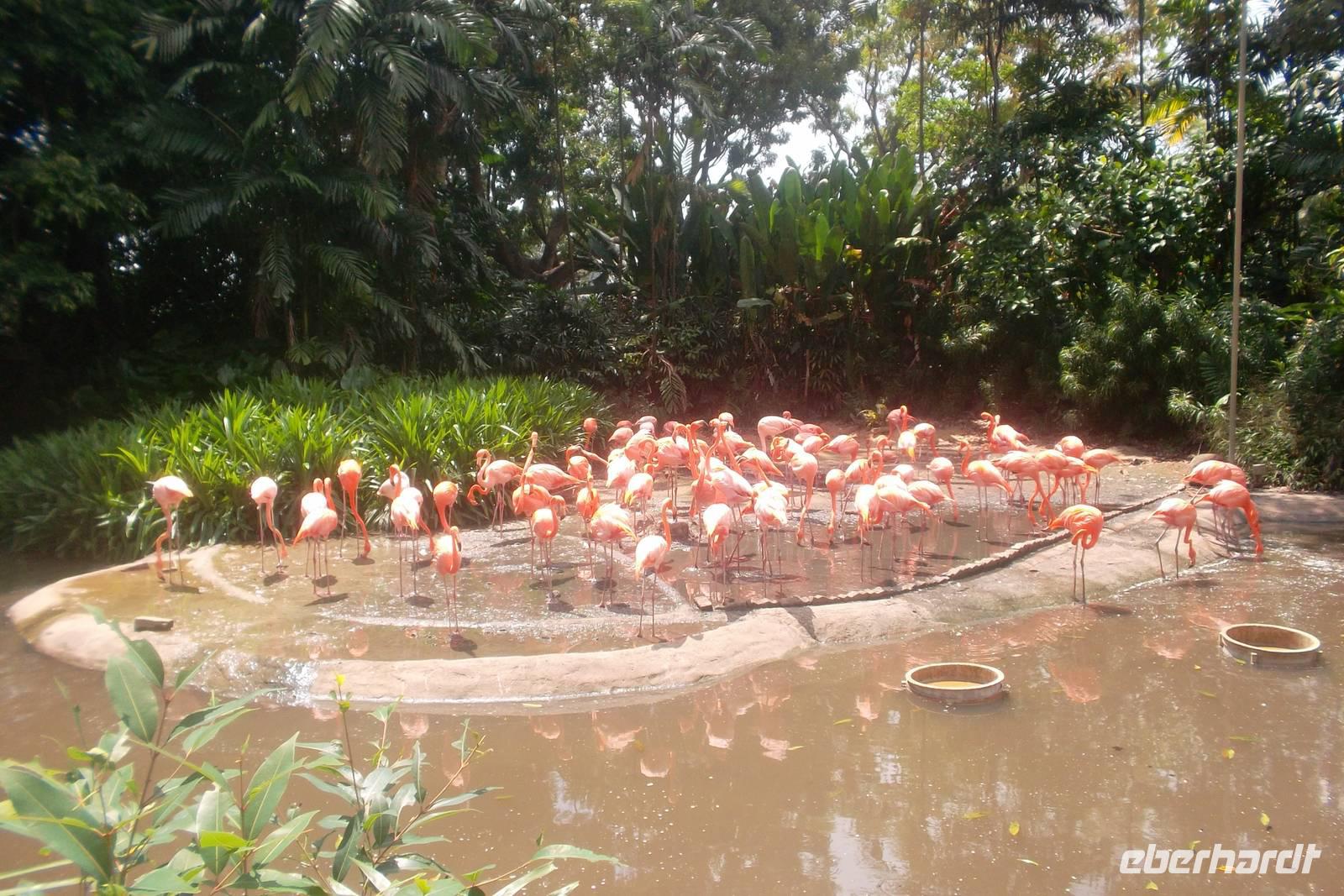 Wegen unseres späten Abfluges heute Abend konnten wir den Start des Tagesprogrammes auf mittags verschieben. Unser erstes Ziel war der seit 1971 existierende Jurong Bird Park. Der 20 Hektar große Zoo speziell für Vögel beherbergt mehr als 5000 gefiederte Exemplare von über 400 Arten. Wunderhübsche Flamingos, Vögel in großen, teilweise begehbaren Volieren und vor allem das „Lori Loft", eine mehrstöckige Voliere für über 1000 Papageien gehören zu den Attraktionen. Interessant war auch die Vogelshow, bei der man mehrmals am Tag freifliegende exotische Vögel beobachten kann, von denen einige Kunststücke vorführen, bei denen auch das Publikum einbezogen wird.