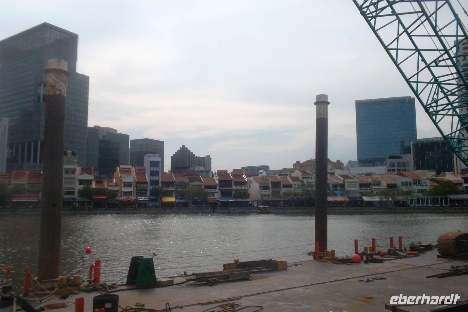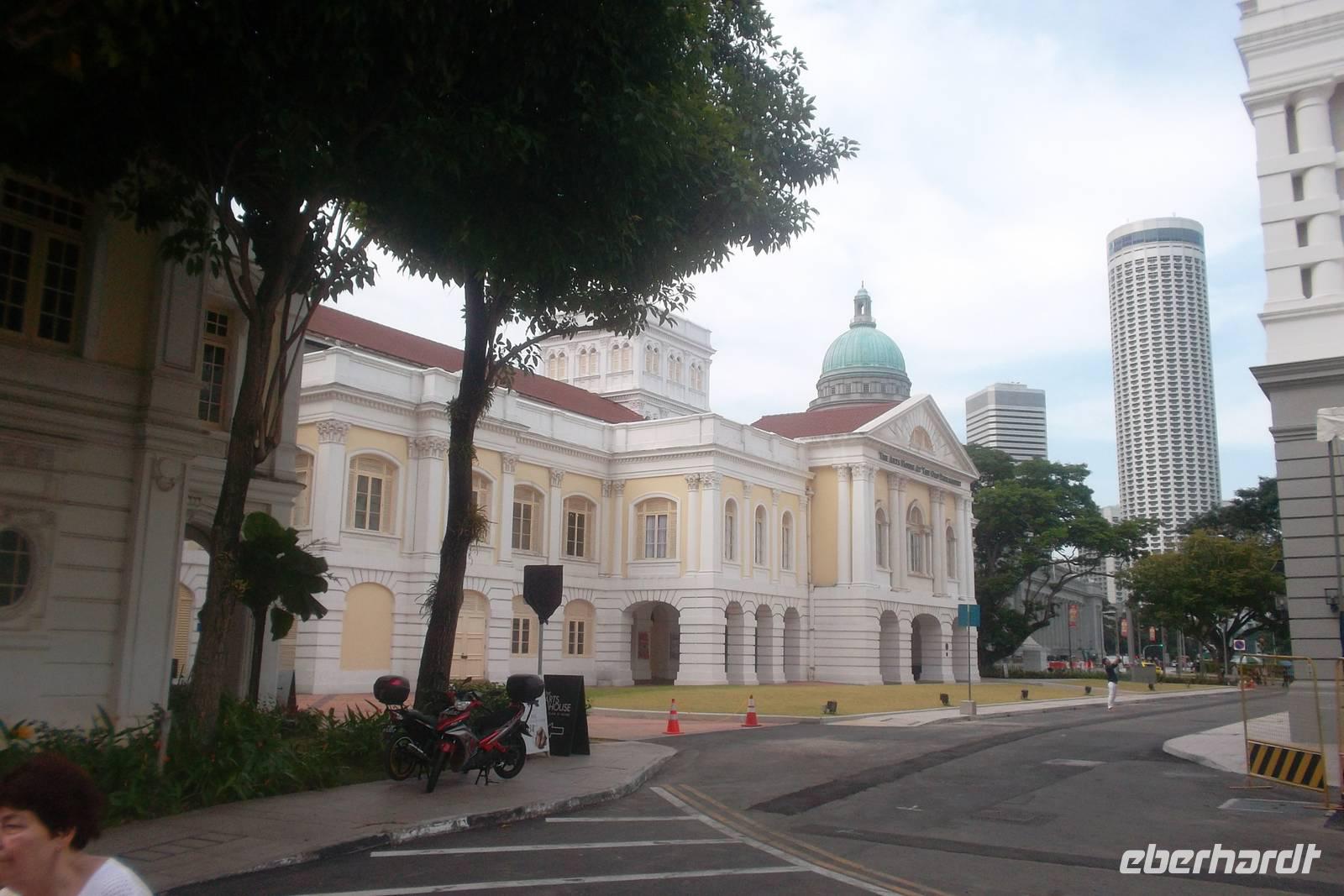Nach dem Vogelpark folgte ein weiterer Teil unserer Stadtbesichtigungen, bei denen es diesmal durch das Zentrum von Singapur ins alten koloniale Stadtzentrum ging. Wegen Totalrestaurierung und Vorbereitung auf die Feierlichkeiten zum 200. Jahrestag der Gründung war leider vieles ein wenig verbaut und verdeckt, noch mehr eingerüstet. Selbst die Statue des Stadtgründers am Raffles Landing Quay und das Flussufer an vielen Stellen selbst waren verhüllt bzw. Baustelle. So waren einige Ausblicke etwas getrübt und ganz so stolz und eindrucksvoll wie sonst stand der (verhüllte) Sir Thomas Stamford Raffles diesmal nicht neben dem Alten Postamt.
