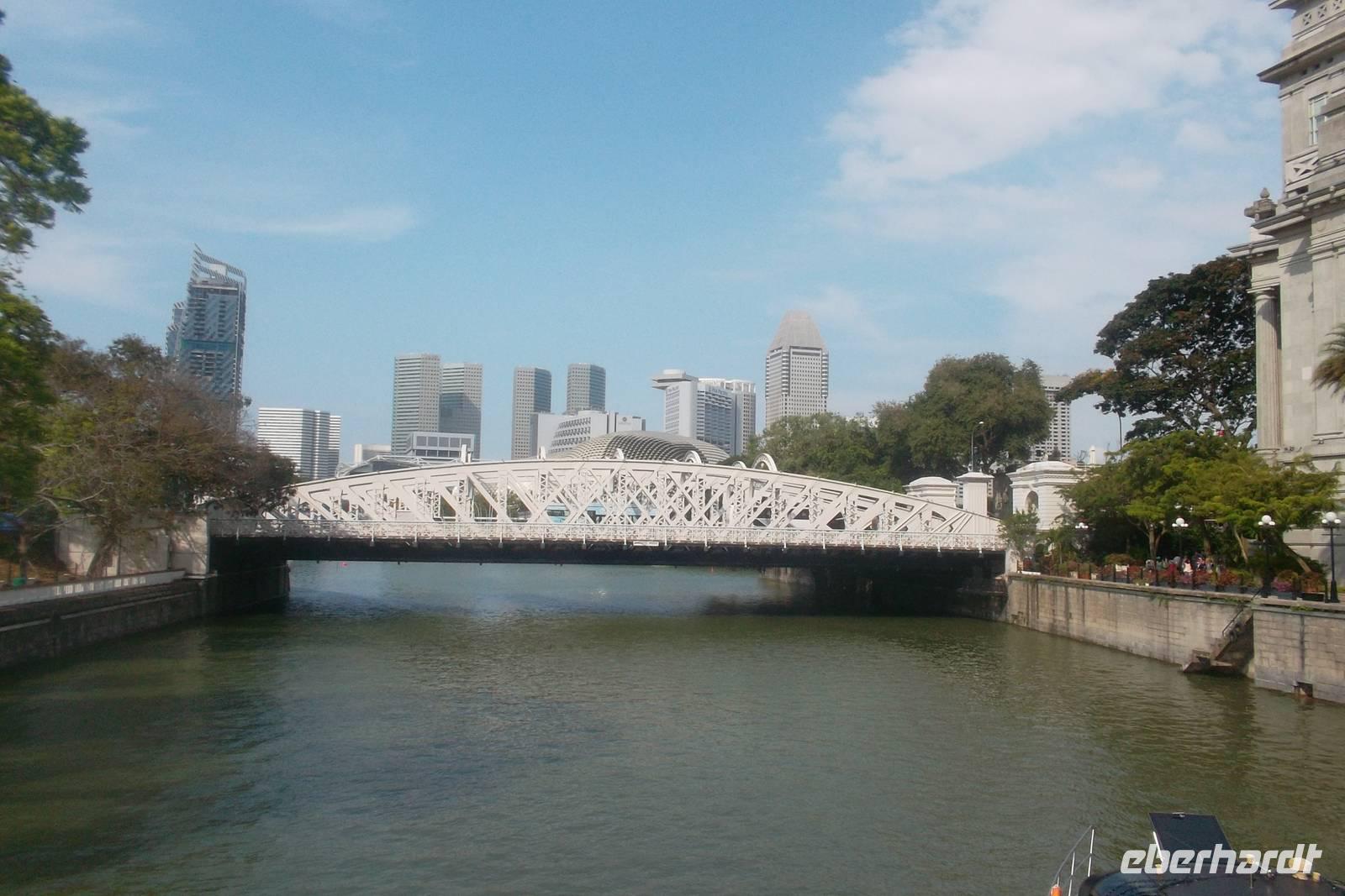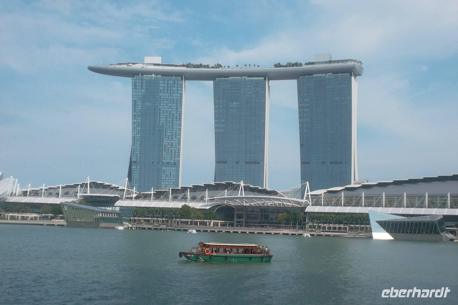 Das idyllische Dahingleiten auf dem Fluss durch das erleuchtete Zentrum Singapurs zeigte uns auch - angeleuchtet - Singapurs Wahrzeichen, den Löwen-Fisch „Merlion". Zurück ging dann die Bootsfahrt durch das alte Kolonialviertel und die Chinesenstadt, alles vor der prachtvoll beleuchteten Skyline von Singapur, die sich majestätisch vor dem samtenen dunklen Himmel abzeichnete.