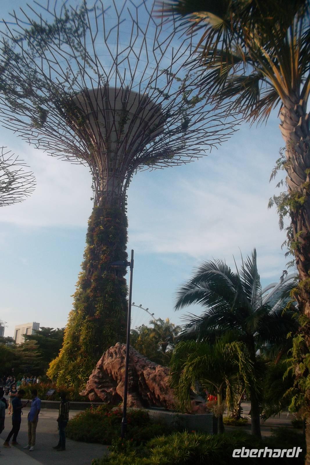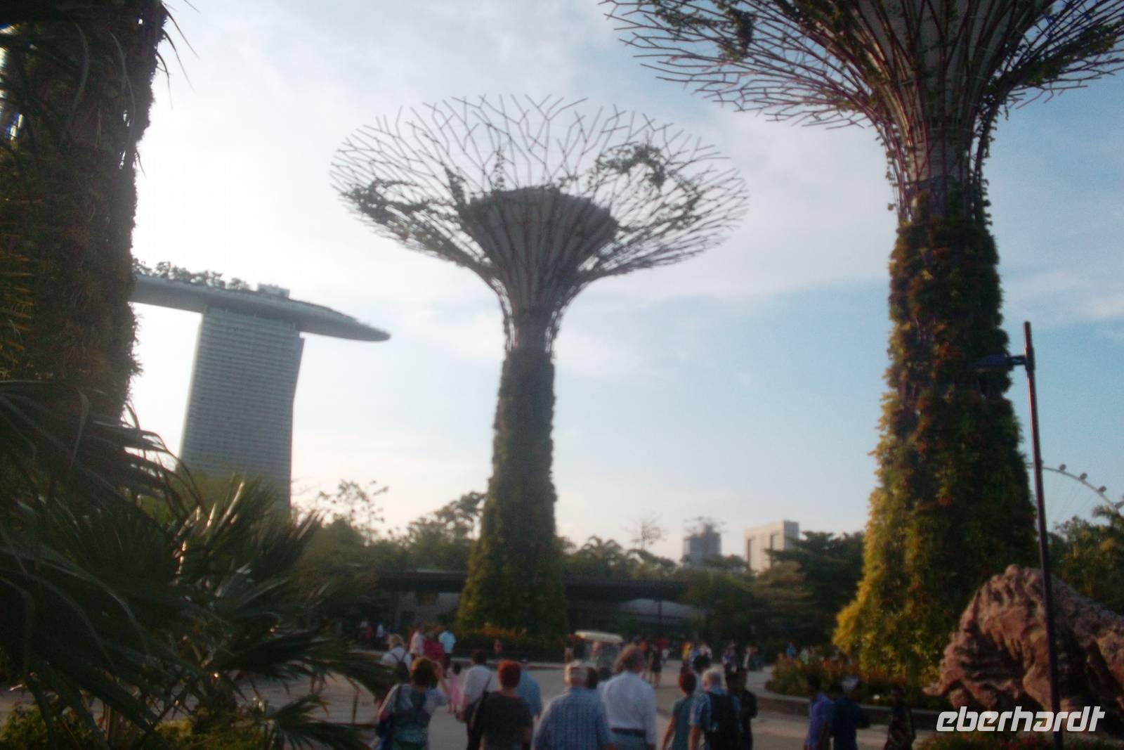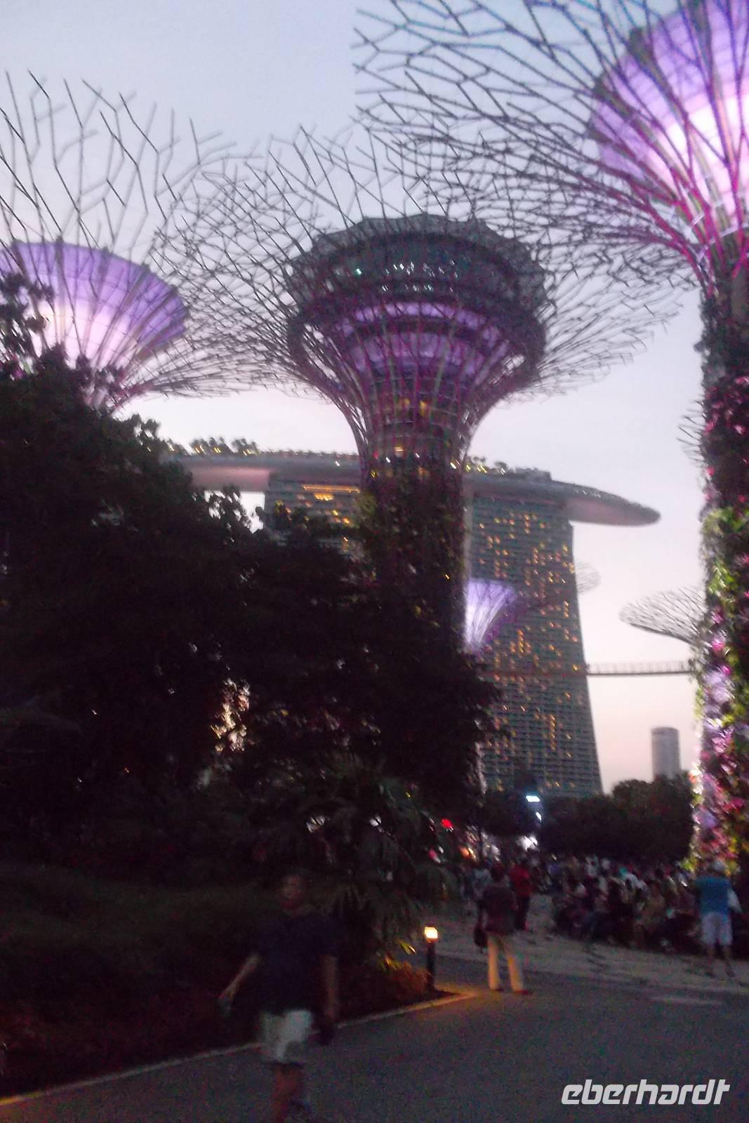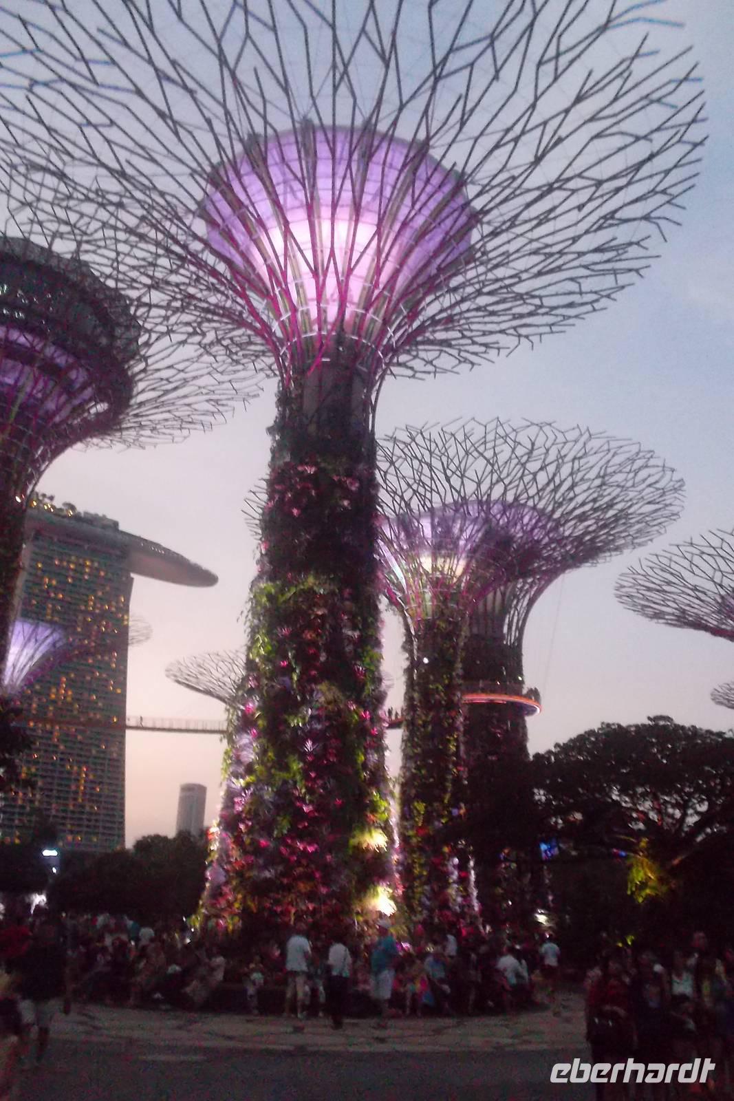 Nach dem Bar-Intermezzo hatte Reiseleiterin Martine noch einen „Abschiedsbonbon" für uns bereit. Gemeinsam fuhren wir zur größten Gartenanlage Singapurs. Die „Gardens by the Bay" sind vor allem abends höchst interessant. Wir erreichten die beiden angeblich größten Gewächshäuser der Welt eine gute Stunde vor Sonnenuntergang, genügend Zeit, um den künstlichen Wasserfall und einige andere Attraktionen hier zu bestaunen. Mit Einbruch der Dämmerung fanden wir uns dann an den großen Metallbäumen ein. Die sind von vielen Stellen der Stadt - besonders gut auch vom Riesenrad - schon zu sehen gewesen. Mit Sonnen- und Wasserkollektoren auf ihren künstlichen Baumkronen sorgen sie für Bewässerung und Energieversorgung der Gärten. Mit Einbruch der Dunkelheit beleuchtet, sind sie allabendlich der Schauplatz einer kurzen, aber sehr eindrucksvollen Licht- und Sound-Show.