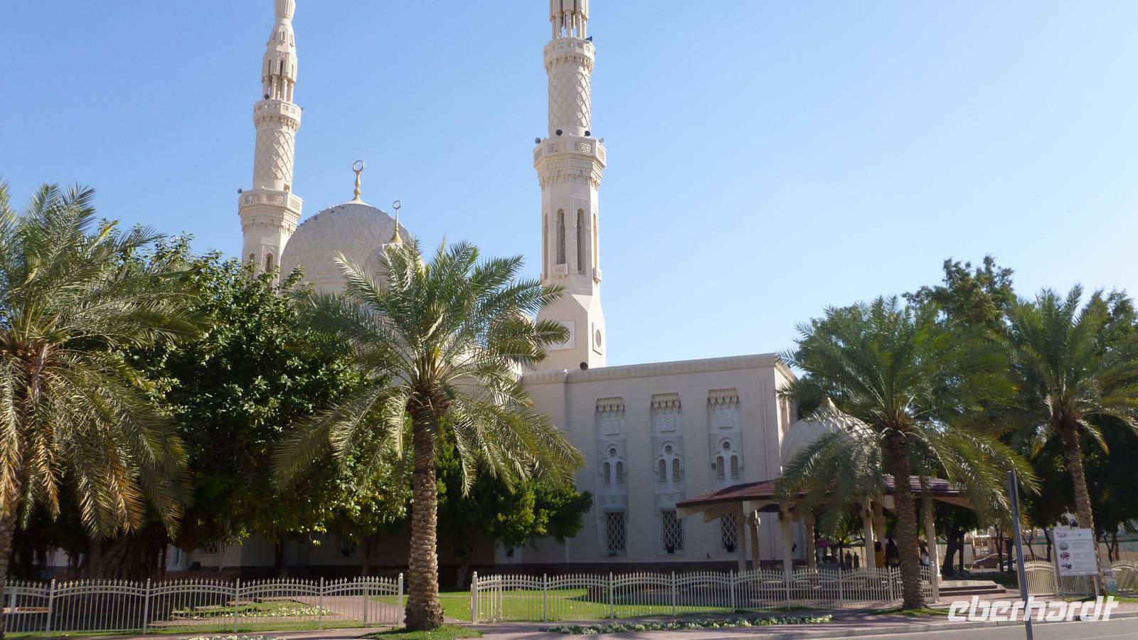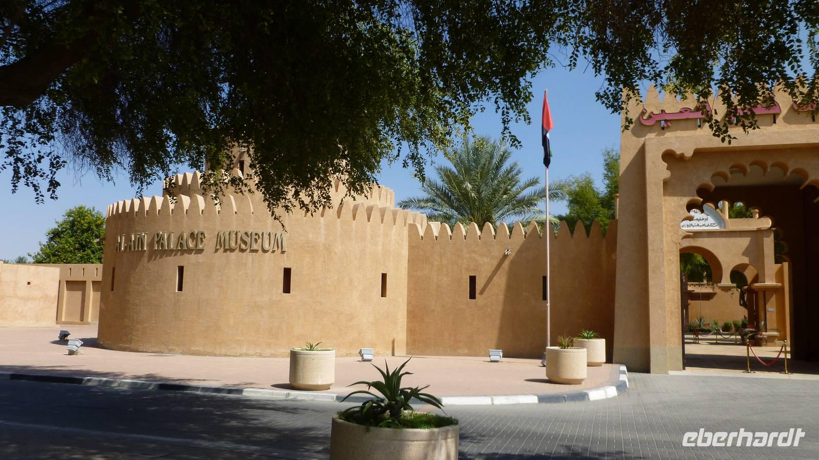 Nach einer Fahrt über die Wüstenautobahn entlang rötlich schimmernder Sanddünen erreichen wir die Oasenstadt Al Ain, welche sich deutlich von den Großstädten an der Golfküste unterscheidet: Wolkenkratzer gibt es hier nicht. Dafür kann Al Ain auf eine mehrere tausend Jahre lange Geschichte aufbauen und grüne Gärten voller Dattelpalmen vorweisen. Zweimal jährlich muß man die Dattelpalme hinauf, im Frühjahr zum Bestäuben und im Spätsommer zur Ernte. Wie man mit einfachen Hilfsmitteln scheinbar mühelos auf die Palme steigt, zeigt uns Jakob aus Pakistan. Im National- und Palastmuseum von Al Ain erfahren wir mehr über die Landesgeschichte und platzieren uns im großen Sitzungssaal, wo einst der Staatsgründer Shaikh Zayed die Queen empfing und wichtige Verträge besiegelt wurden.