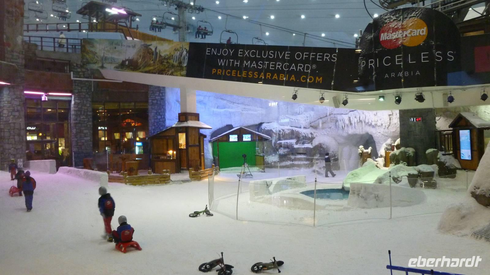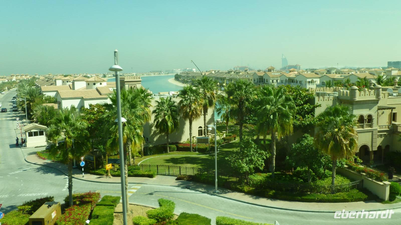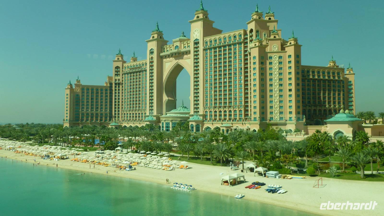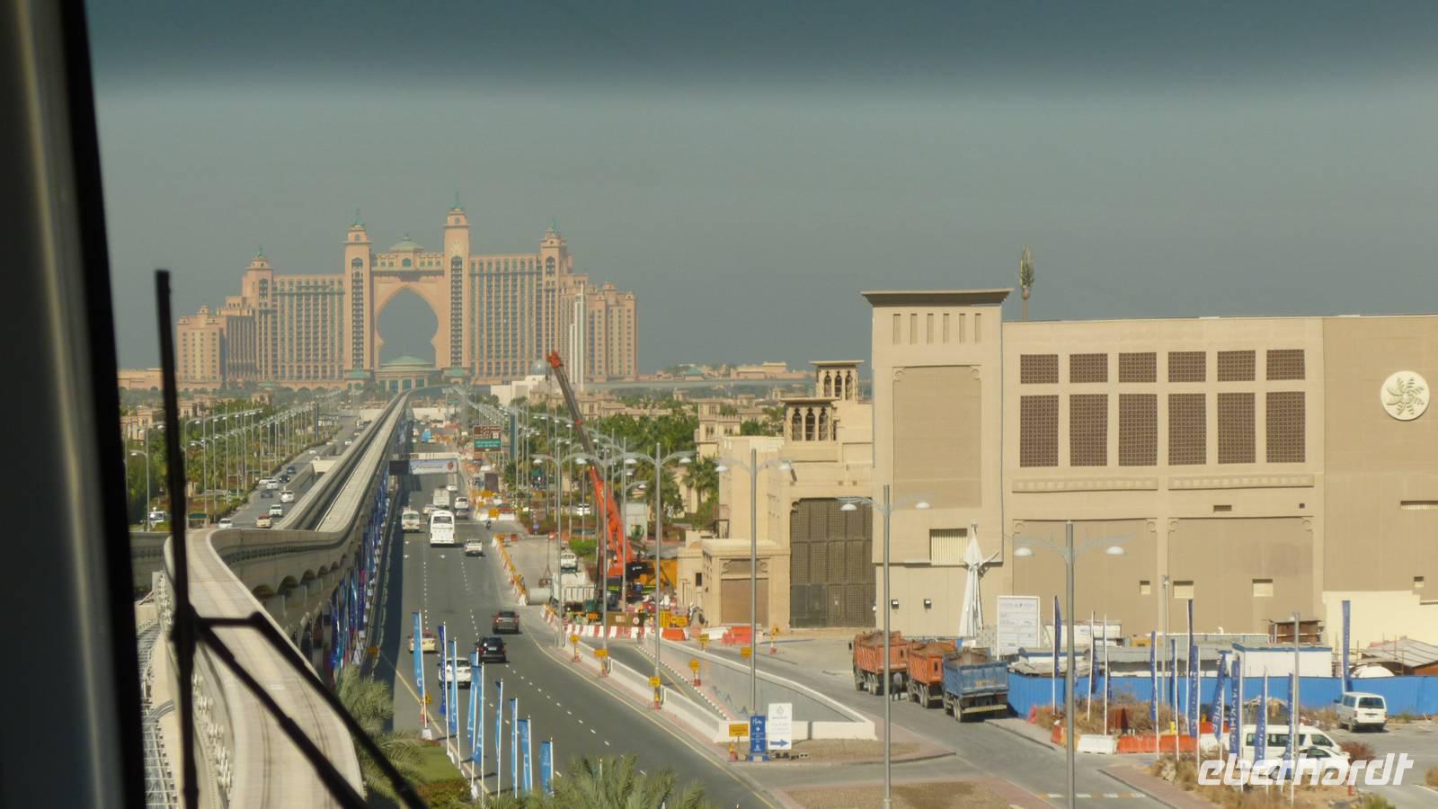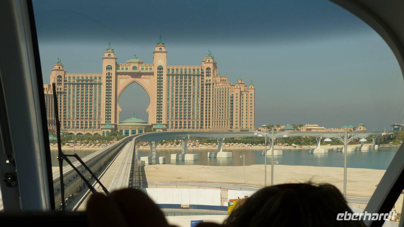 In der Ferne können wir schon die größte künstliche Insel der Welt, die Palmeninsel „Palm Jumairah" erkennen. Mit der Hochbahn, Monorail genannt, fahren wir auf dem Palmenstamm in Richtung Atlantis-Hotel. Weiter geht es vorbei an Dubai Marina zur Mall of the Emirates. Hier befindet sich Dubais Skihalle - ja Dubais Einwohner möchten auch mal Skifahren!