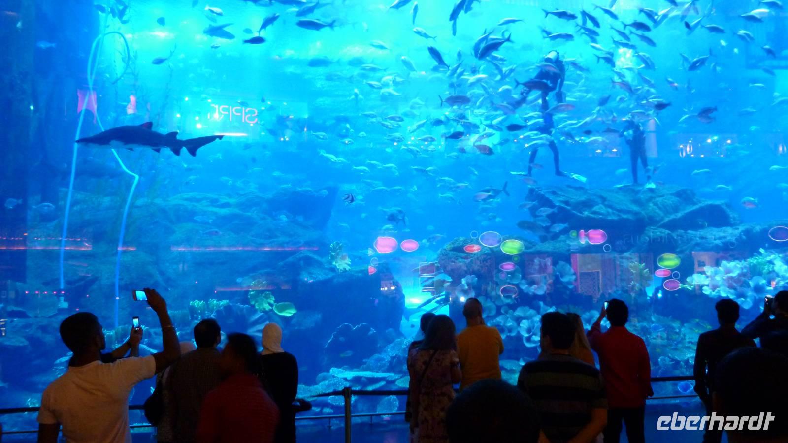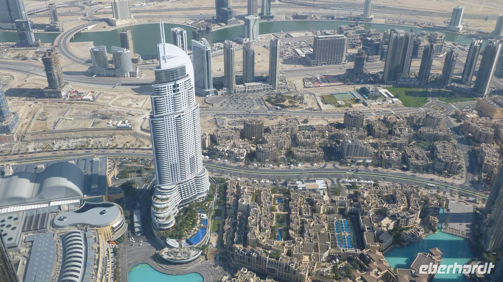 Der Stadtteil Dubai Down Town mit dem 828 Meter hohen Burj Khalifa, Wasserlandschaft, der weltgrößten Shopping Mall „Dubai Mall" und dem Markt Souk Bahar bilden ein gelungenes Gesamtwerk und den Höhepunkt einer jeden Dubai-Reise. Ein Muss ist ein Besuch des weltgrößten, drei Etagen hohen Aquariums mit Tunnel sowie der Aussichtsplattform in der 124. Etage (453m) des Burj Khalifa. Die klare Luft an diesem Tag erlaubt uns eine außerordentliche Fernsicht.