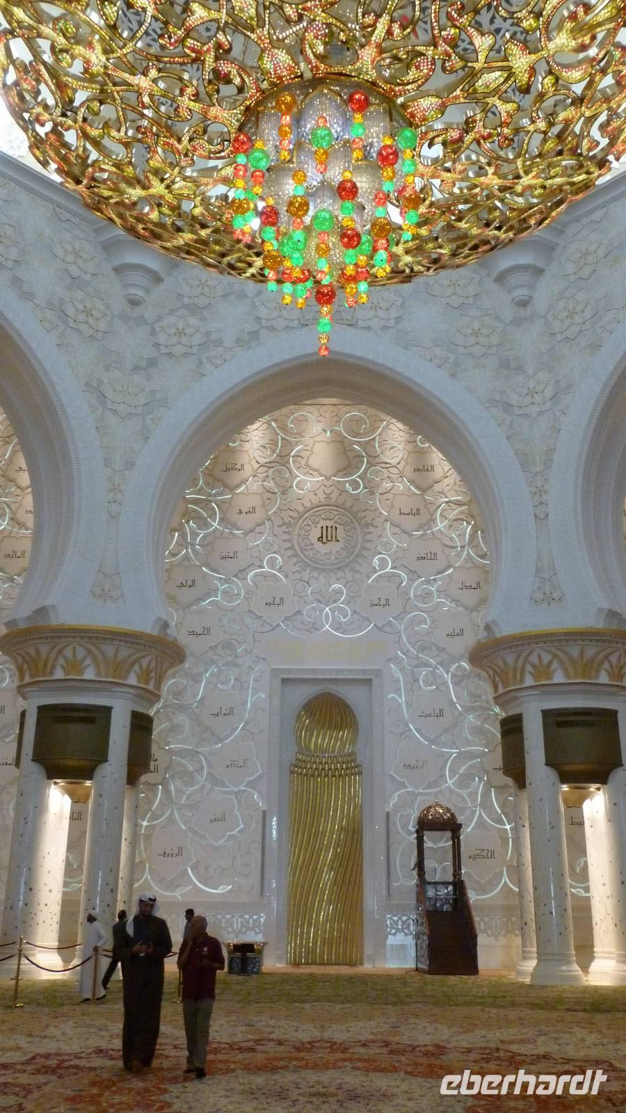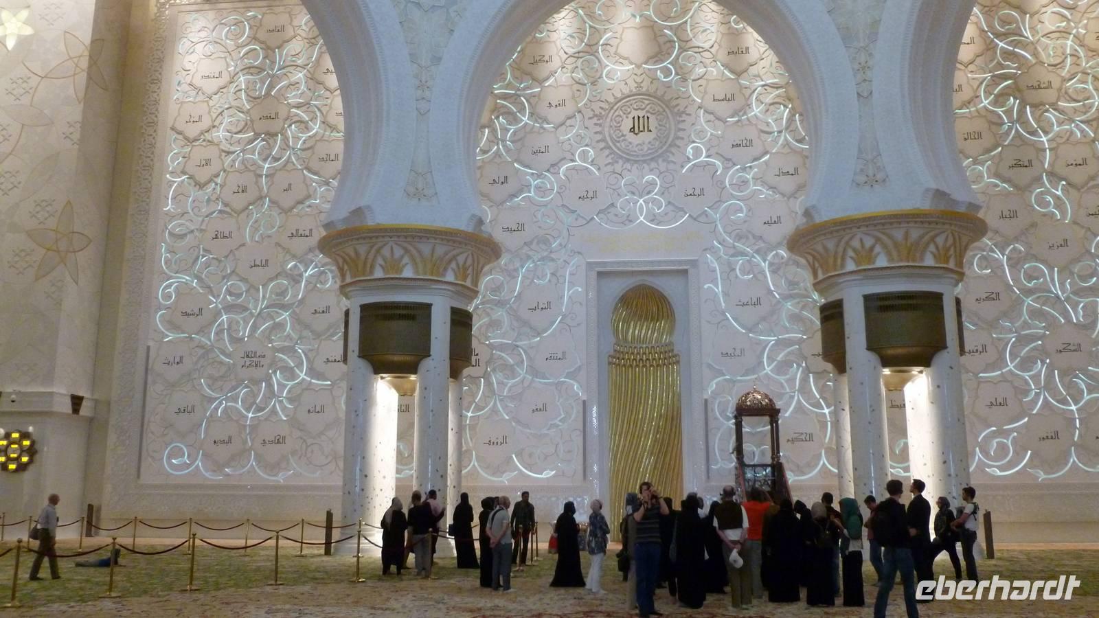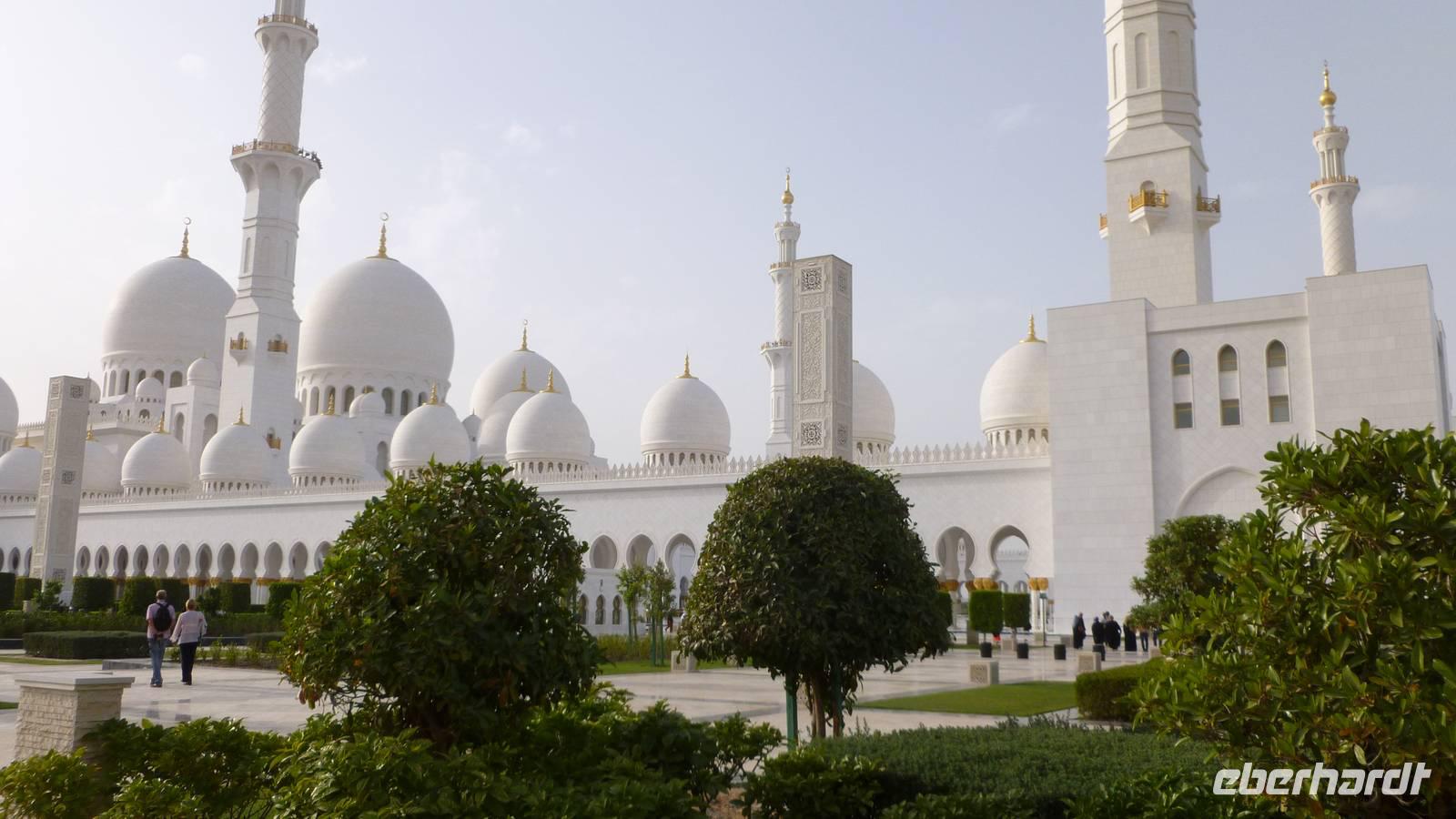 In der Shaikh Zayed Moschee, der weltweit größten Moschee außerhalb der heiligen Stätten in Saudi Arabien, machen wir uns mit dem Islam näher vertraut. Hier haben ca. 40.000 Muslime Platz. Die im weißen Marmor schimmernde Moschee mit seinen 82 Kuppeln nenne ich auch den „Taj Mahal Arabiens".