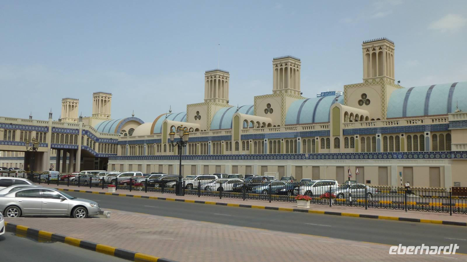 Anschließend folgt ein Streifzug durch die Märkte Sharjahs: Obst- und Gemüsemarkt, den Fischmarkt, wo die Reiher auf dem Dach auf leichte Beute lauern und den Zentralsouk (Blauer Souk) mit seinen charakteristischen Windtürmen.