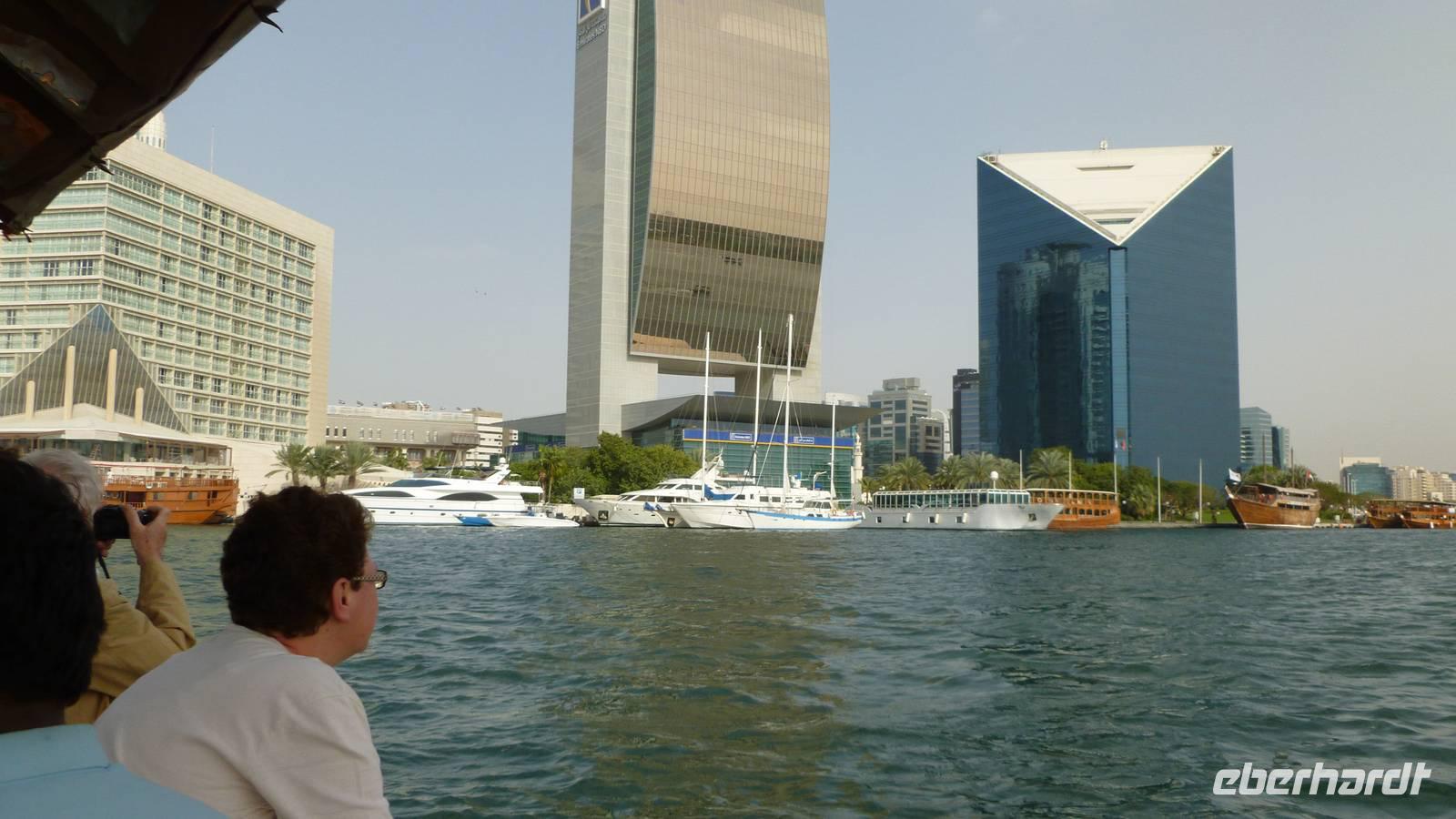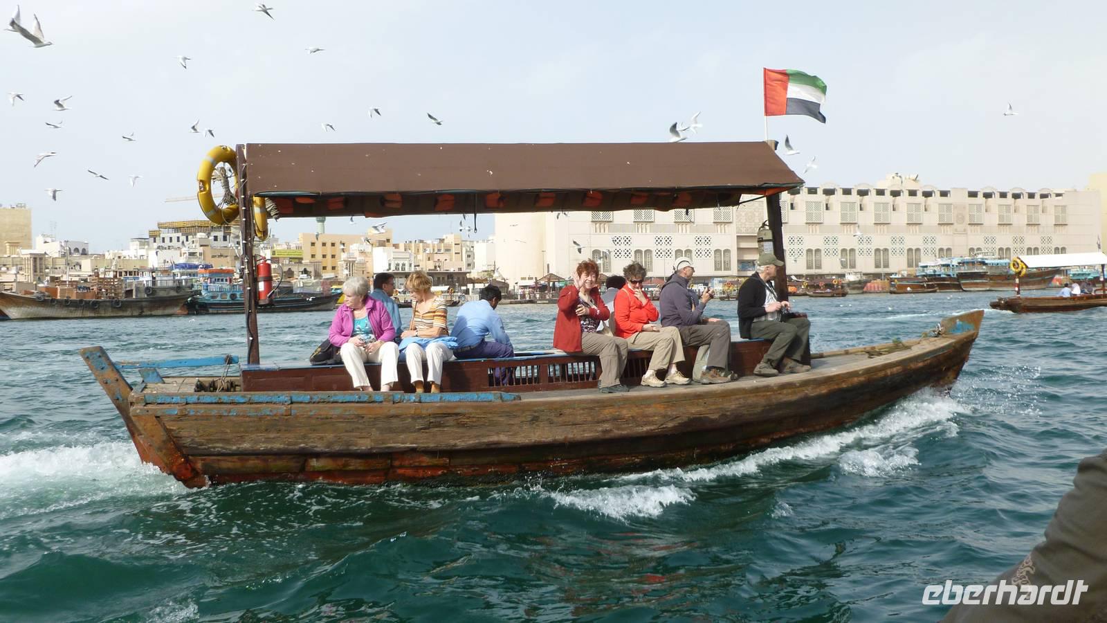 Nachmittags zurück in Dubai: am Creek, dem Meeresarm, welcher wie ein Fluß das alte Dubai teilt, liegen die alten Souks mit Gewürzen, Stoffen und Goldgeschäften, traditionelle Bauten mit Windtürmen und die Wolkenkratzer der 1990er Jahre. Bei einer Fahrt mit einer Abra, dem traditionellen Wassertaxi genießen wir diese Kulisse, bevor wir in das Markttreiben eintauchen.