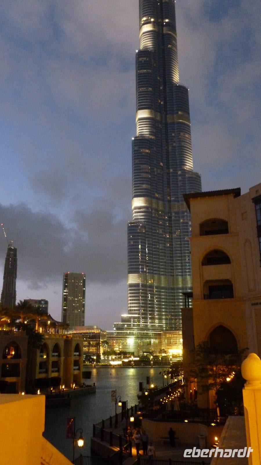 Szenenwechsel: Burj Dubai Lake, die künstliche Wasserlandschaft am Fuße des Burj Khalifa, seit Jahren mein abendlicher Lieblingsplatz in Dubai. Allabendlich faszinieren die Dubai Fountains - die Show von Wasserspielen mit Musik tausende Besucher. Und typisch Dubai, die Fontänen sind zu Füßen des höchsten Gebäudes der Welt natürlich auch selbst mit 150 Meter die höchsten.