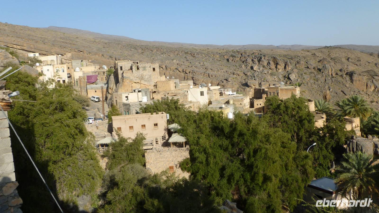 Die naheliegende Oase Bahla kann sich mit einem UNESCO-Weltkulturerbe rühmen: ein riesiges Lehmfort, das größte im Land, ist nach fast 20 Jahren Restaurierung seit kurzem für Besucher geöffnet. Es gilt als meisterhaftes Beispiel einer omanischen Verteidigungsanlage und bietet Einblicke in zahlreiche Räumlichkeiten sowie immer wieder neue Blickwinkel auf die umgebende Oase und Bergwelt. Da oben in den Bergen liegt im Zentralmassiv, dem Jebel Al Akhdar, auf 1.900 Meter Höhe unser Hotel. Erreichbar nur mit Allradfahrzeugen, da die Steigungen auf der sehr gut ausgebauten Bergstraße beträchtlich sind.