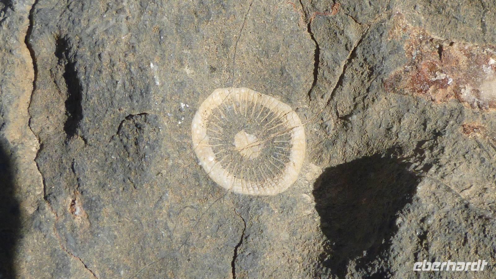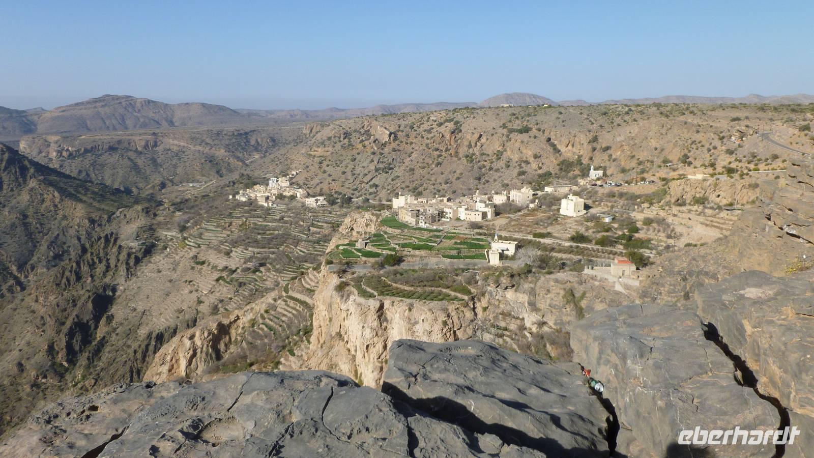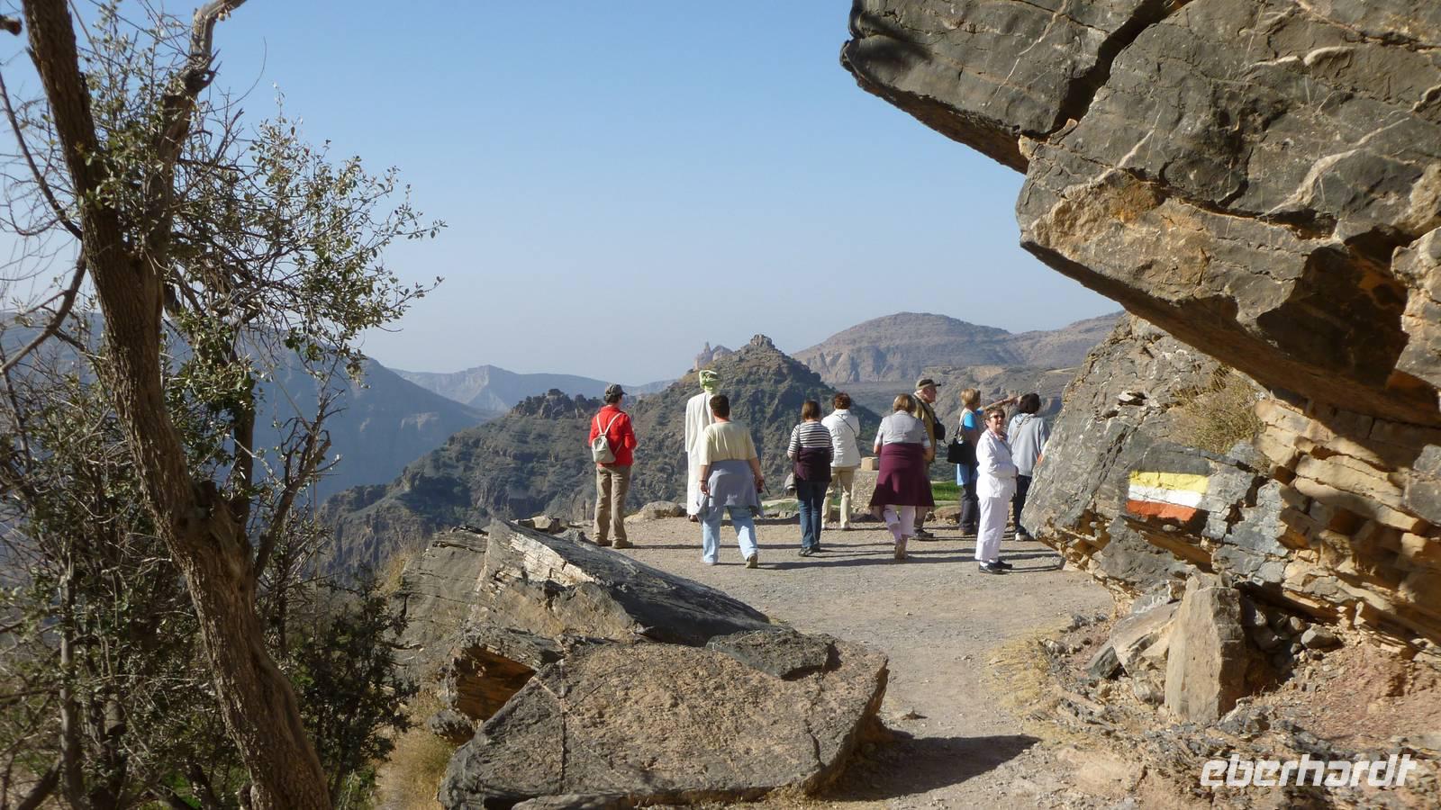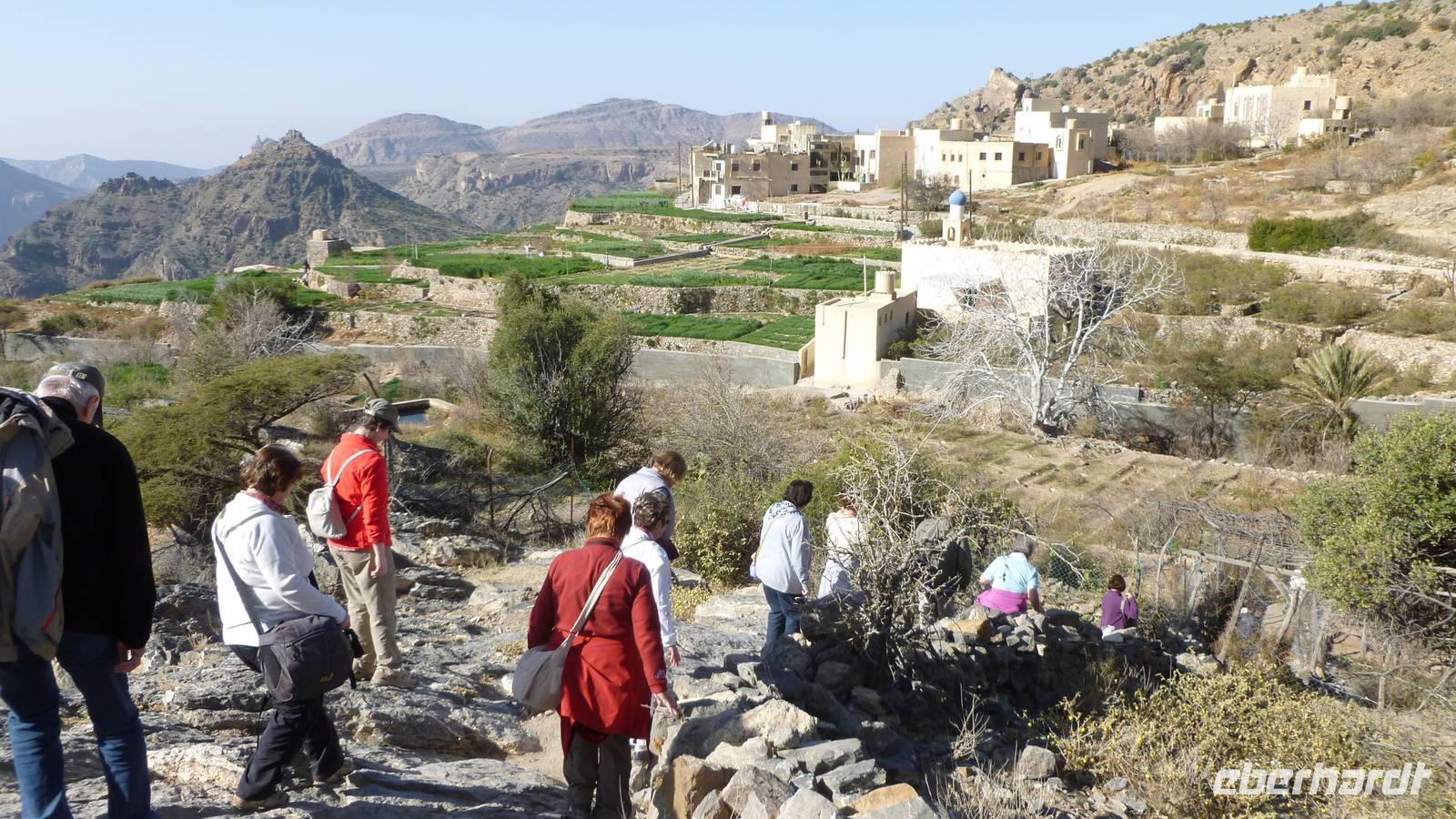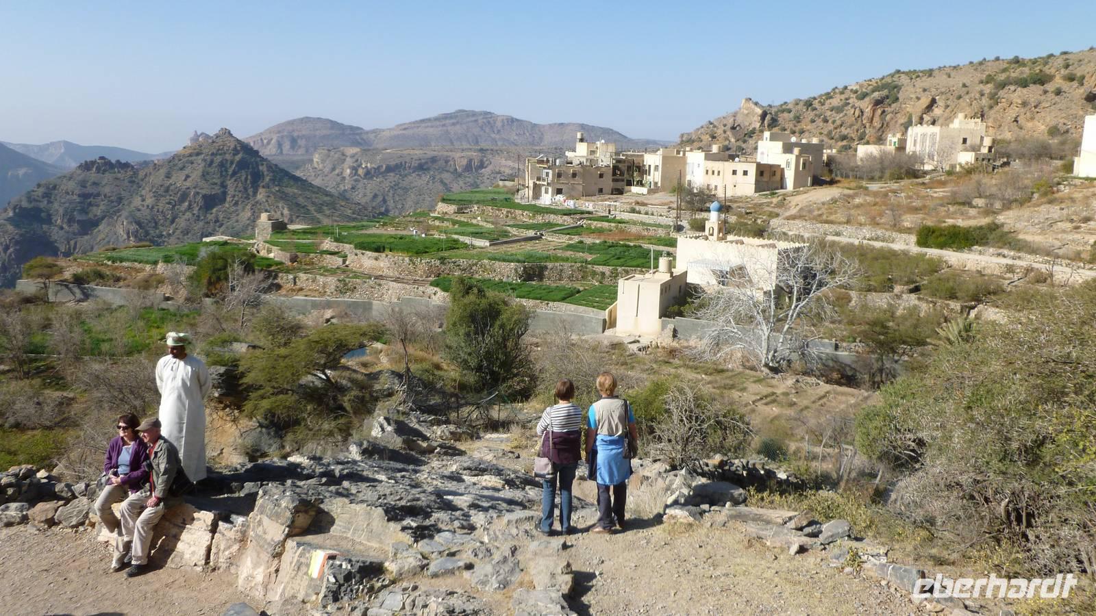 Der Morgen begrüßt uns mit Sonnenschein und angenehmen Temperaturen. Ideale Bedingungen für eine kleine Wanderung. Vom Saiq Hochplateau haben wir eine beeindruckende Aussicht auf die sogenannten „Grünen Berge" (= Jebel Al Akhdar) mit kleinen Dörfern und Terrassengärten. Schon Lady Diana wußte in den 1980er Jahren diesen Platz zu schätzen, wo wir jetzt stehen. Unsere Wanderung (außerhalb des Programms) beginnt beim Dorf Al Aqur (bis zum Ort Al Ain). Immer wieder begegnen wir freundlichen Dorfbewohnern und schießen Fotos - Mustafa ist als Fotomodell sehr gefragt . Nicht nur die Aussicht ist interessant, sondern auch Felsen und Steine: unzählige fossile Meerestiere sind hier in fast 2.000 Meter Höhe im Gestein eingeschlossen.