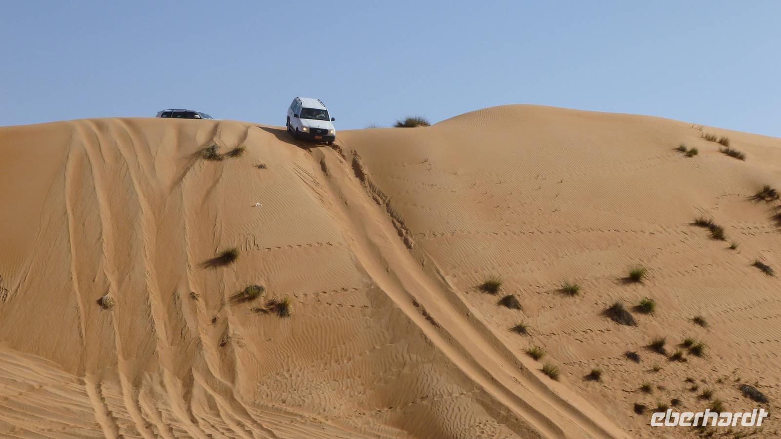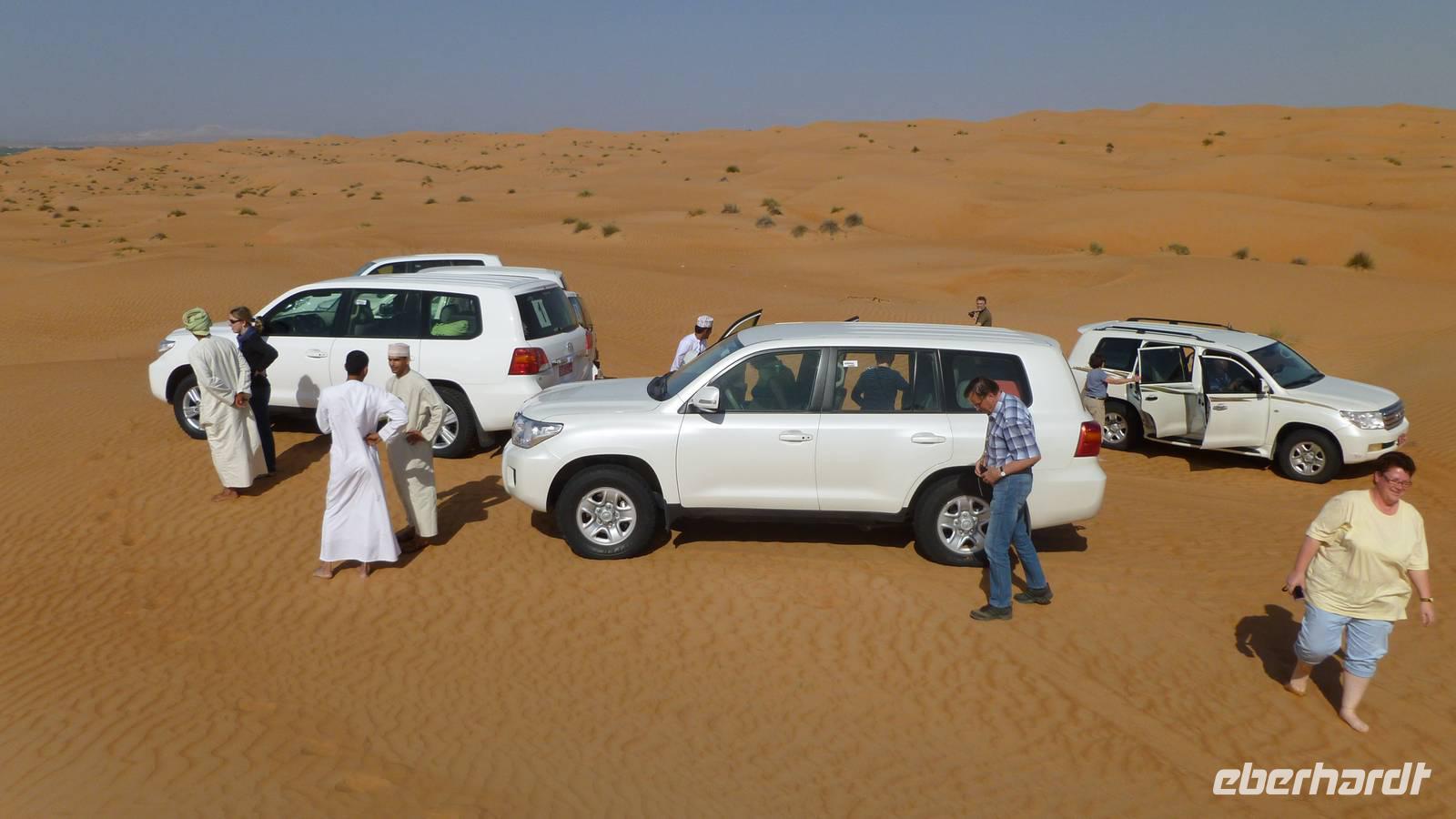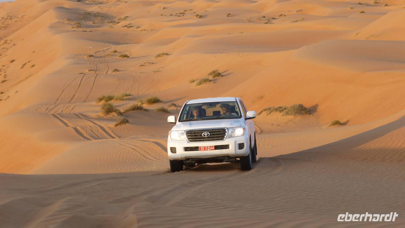 Über Ibra (Mittagspause) erreichen wir die Sandwüste Wahiba Sands. Hier heißt es anschnallen und gut festhalten, wenn wir mit unseren Landcruisern die Dünen hoch und runter fahren. In der Wüste sind wir zu Gast bei Beduinen im „Beduin House" und werden traditionell mit Kaffee und Datteln willkommen geheißen.