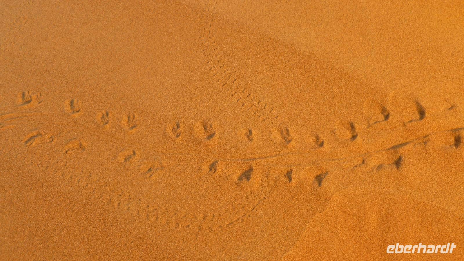 Das Morgenlicht lässt unser Camp im rötlich schimmernden Sandmeer erstrahlen.