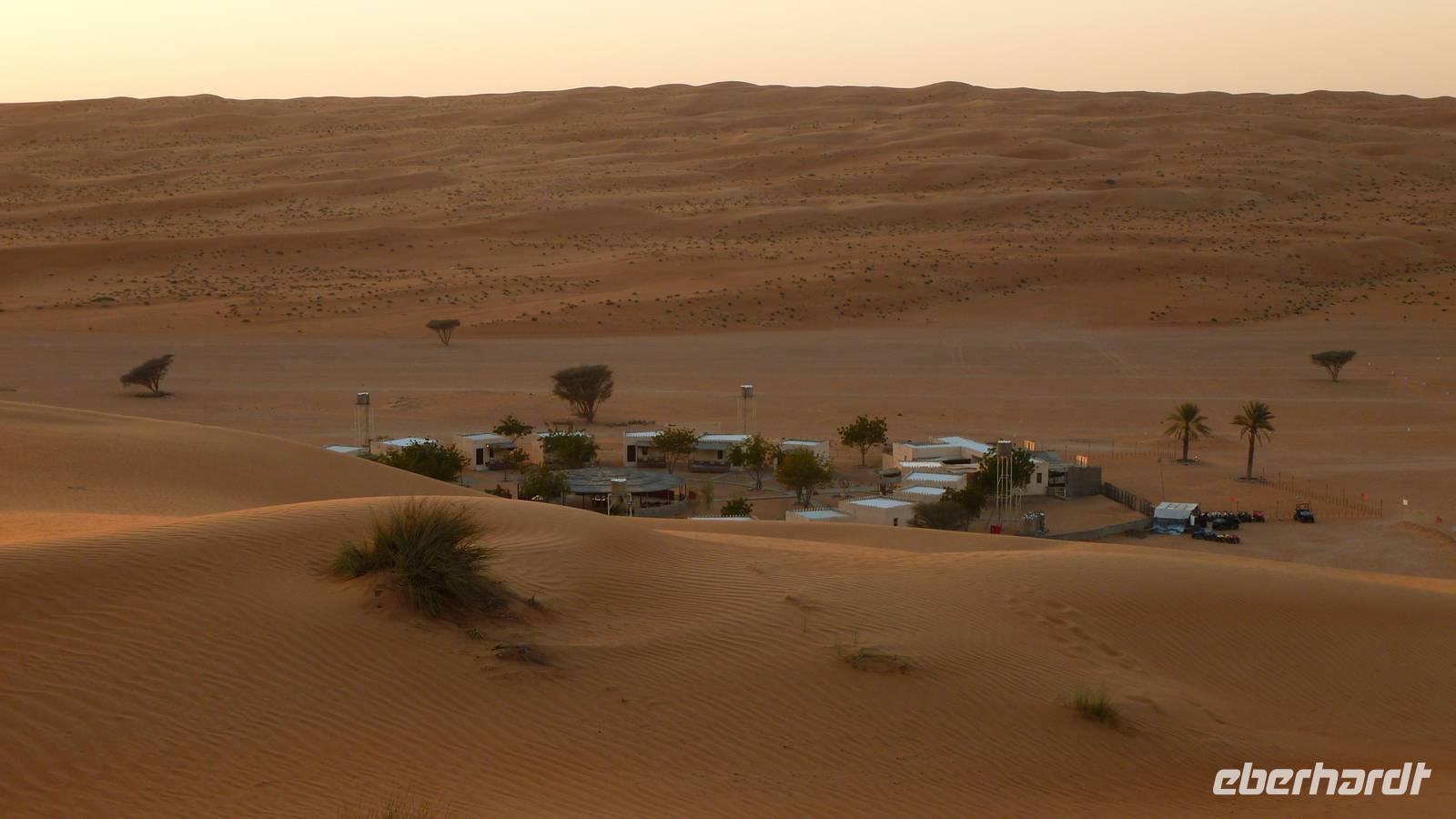 Ein paar Dünen weiter endet unser Tag im Wüstencamp „Sama Al Wasil" mit einem romantischen Sonnenuntergang.