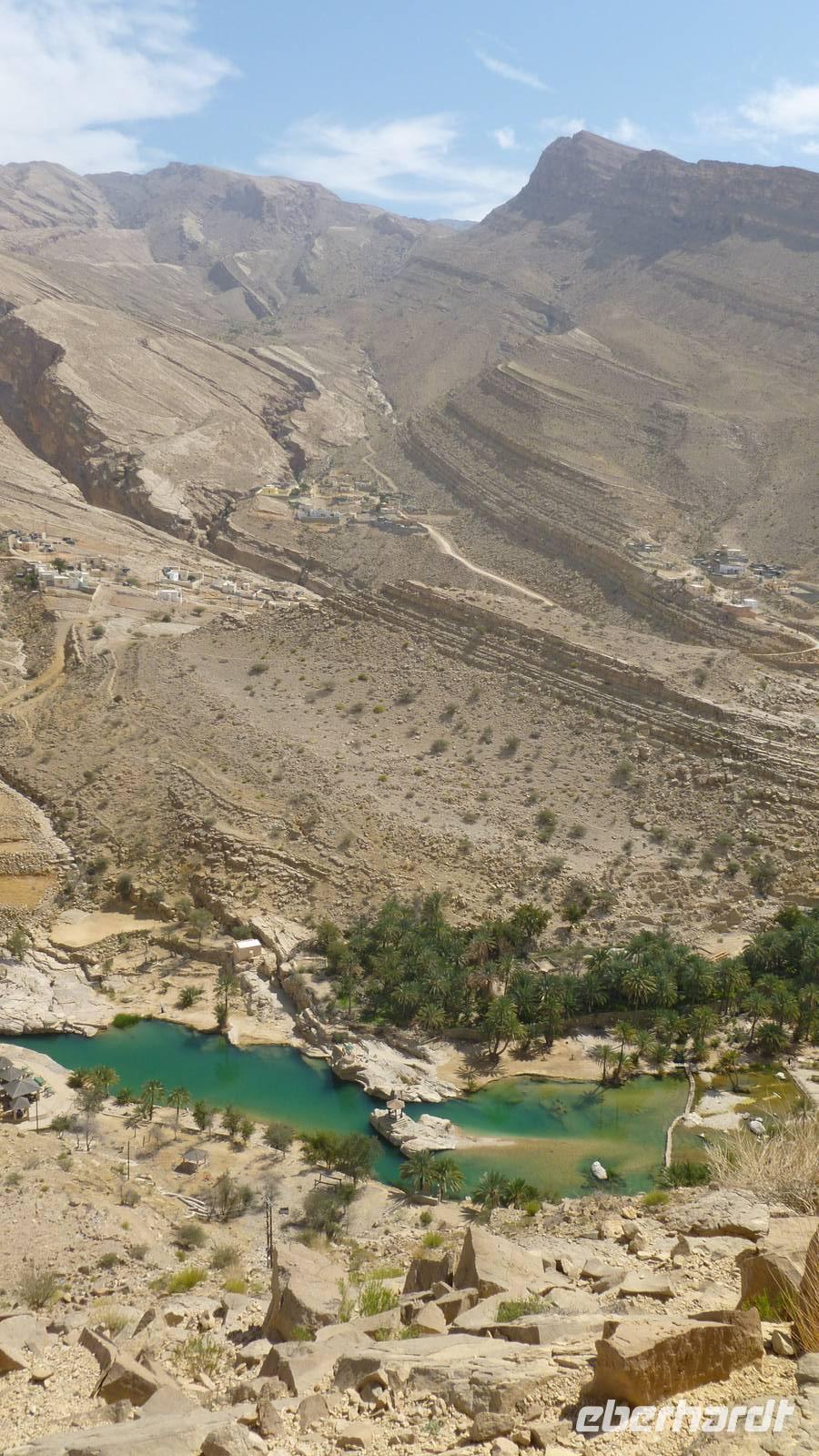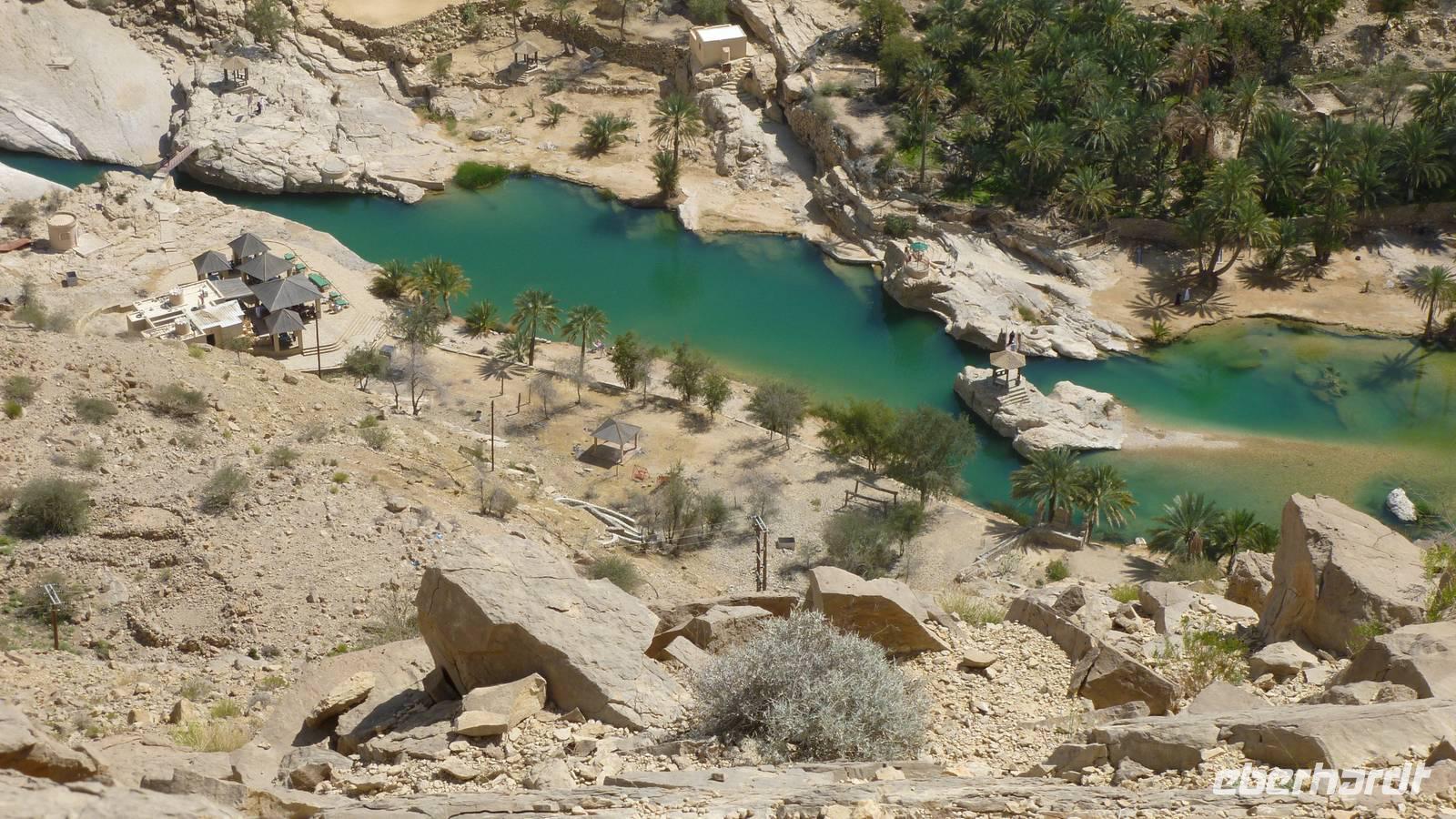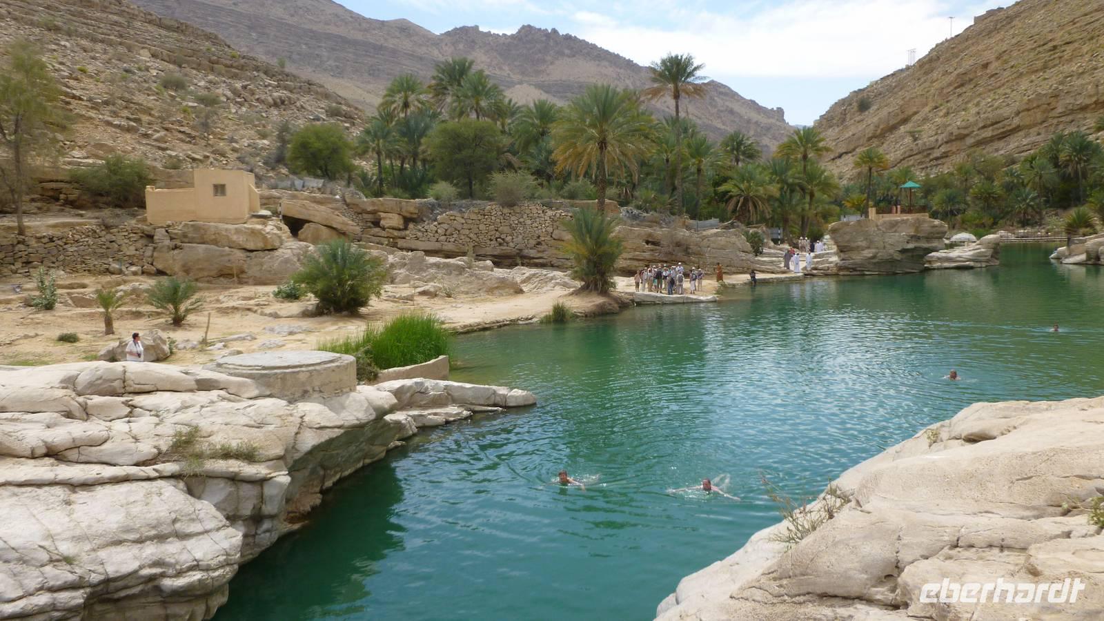 Kurze Zeit später erleben wir ein ganz anderes Landschaftsbild. Entlang der grünen Kupferberge des Hajar Gebirges fahren wir in die Schlucht des Wadi Bani Khalid. Zunächst wefen wir aus der Höhe einen Blick ins Tal mit den blau schimmernden Wasserpools. Es folgt ein Spaziergang durch das grüne Wadi. Mittag essen wir auf einer Anhöhe mit Blick auf´s Wasser, Palmengärten und Berge.