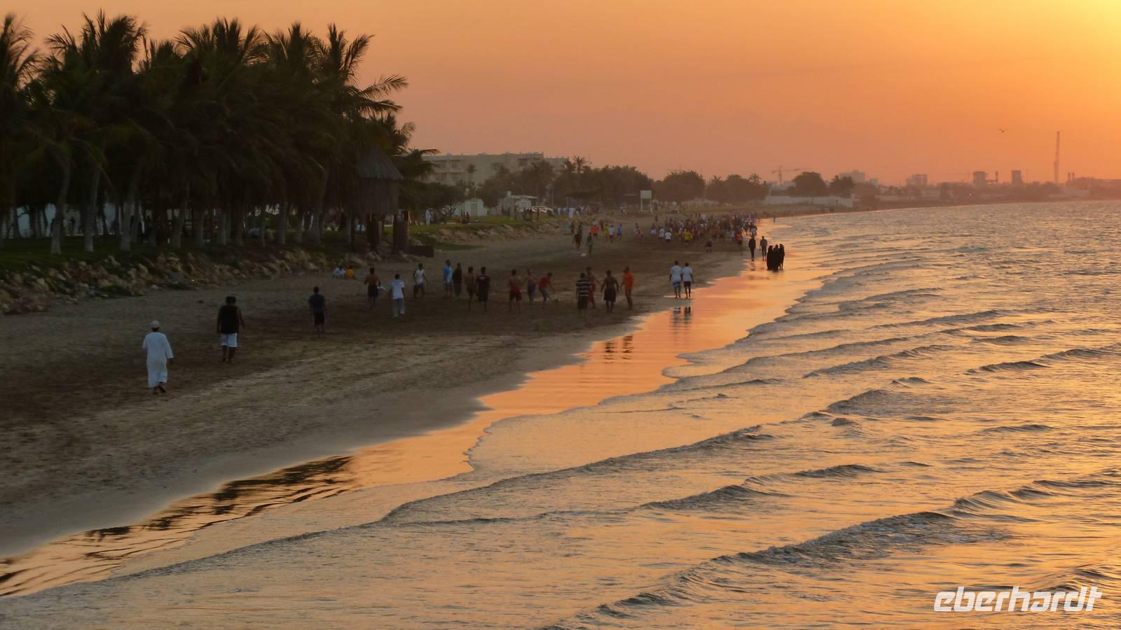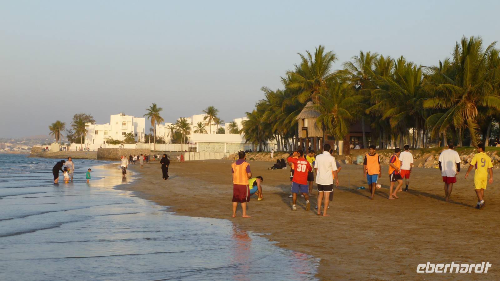 Unser Hotel befindet sich im Stadtteil Qurum, nicht weit vom Strand, der zu einem Bummel in den Sonnenuntergang einlädt. Die omanische Jugend nutzt den Strand zum Fußballspielen und zum „Schaulaufen" - Ausschau nach dem anderem Geschlecht halten. Auf einer der vielen schneeweißen Villen an der Corniche sieht man die deutsche Fahne wehen - ein schönes Fleckchen für die Residenz der deutschen Botschaft.