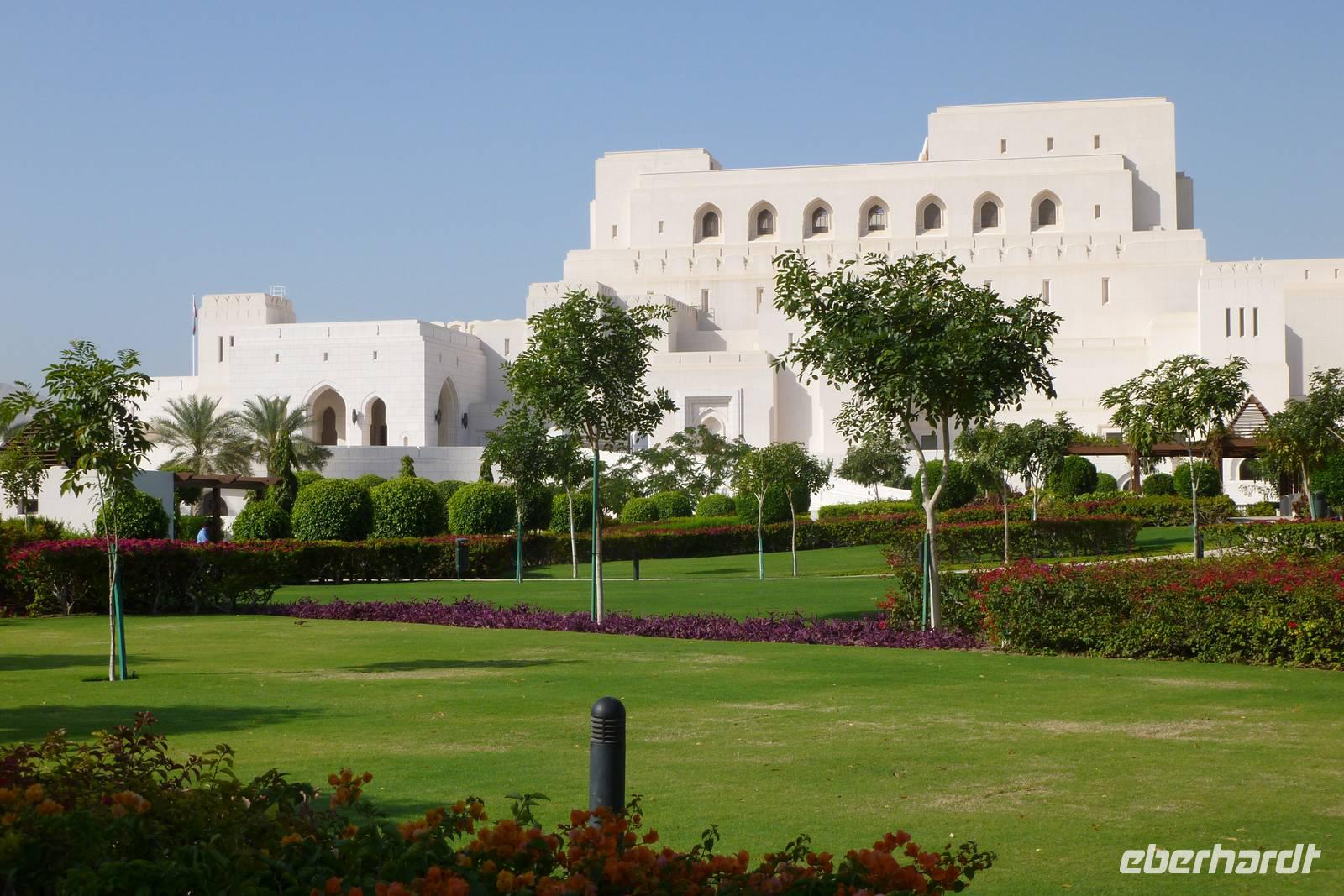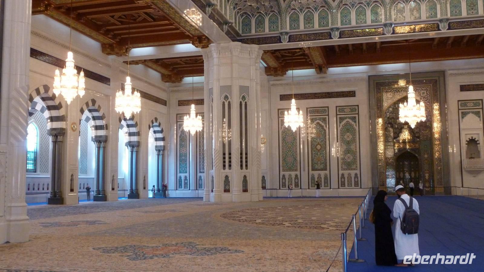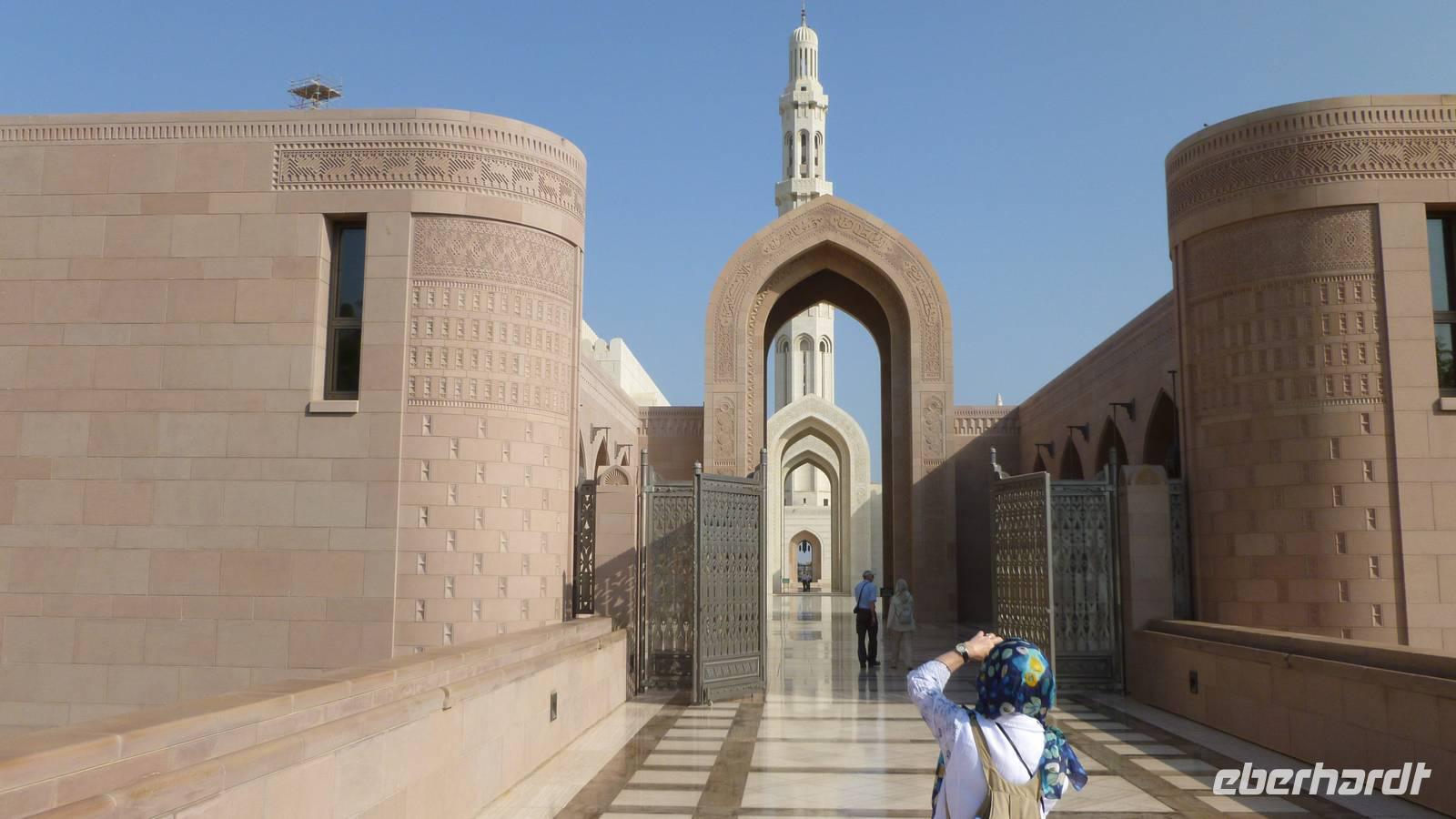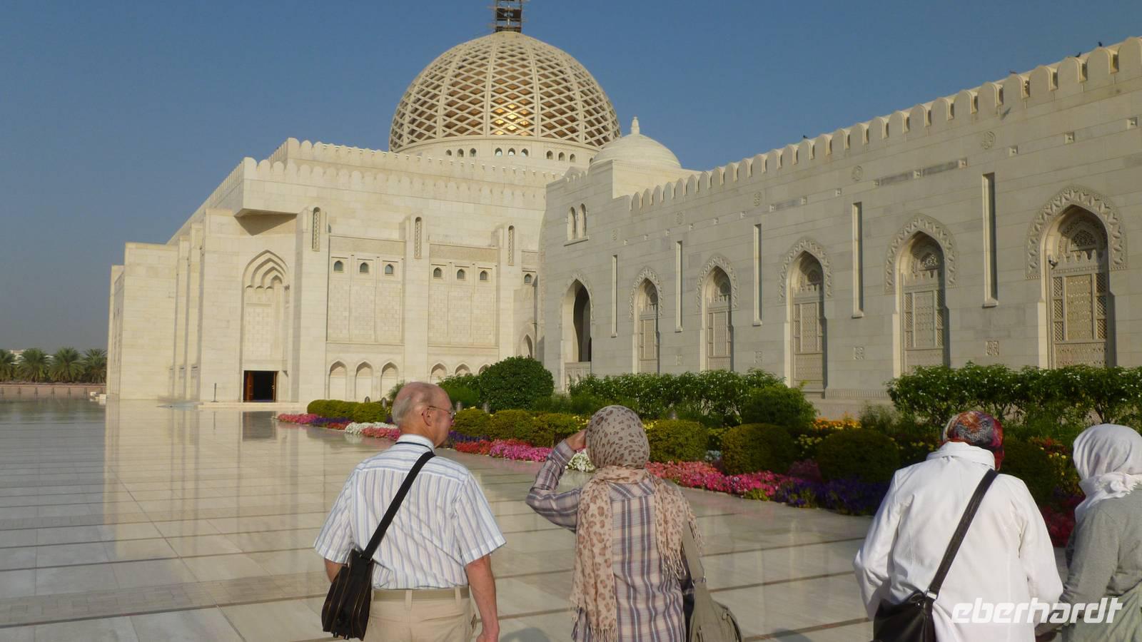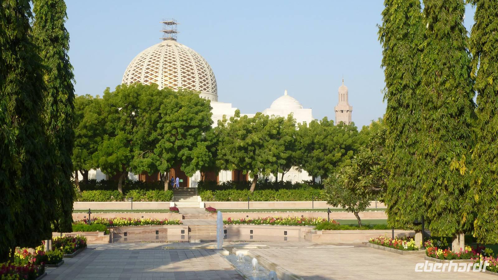 Ein grüner blühender Garten und Wasserbäche sollen an das Paradies erinnern, welches den frommen Muslim erwartet. Vor uns befindet sich die mächtige Kuppel der Großen Sultan Qaboos Moschee. Marmorböden und der indische Sandstein des Moscheekomplexes strahlen in der Morgensonne. Die Pracht der Hauptgebetshalle mit Swarowski-Leuchtern, riesigem Perserteppich und azurblauen Fayencen können wir an diesem Morgen noch ganz für uns allein genießen. Weitere interessante Punkte sind die Frauengebetshalle, Bibliothek und das Islaminformationszentrum.