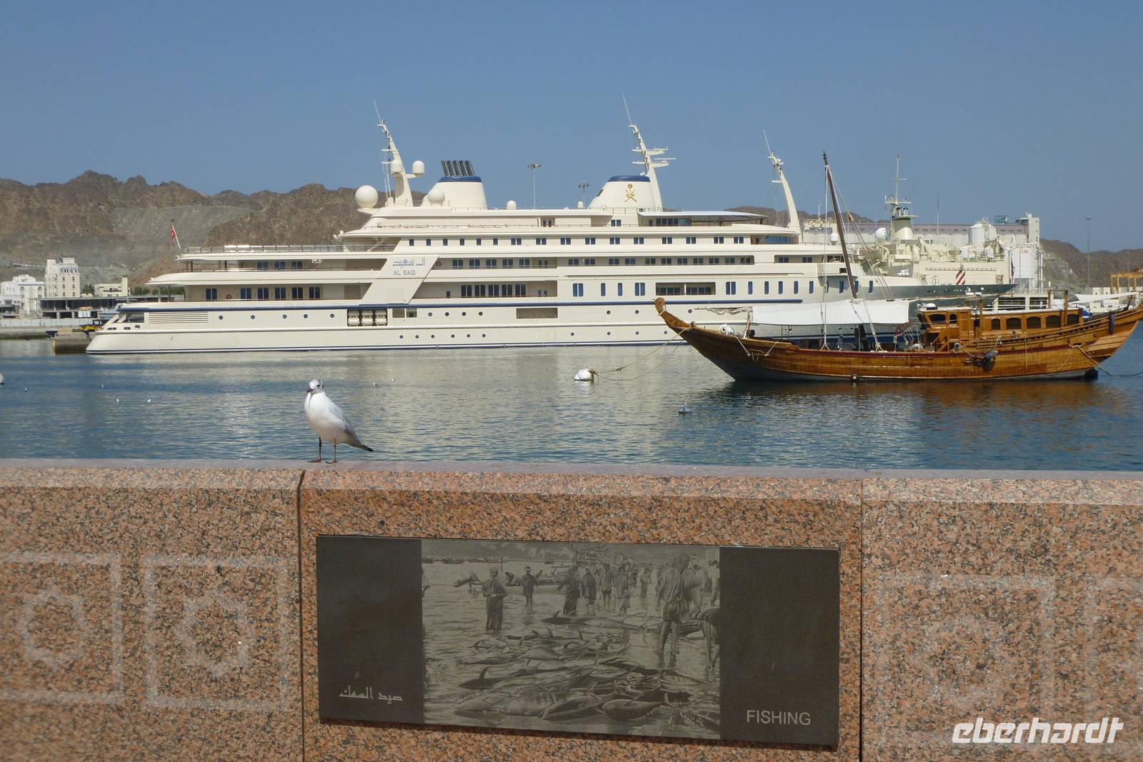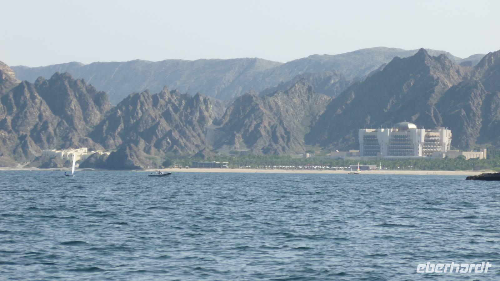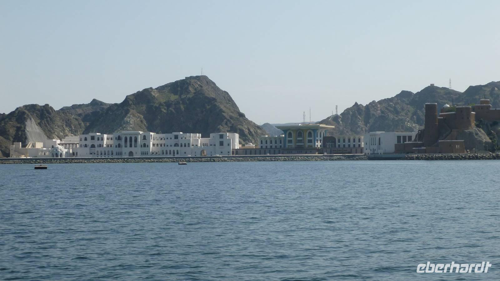 Wir wechseln die Perspektive: jetzt sehen wir uns Muscat von der Seeseite aus an. Mit einer traditionellen Dhau fahren wir die Felsenküste entlang, mit Blick auf die Bucht von Muttrah, Old Muscat und Al Bustan.