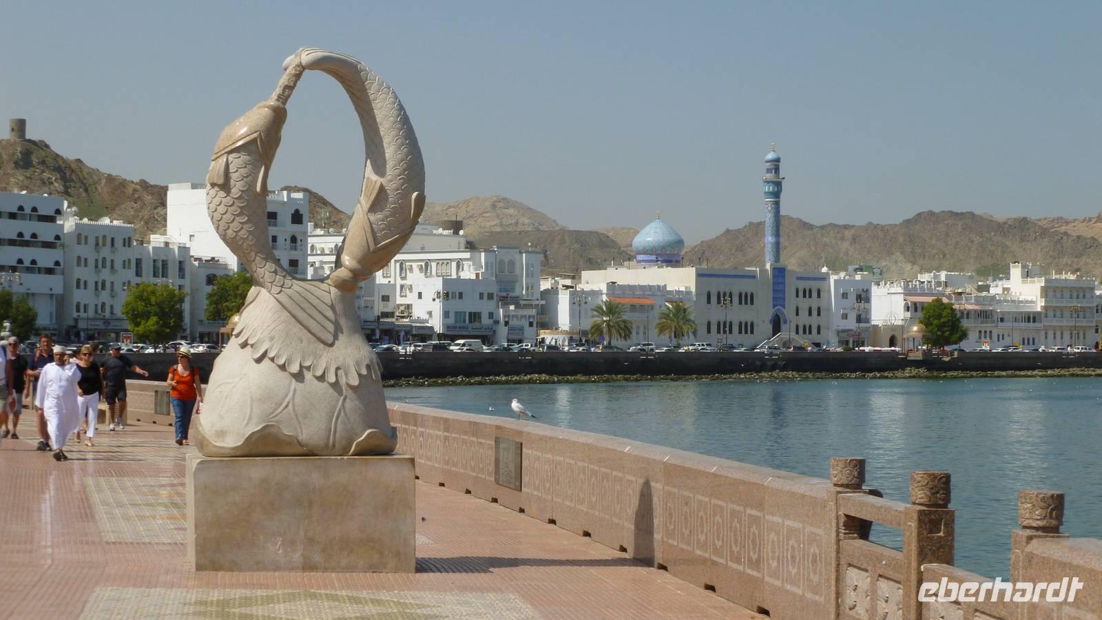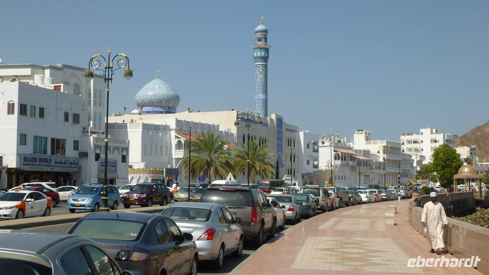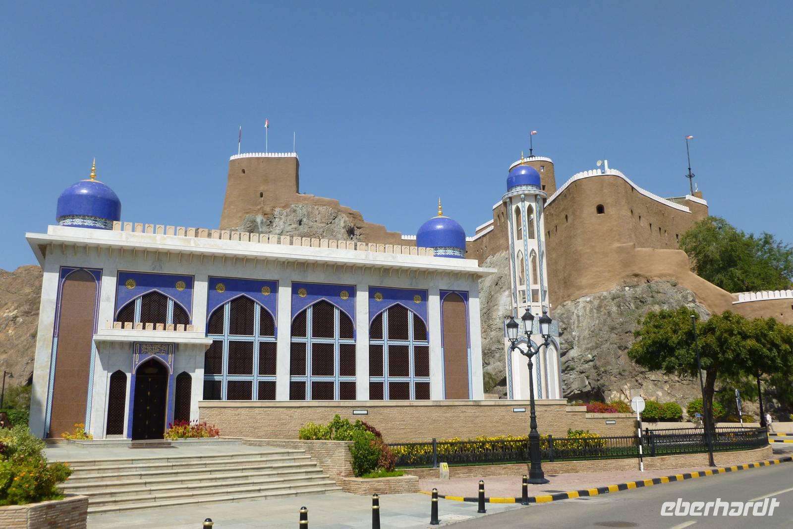 Ein Spaziergang im alten Muscat führt uns zum Alam-Palast. Sultan Qaboos, mit 43 Dienstjahren der älteste arabische Herrscher, lies in den 1970er Jahren den Alam-Palast bauen (alam = arab. für Licht, Zeichen). Von hier aus sollte ein Zeichen für die Modernisierung des Landes ausgehen. Am Fuße der früheren portugiesischen Festungen Mirani und Jalali spazieren wir durch das Palastviertel mit dem Museum Bait Al Zubair, dem einstigen Gouverneurspalast Bait Garaiza und der kleinen blauen Moschee Masjid Al Khor.