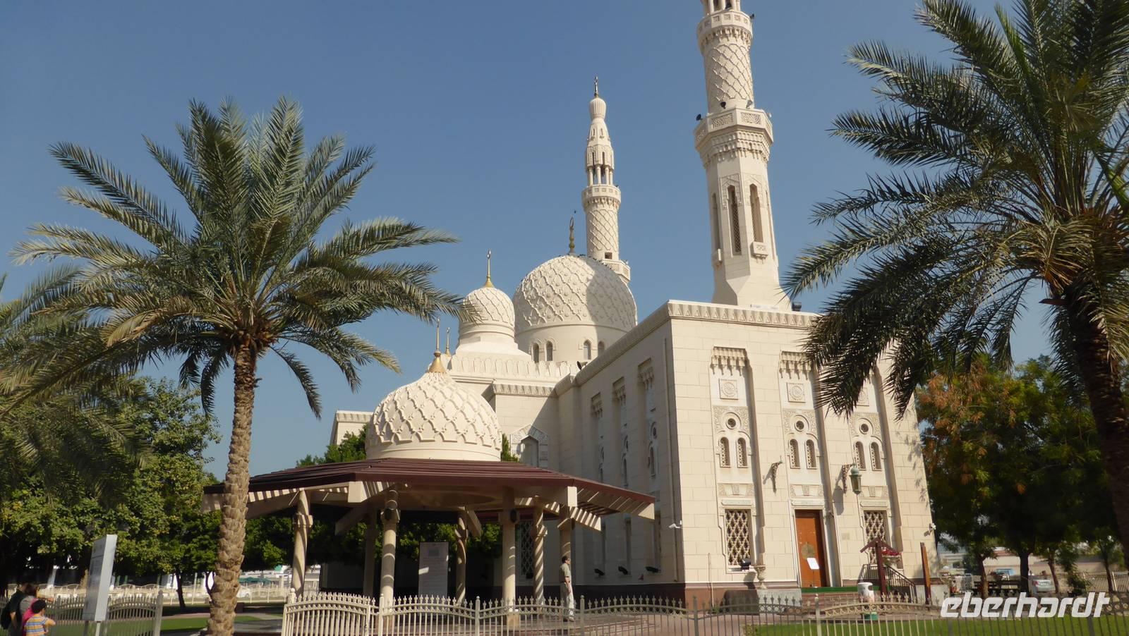Mit Ayleen, unserer Begleiterin vor Ort und unserem Busfahrer Zayed aus Pakistan beginnen wir unsere Stadtrundfahrt ins moderne Dubai. Zunächst halten wir an der Jumairah Moschee und dem 7-Sterne Hotel Burj Al Arab am Strand von Jumairah.