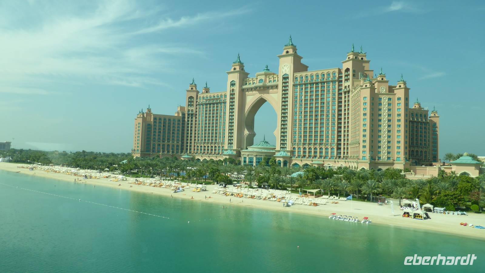 In der Ferne kann man schon Palm Jumairah erkennen, die größte künstliche Insel der Welt. Mit der Hochbahn, Monorail genannt, fahren wir auf dem Palmenstamm auf das Atlantis-Hotel zu. Das Atlantishotel ist mit ca. 1.500 Betten das zweitgrößte Hotel Dubais. Von hier aus haben wir Aussicht auf den Wassererlebnispark mit seinen vielen Rutschen. Beim Verlassen von Palm Jumairah passieren wir einen riesigen Kreisverkehr. Hier entsteht Dubai Pearl, ein ganzer Stadtteil, entworfen von einem Hamburger Architekten.