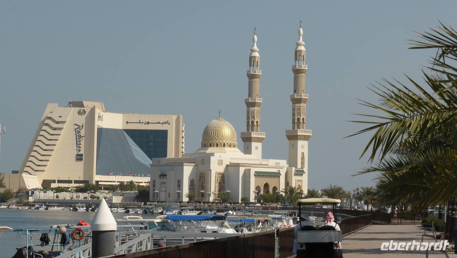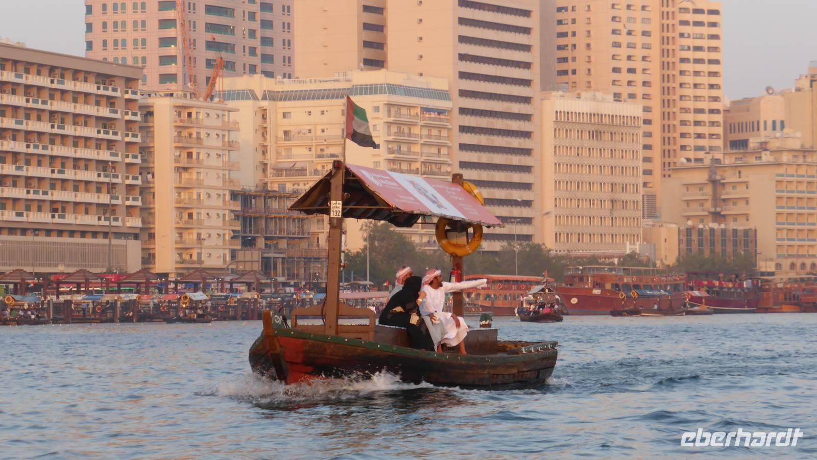 Die Lagune Dubais, Creek genannt, ist ein etwa 11 Kilometer langer Meeresarm, welcher wie ein Fluss das alte Dubai in die Stadtviertel Bur Dubai (unsere Hotelseite) und Deira teilt. Hier liegen die alten Märkte, die Souks mit Gewürzen, Stoffen und Goldgeschäften. Abras nennt man hier die Wassertaxis. Nachdem wir den Gewürz- und Goldmarkt besichtigt haben, unternehmen mit einer Abra eine längere Fahrt auf dem Creek. In der Atmosphäre des Abendlichtes ist das ein wunderschöner Tagesabschluss. Etwas müde und mit vielen vielen Eindrücken fallen wir ins Bett...