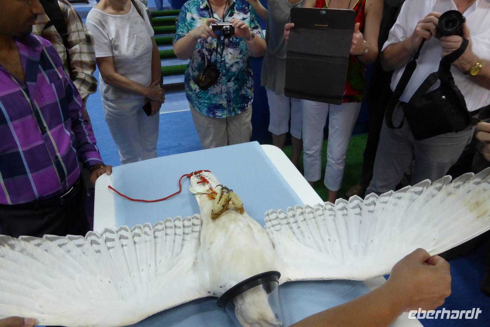 Innerhalb von knapp 2 Stunden erreichen wir am Vormittag Abu Dhabi. Frau Dr. Müller, die Chefin der Falkenklinik Abu Dhabi hat aufgrund des großen Interesses die Klinik für Besucher geöffnet. Ihre Mitarbeiter Hassan und Raji führen uns durch die weltgrößte Einrichtung dieser Art. Wir erleben wie Schnäbel geschliffen und Krallen geschnitten werden und erfahren mehr über Mauser, Jagd- und Brutsaison der Falken. Jeder von uns hat die Möglichkeit, einen Falken mal selbst auf dem Arm zu tragen.