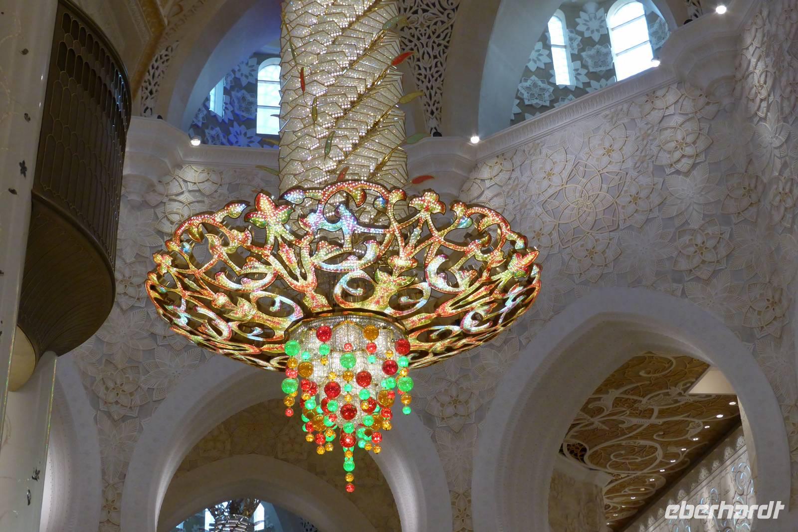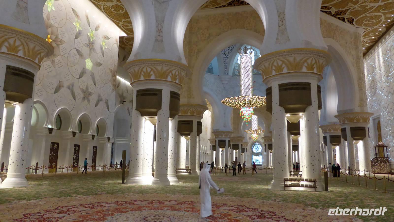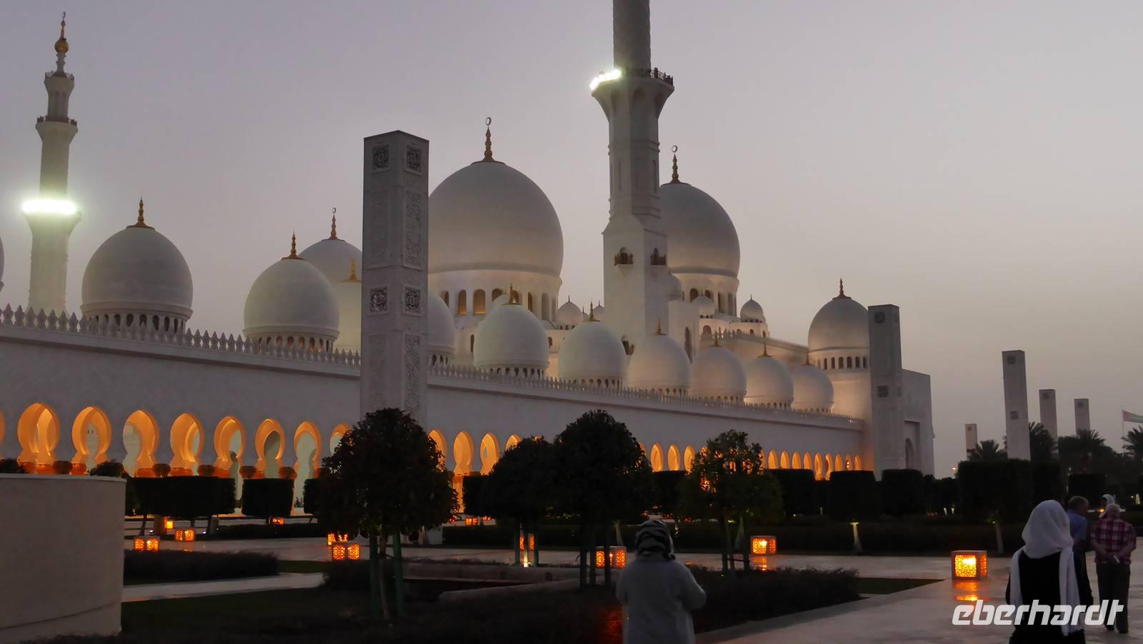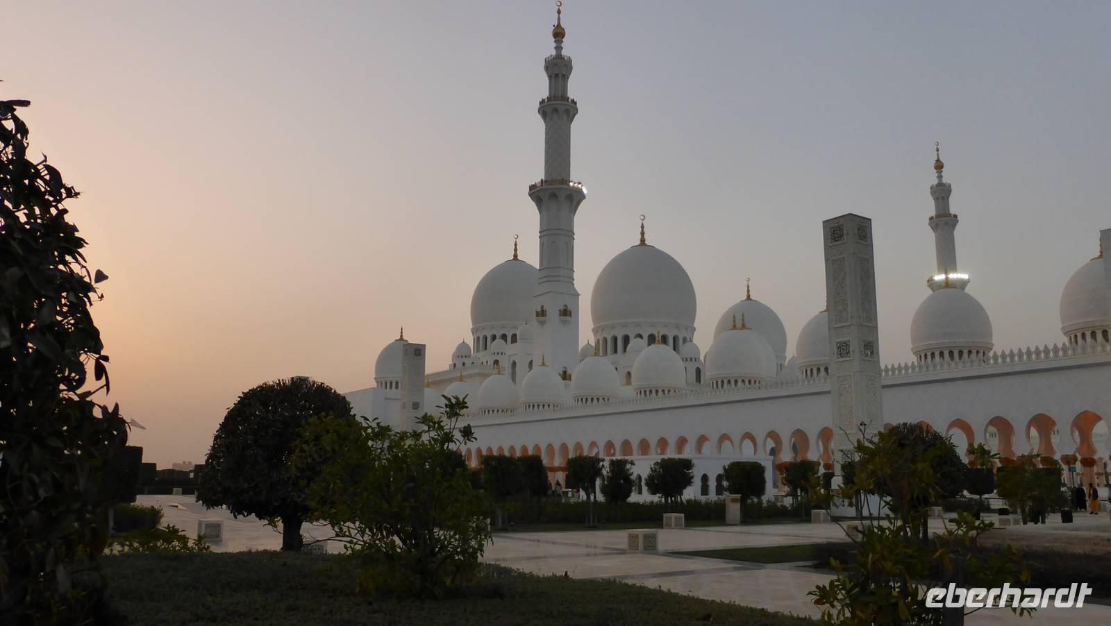 Ich nenne sie gern den „Taj Mahal Arabiens", die Shaikh Zayed Moschee von Abu Dhabi, der weltweit größten Moschee außerhalb der heiligen Stätten des Islam in Mekka und Medina. Hier haben ca. 40.000 Muslime Platz für das Gebet. Wir besichtigen diesen Prachtbau mit seinen 82 Kuppeln, bis die Abenddämmerung eine ganz besondere Stimmung hervorbringt und der Muezzin zum Abendgebet ruft. Für uns Zeit, die Rückfahrt nach Dubai anzutreten.