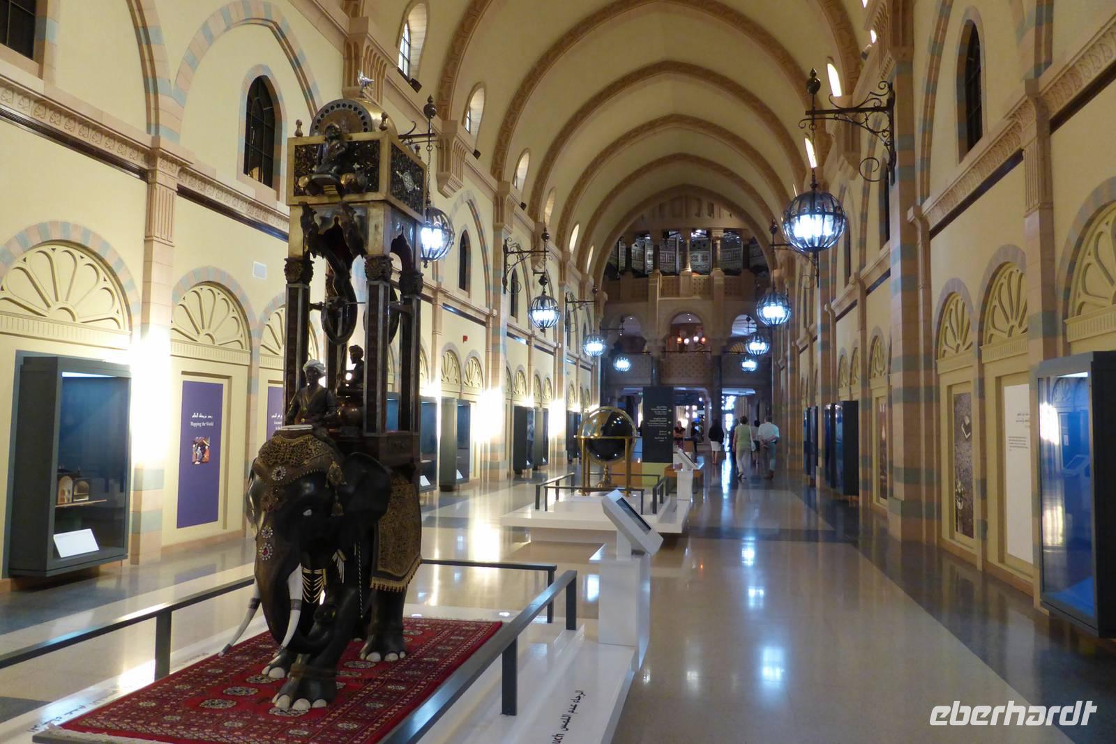 Heute Vormittag reisen wir ins Nachbaremirat Sharjah. Shaikh Dr. Al Quasimi, der Herrscher von Sharjah, ist Kunstliebhaber und leidenschaftlicher Sammler. Er prägte maßgeblich die neoarabische Architektur in seinem Emirat. Beispiele davon fotografieren wir am Koran-Kreisverkehr mit der Bibliothek, dem Kulturpalast und Regierungsgebäuden. Zusätzlich zu unserem Besichtigungsprogramm besuchen wir das Museum für Islamische Zivilisation, welches neben jenem in Doha zu den führenden seiner Art in der Golfregion zählt. Das Museum befindet sich in einem früheren Marktgebäude, dem Souk Al Majarrah und präsentiert bemerkenswerte Exponate aus der islamischen Welt. Darunter ein sogenannter sitara, ein mit Gold- und Silberfäden bestickter Vorhang, welcher einst die Tür der Kaaba im heiligen Mekka bedeckte. Auch die Abteilung zu Naturwissenschaften, Astronomie, Medizin und Architektur ist sehr bemerkenswert.