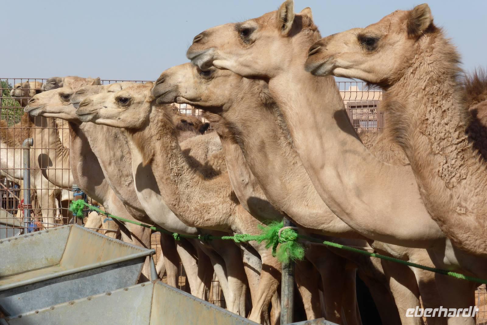 Nach unserer Mittagspause in der Bawadi-Mall, in der es angenehm ruhig zugeht, widmen wir uns dem Kamelmarkt von Al Ain. Einst waren Kamele die wichtigsten Begleiter der Beduinen und sicherten ihnen das Überleben in der Wüste. Hier auf dem größten Markt dieser Art im Land werden sie als Nutztier für die Milch- und Fleischgewinnung zum Verkauf angeboten. Auch aus anderen Ländern sind hier Kamele zu finden: eine kleine Rasse stammt aus dem Oman, schwarze Kamele aus Saudi Arabien und weiße aus dem Sudan.