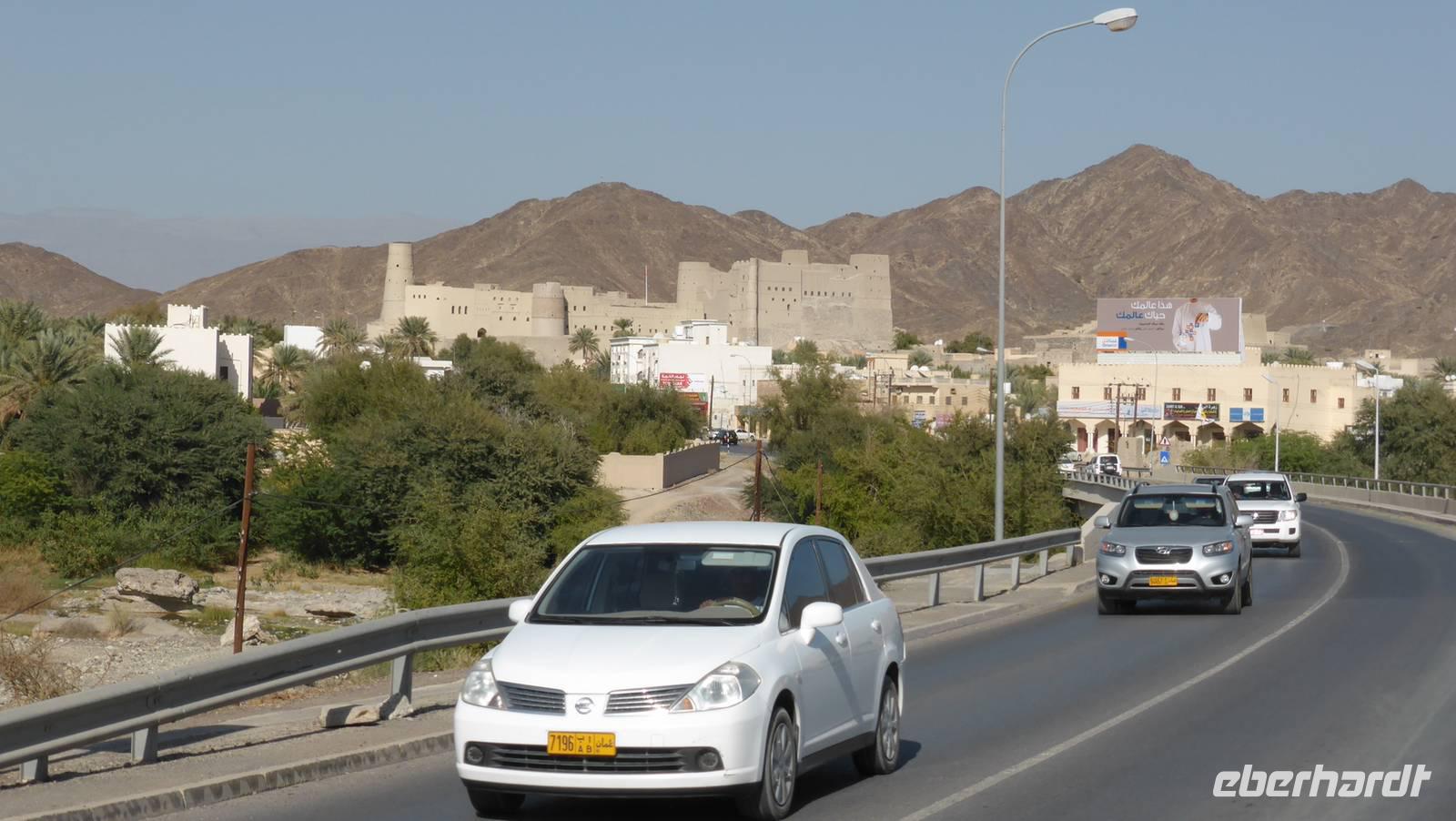 Die mächtige Festung im Stadtzentrum bietet einen prächtigen Ausblick auf Nizwa und auf die umliegenden Berge. Mit ihrem großen Rundturm, einmalig im Oman, bietet sie ein beliebtes Fotomotiv. Wir wollen mit unseren Allradfahrzeugen weiter Richtung Berge. Dafür müssen wir uns zunächst aus dem Getümmel der Stadt befreien. Auch die Omanis wollen jetzt schnell los, denn Freitagmittag steht das wichtigste Gebet der Woche an.
