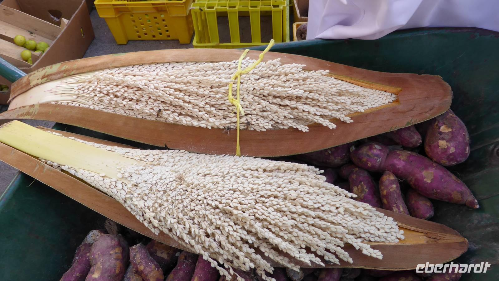 An diesem Vormittag ist die ganze Altstadt von Nizwa ein großer Markt mit Vieh, Obst, Gemüse, Gewürzen, Töpfer- und Silberwaren... und einer Besonderheit: an einem Stand werden Dattelblüten der männlichen Dattelpalme verkauft. Sie nutzt man zum Bestäuben der weiblichen Dattelpalmen.