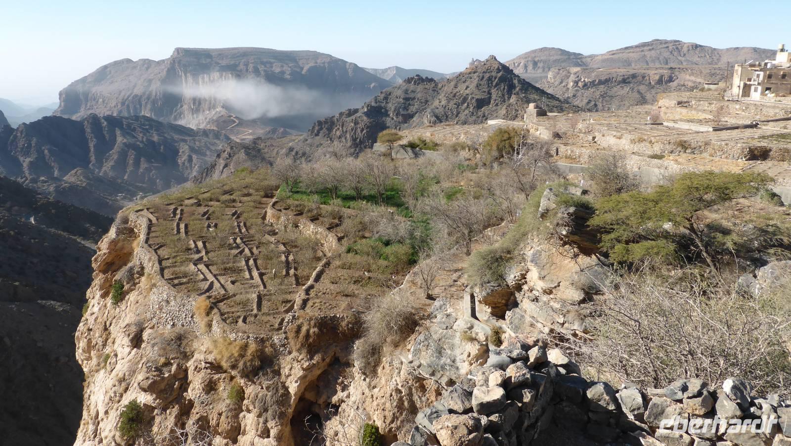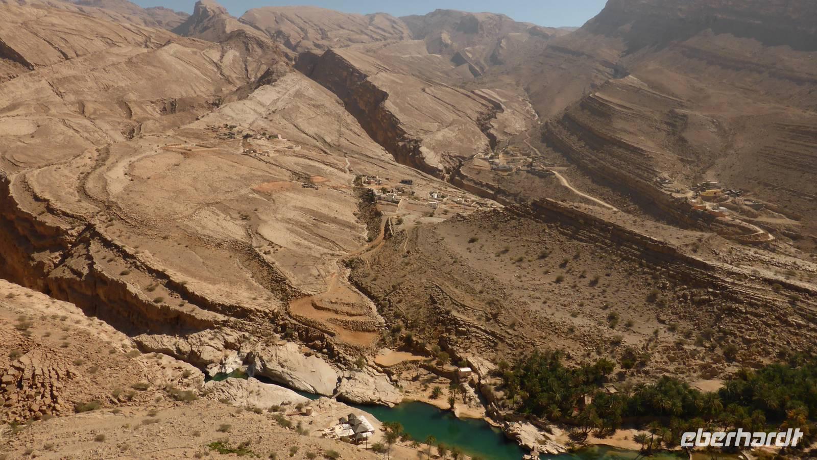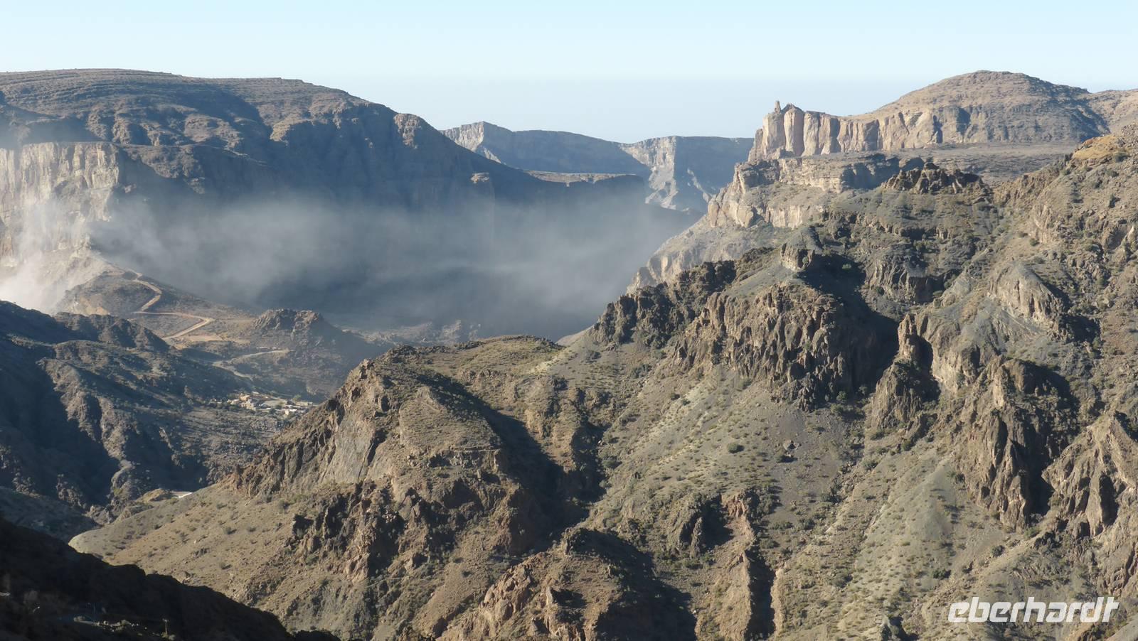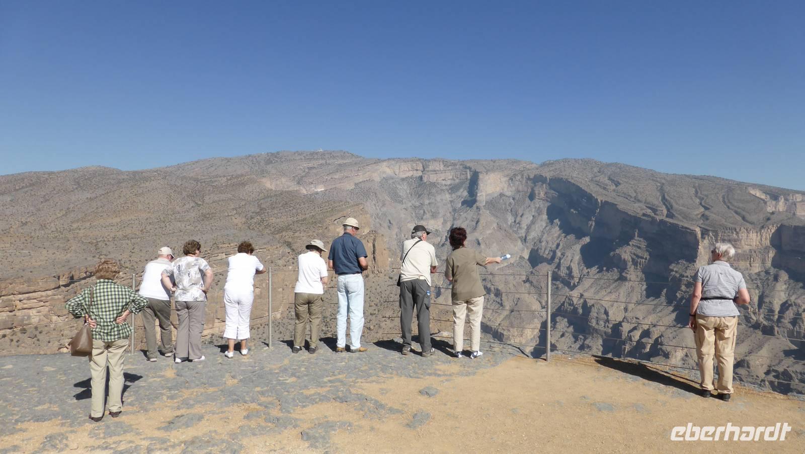 Wir sind jetzt im Bergdorf Misfat Al Abreen angekommen. Mit seiner Hanglage, Terrassenfeldern, engen Gassen und den Aflaj (Wasserkanälen) übt es einen ganz besonderen Reiz aus und lädt zu Wanderungen ein. Teil unseres Rundganges ist das Laufen auf dem schmalen Rand des Falaj (Wasserkanal), was etwas Überwindung braucht, aber uns dafür mit schönen Eindrücken entschädigt. Nach einem kleinen Picknick mit Laban (Trinkjoghurt), Samosas, Datteln und Gebäck ist der Grand Canyon von Oman unser nächstes Ziel. Durch das Wadi Ghul (Fotostopp gegenüber dem Dorf Ghul) steigen wir mit unseren Jeeps auf das Hochplateau. Diese riesige Schlucht als „Grand Canyon" zu bezeichnen ist nicht übertrieben, denn fast 1000 Meter geht es hier senkrecht nach unten. Von hier aus kann man auch gut den Jebel Shams, mit 3009 Meter höchster Berg des Oman, erkennen.