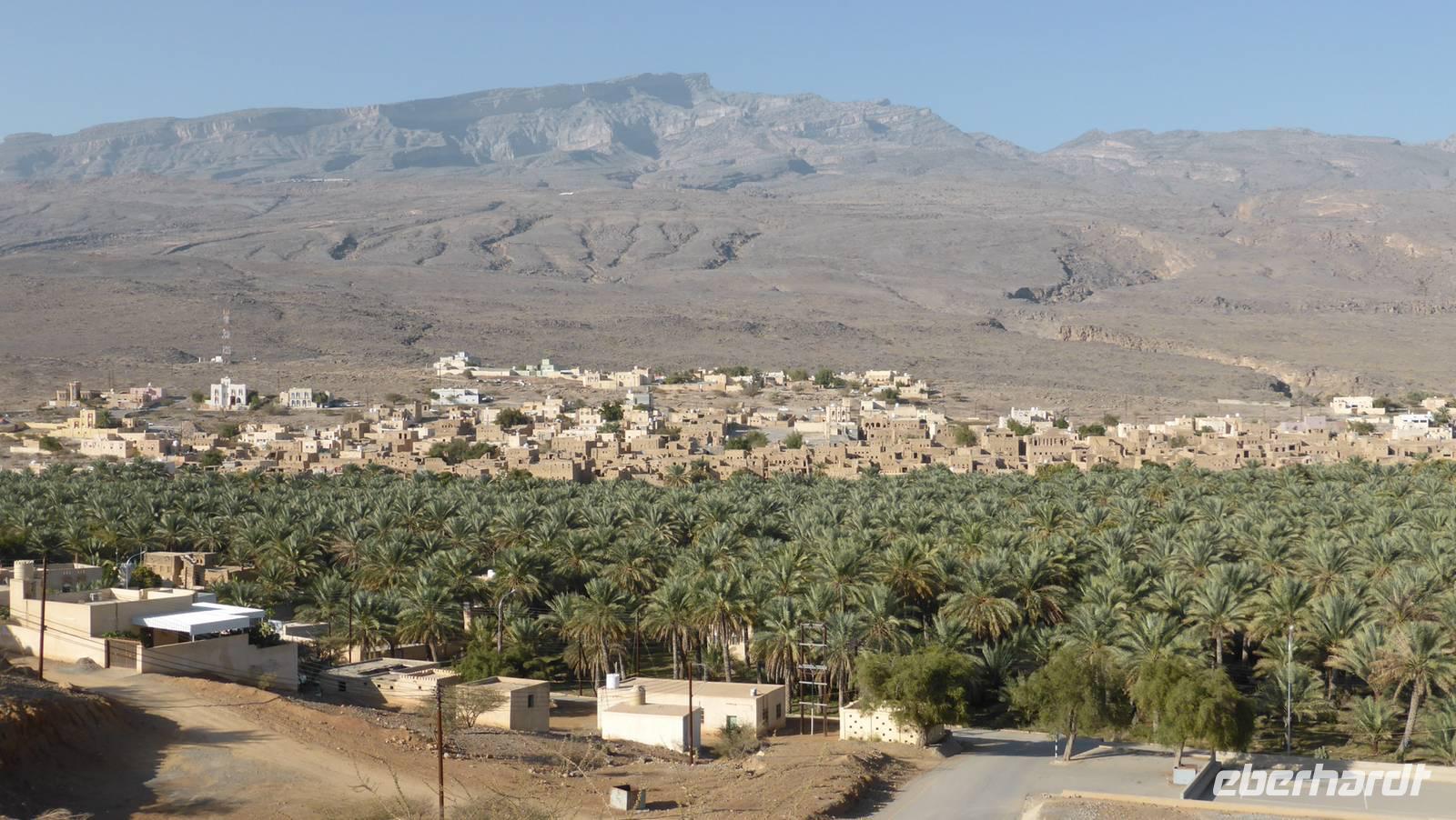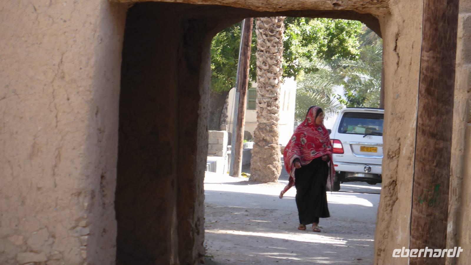 Unser Tagesausflug endet am Nachmittag mit einem kleinen Spaziergang durch die Oase und die Gassen von Al Hamra („Die Rote"), ein malerisches Lehmdorf am Fuße der Berge.