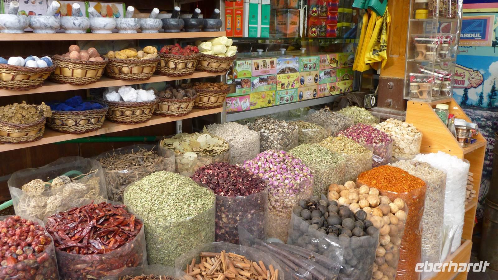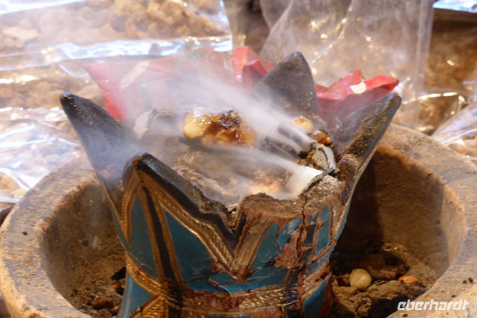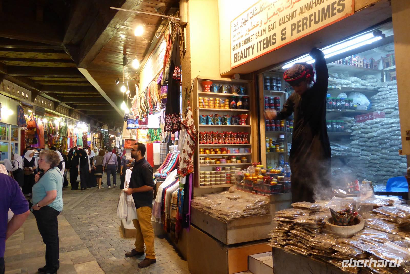 Im Stadtteil Muttrah bummeln wir durch den überdachten Markt, den Souk. Hier duftet es nach Gewürzen und Weihrauch. Am Ende des Souks befinden sich Weihrauchstände, an denen dunkelhäutige Frauen aus Salalah (Südoman) ihre Duftharzmischungen verkaufen.