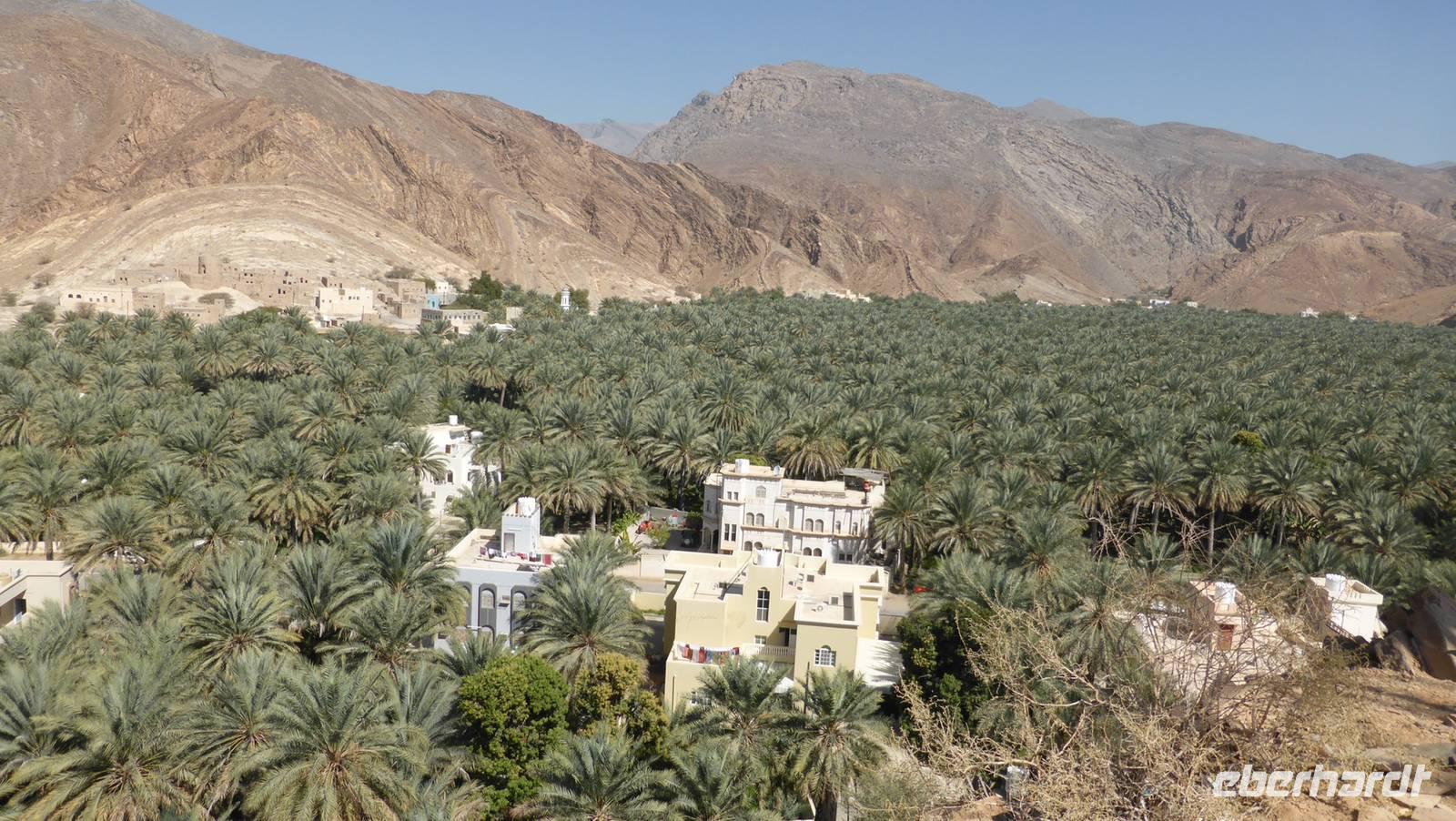 Nach einer Pause im Sahab Berghotel kehren wir zurück in die Ebene. In der Oase Birkat Al Mauz bummeln wir, dieses Mal ohne Wasserkanal, durch den Palmengarten.