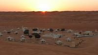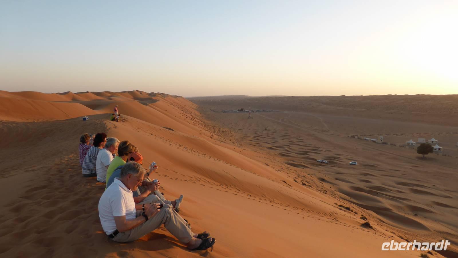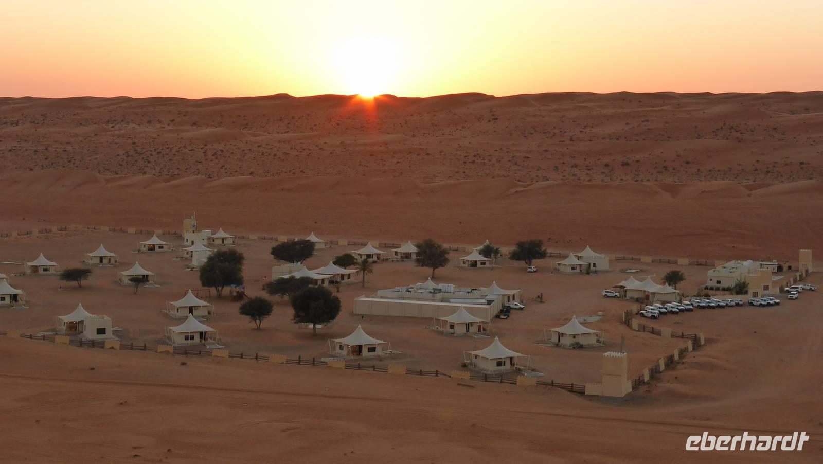 Ein paar Dünen weiter geht unser Tag im Wüstencamp „Desert Nights Camp" mit einem romantischen Sonnenuntergang zu Ende.