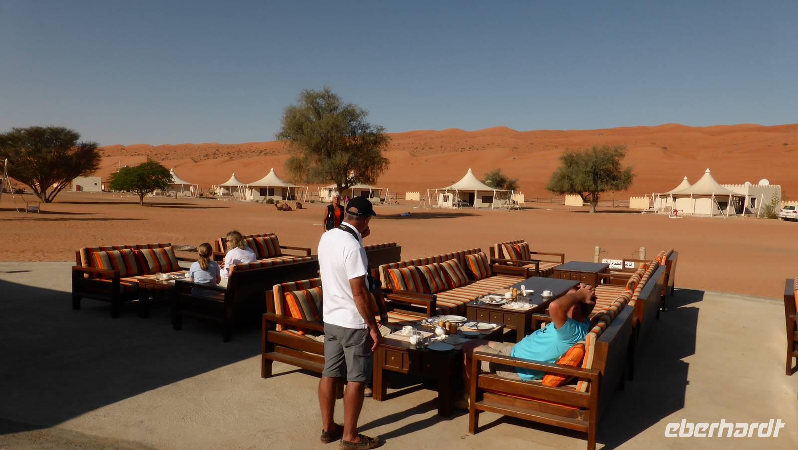 Wir beginnen den Tag mit einem Frühstück in der Morgensonne auf der Terrasse unseres luxuriösen Wüstencamps. Das Morgenlicht lässt das rötlich schimmernde Sandmeer erstrahlen. Dann ziehen wir weiter, verlassen die Wahiba Sands und wenden uns den nah gelegenen Bergen zu. Bei einem Zwischenstopp unterhalte ich mich mit einem unserer Jeepfahrer. Dabei erfahre ich Erstaunliches: Hauptberuflich ist er im Diwan des Sultans angestellt, arbeitet im Gestüt und ist als Pferdejockey bei internationalen Rennen zum Beispiel in Europa dabei. Der Sultan ist ein großer Pferdeliebhaber und hat in Maskat und Salalah zwei große Gestüte.