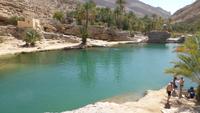 Am Morgen kaufen wir in Sur noch unser Picknick ein und folgen dann der Küstenstraße in Richtung Maskat. Wir passieren die Erdgasverflüssigungsanlage von Sur und die Ruinen des alten Qalhat. Das Wadi Tiwi ist ein tief in die Berge eingeschnittenes Seitental, durch welches sich ein grünes Band aus Dattelpalmen und Gärten zieht. Die perfekte Kulisse für unseren Spaziergang - ohne Balanceakte auf dem Wasserkanal. Ein paar Fahrminuten weiter halten wir am Wadi Shab, eine weitere grüne Schlucht mit einem Süßwassersee.