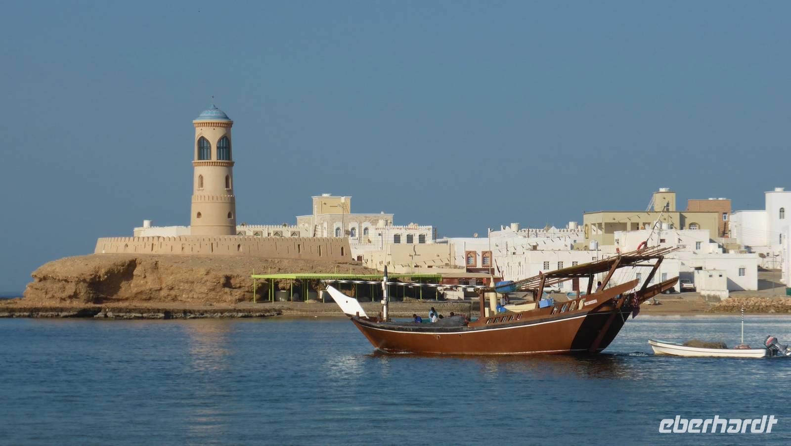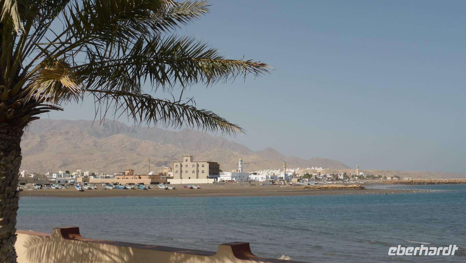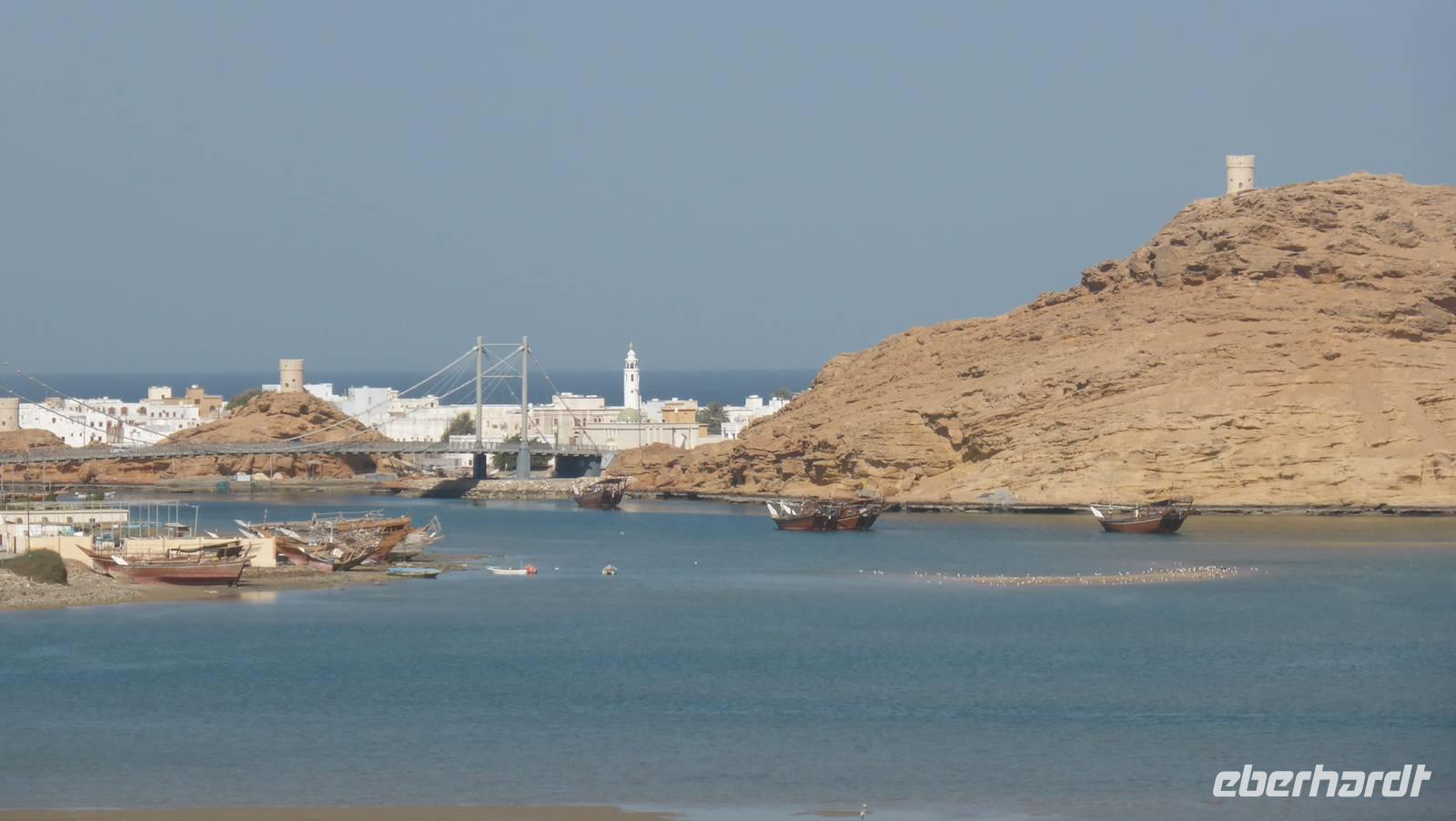 Am Nachmittag erreichen wir die Küstenstadt Sur. Von einem Aussichtspunkt haben wir einen weiten Blick über die Lagunenstadt am Indischen Ozean. Die Lagune bietet den Dhaus, den traditionellen Holzschiffen, einen perfekten natürlichen Hafen. In der kleinen Werft an der Lagune überzeugen wir uns, wie noch heute Dhaus gebaut werden. Es ist einer der wenigen Orte auf der Arabischen Halbinsel wo man dieses Handwerk noch ausübt.