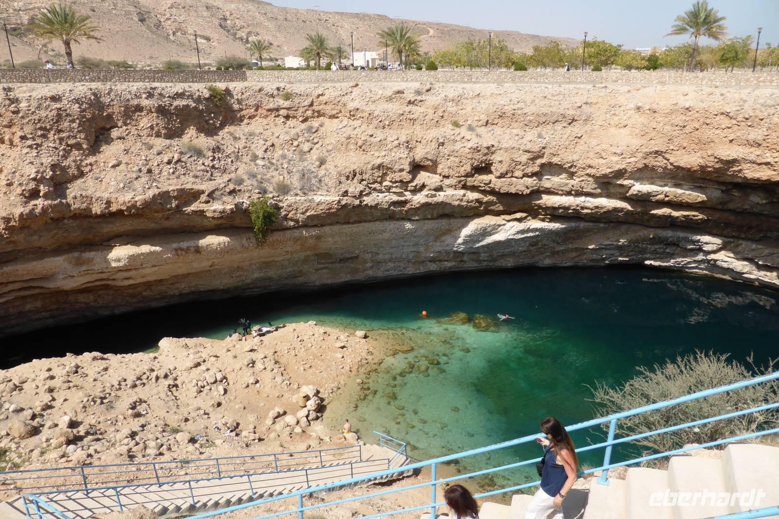 Als wir in der Küstenstadt Barka ankommen, findet auf dem Fischmarkt gerade eine Auktion statt. Hier und an vielen anderen Ständen unter dem Schattendach werden frisch gefangene Thunfische, Sardinen und Königsmakrelen verkauft. Anschließend verlassen wir die Küste und reisen zur Oase Nakhl im Hinterland. Die hiesige Festung erhebt sich auf einem ca. 60 Meter hohen Felsen über der Dattelpalmoase und bietet uns einen einmaligen Ausblick auf tausende von Palmen und die naheliegenden Berge. In dieser Oase befindet sich eine heiße Quelle, Ain Al Thowarah genannt. Ein idealer Platz für unser Picknick. Wer hier seine Füße in das Wasser hält, bekommt von den Fischen eine Pediküre gratis, nur kitzlich sollte man nicht sein .