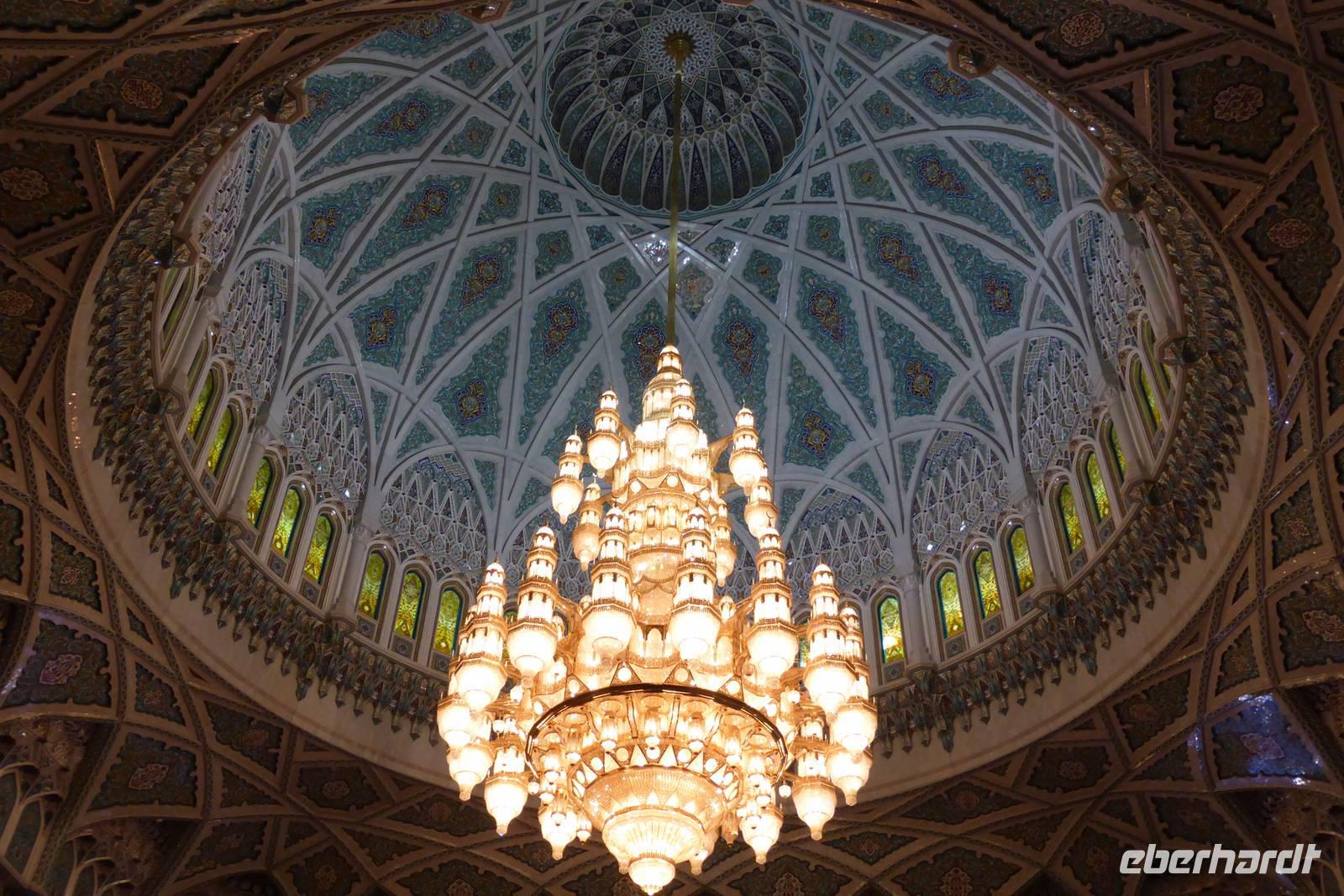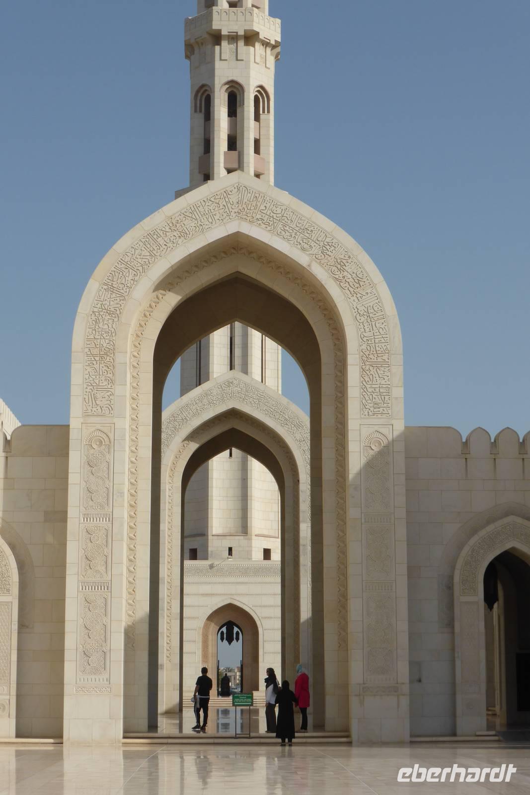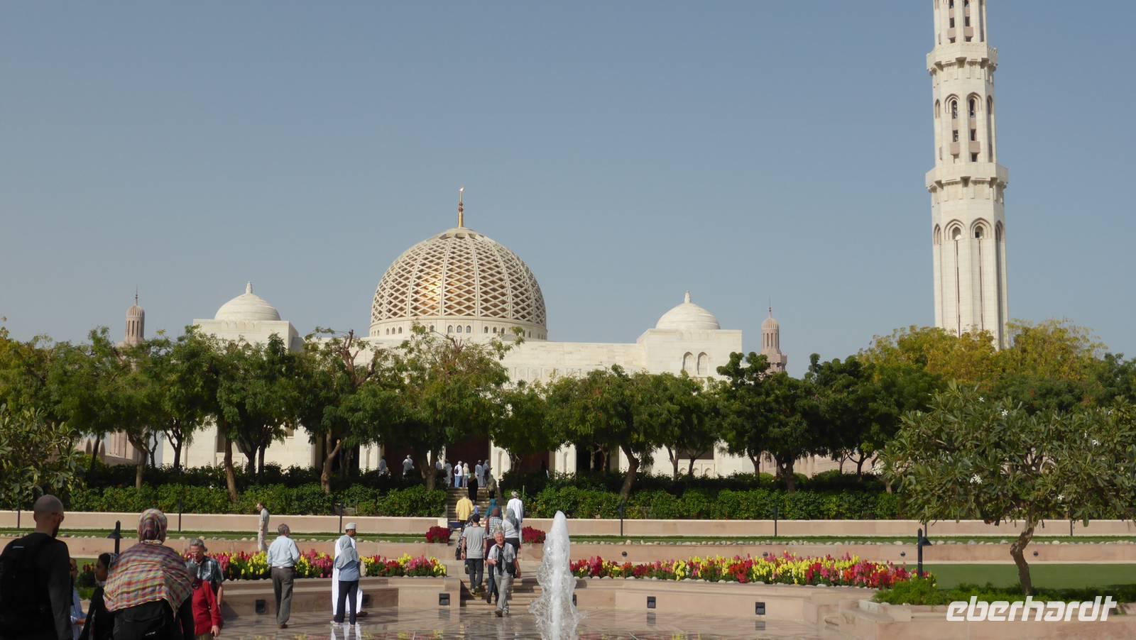 Gegen 8.00 Uhr am Morgen betreten wir die Große Sultan Qaboos Moschee. Die einzige Moschee des Landes, welche für Nichtmuslime zugänglich ist. Uns empfängt ein grüner blühender Garten mit Wasserbächen, der an das Paradies erinnern soll, welches den frommen Muslim erwartet. Die mächtige Moscheekuppel, Marmorböden und der indische Sandstein des Moscheekomplexes strahlen in der Morgensonne. Die Pracht der Hauptgebetshalle mit seinen Leuchtern aus Swarowskikristallen, dem Perserteppich und den azurblauen Fayencen der Gebetsnische können wir heute Morgen noch ganz für uns allein genießen. Weitere interessante Besichtigungspunkte sind die Bibliothek, die Frauengebetshalle und das Islaminformationszentrum. Hier werden wir überaus freundlich von Naima mit Kaffee und Datteln begrüßt und stolz berichtet sie von den Rechten der Frauen im Oman.