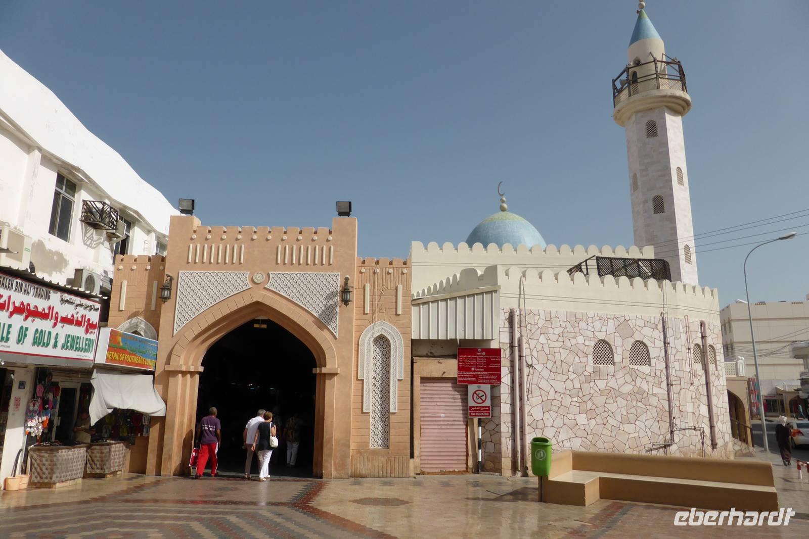 Auf dem Wochenmarkt in Nizwa herrscht ein reges Treiben, denn es ist Freitagmorgen, das Wochenende steht vor der Tür. Es sind Bilder wie aus 1001 Nacht: auf einem von Dattelpalmen beschatteten Platz gleich neben der alten Stadtmauer werden Ziegen, Schafe und Rinder zum Kauf angeboten. Die Tiere werden in einem Rondell im Kreis herumgeführt. Dabei feilschen die Beteiligten um den Preis. Ein altertümliches Schauspiel wie es sich seit Jahrhunderten abspielt. Frauen tragen nach alter Beduinentradition eine Gesichtsmaske, die älteren Männer machen ein Schwätzchen im Schatten, Ziegen meckern, Händler rufen Zahlen... Es ist wie ein Film, der vor unseren Augen läuft und man könnte hier Stunden einfach nur zuschauen.
