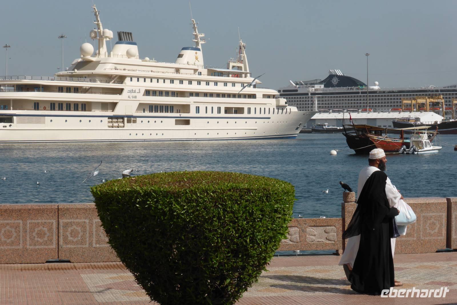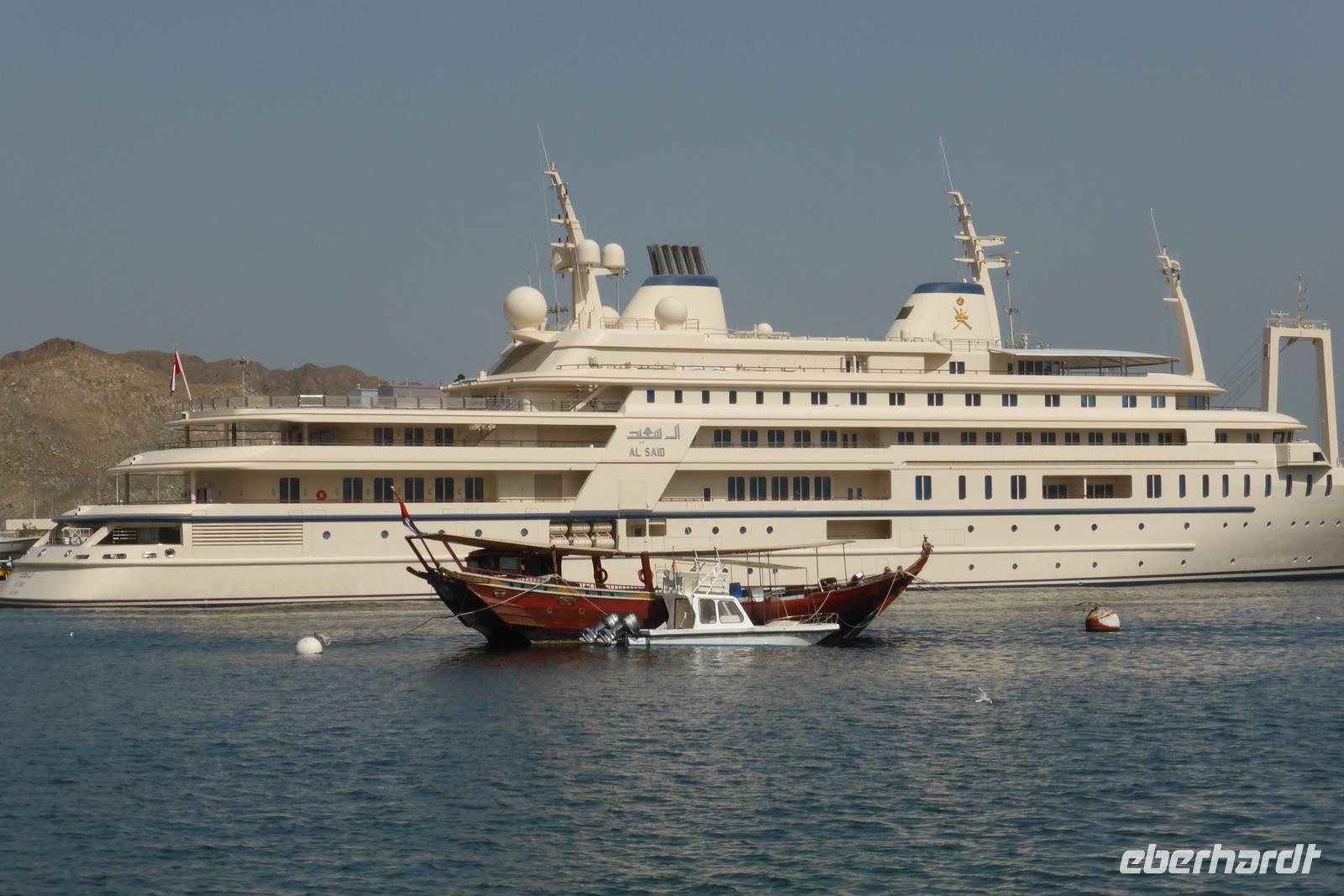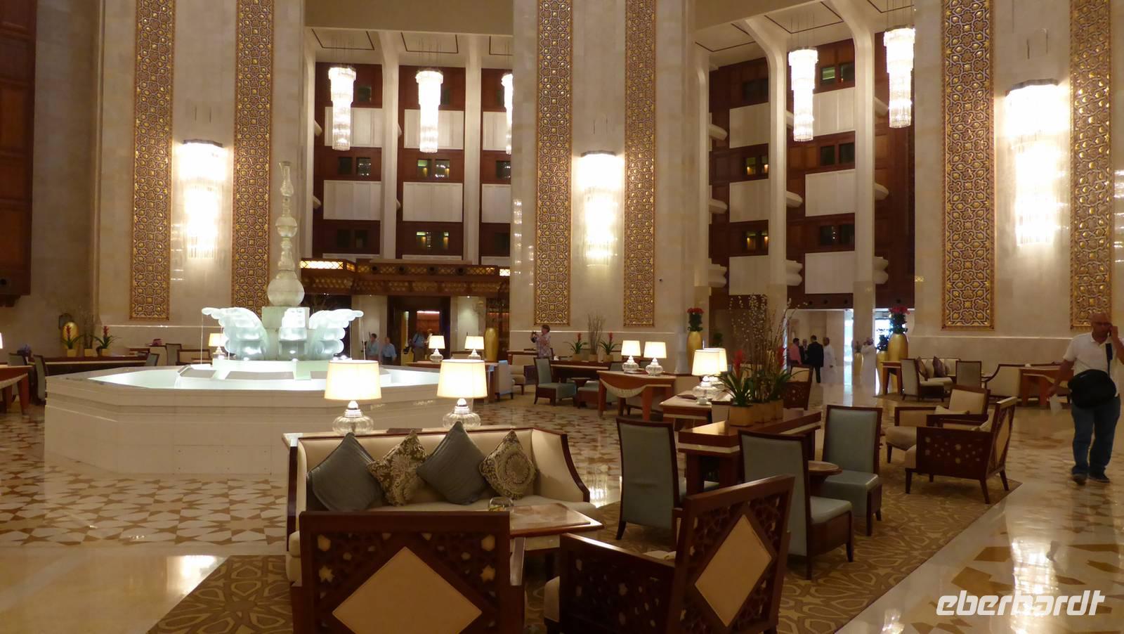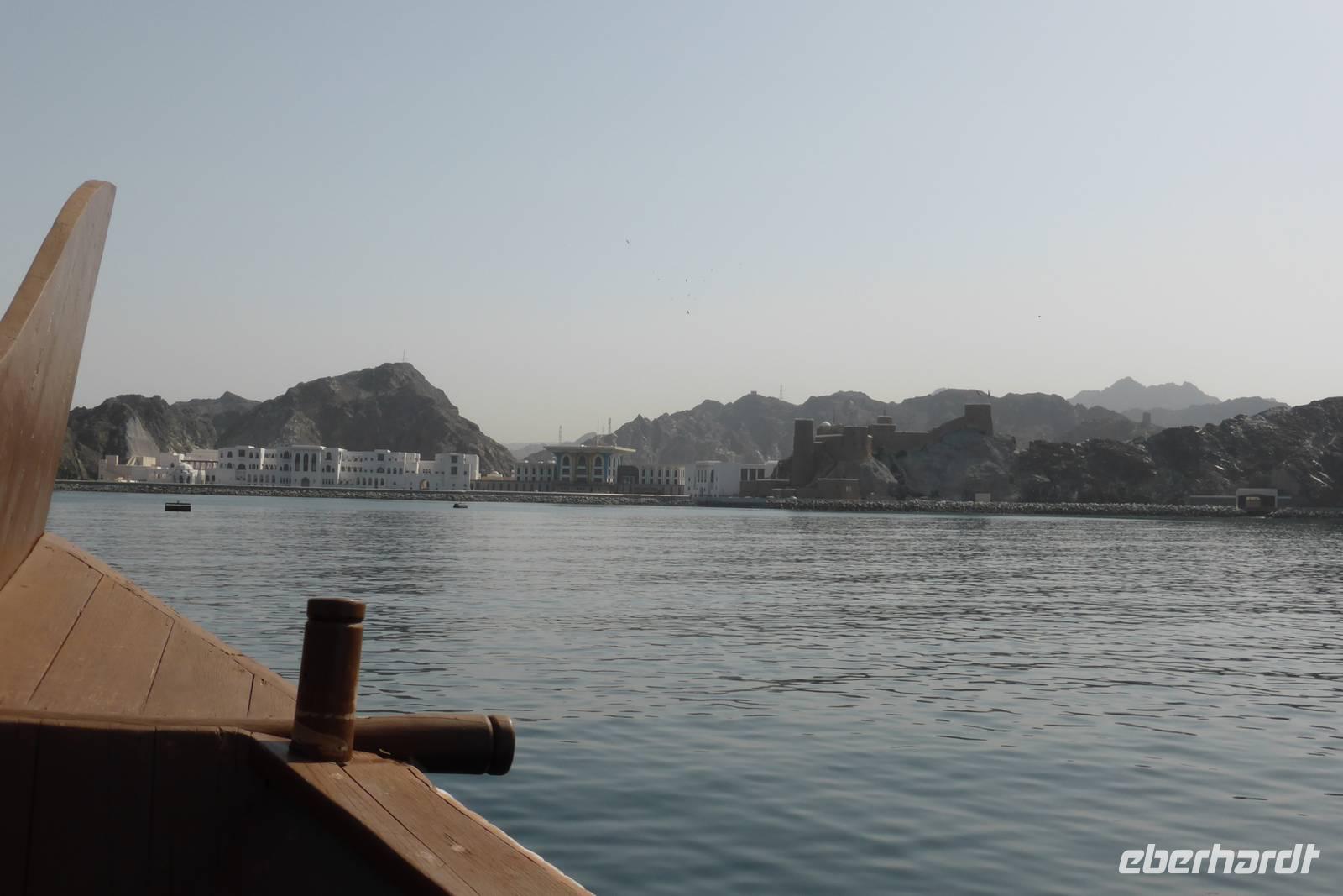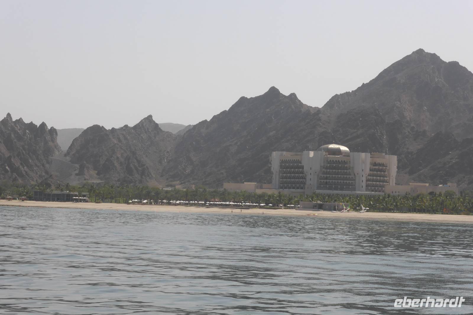 Wie eingangs beschrieben, fahren wir mit einer traditionellen Dhau entlang der Felsenküste von Maskat. Sehen so von der Seeseite bei gemütlicher Fahrt das alte Maskat, die Bucht von Muttrah und das Al Bustan Luxushotel. Als Überraschung und zum Abschluss unserer Reise habe ich für uns im Al Bustan eine Teestunde reserviert. Hier lassen wir den Tag in Ruhe ausklingen und denken noch gar nicht an unseren Heimflug in der kommenden Nacht.