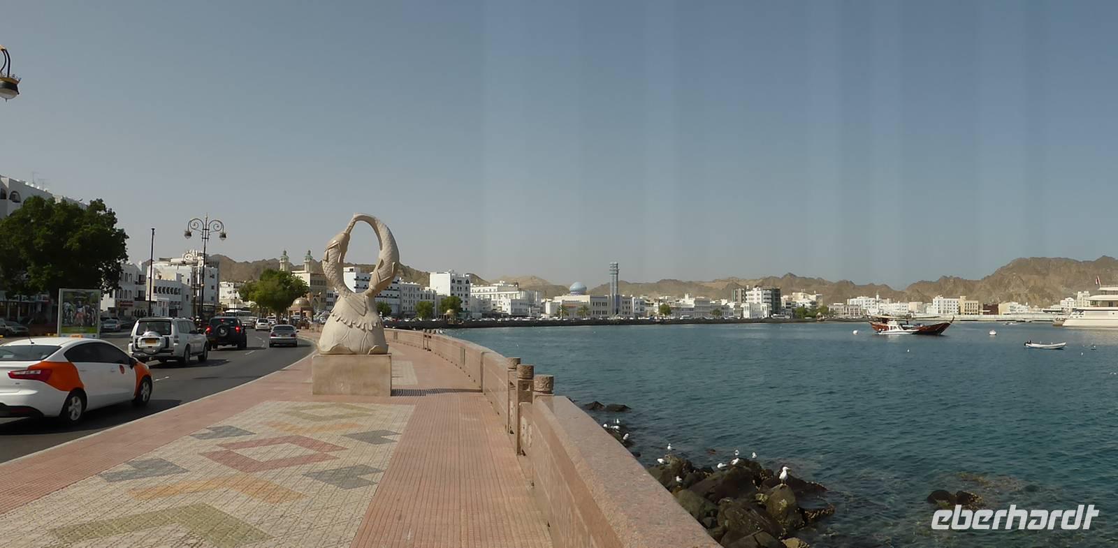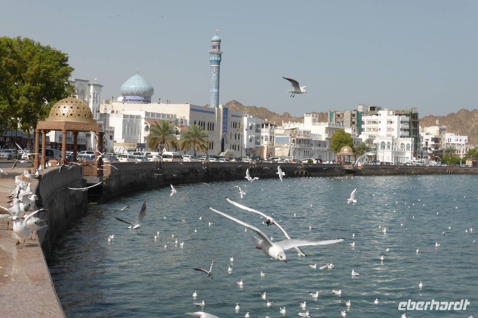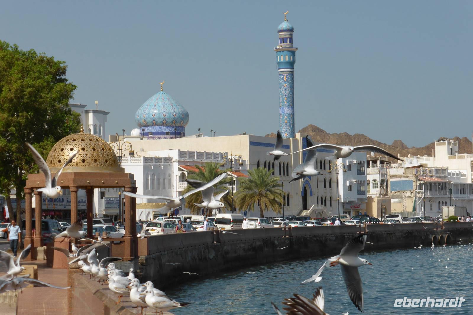 Der Marktbesuch ist auch eine gute Gelegenheit, um einen kleinen Bummel entlang der malerischen Corniche von Muttrah zu unternehmen.Im alten Maskat besuchen wir das Museum Bait Al Zubair und laufen zum Alam-Palast. Sultan Qaboos, mit 44 Dienstjahren der am längsten regierende Herrscher der arabischen Welt, lies in den 1970er Jahren den Alam-Palast bauen (alam = arab. für Zeichen). Von hier aus sollte ein Zeichen für den Aufbruch des Landes in die Moderne ausgehen. Eingerahmt von den früheren portugiesischen Festungen Jalali und Mirani bummeln wir durch den Palastbezirk mit dem einstigen Gouverneurspalast Bait Garaiza und der kleinen blauen Moschee Masjid Al Khor.